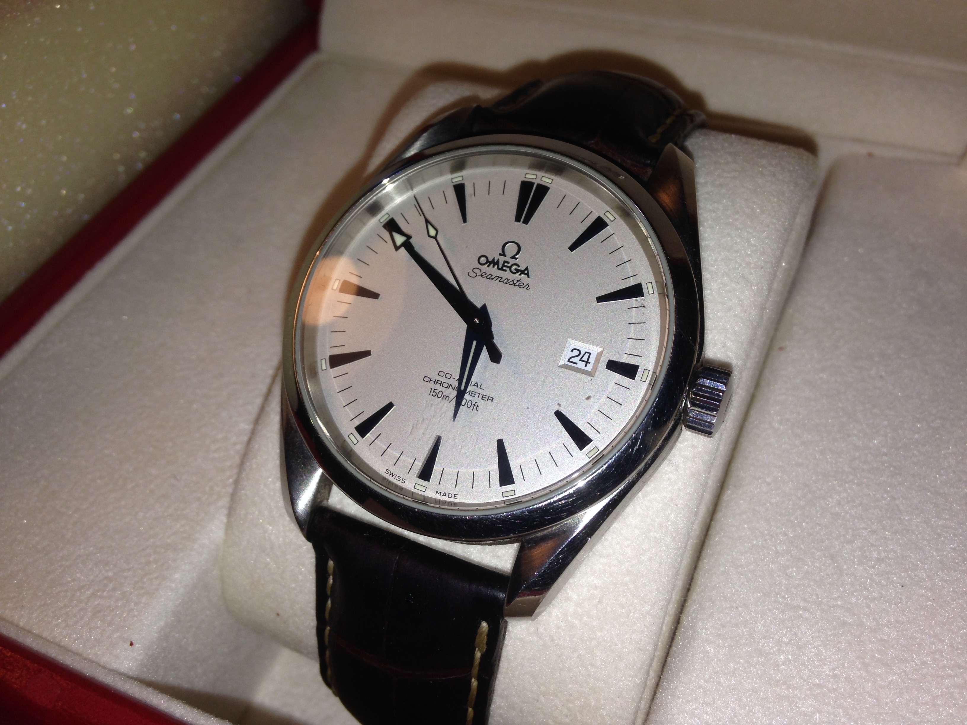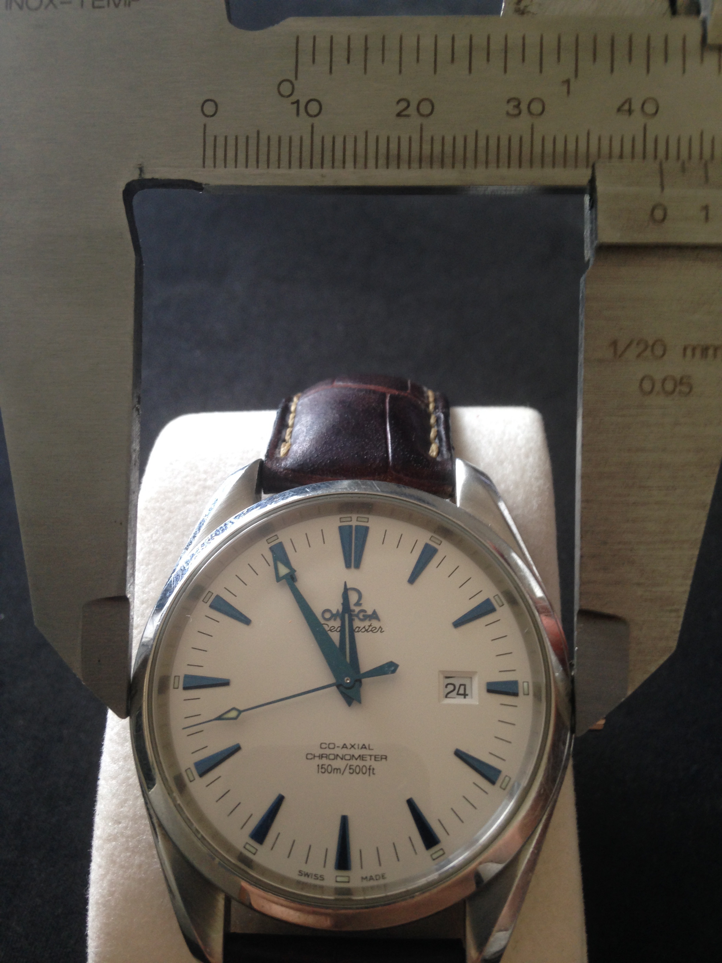 As stated, it's a 42mm, White Dial with Blue Markers' 2003 Seamaster Aqua Terra Co-Axial Chronometer, Model 28023337, Movement 2500, bought new in Lisbon December 2003.