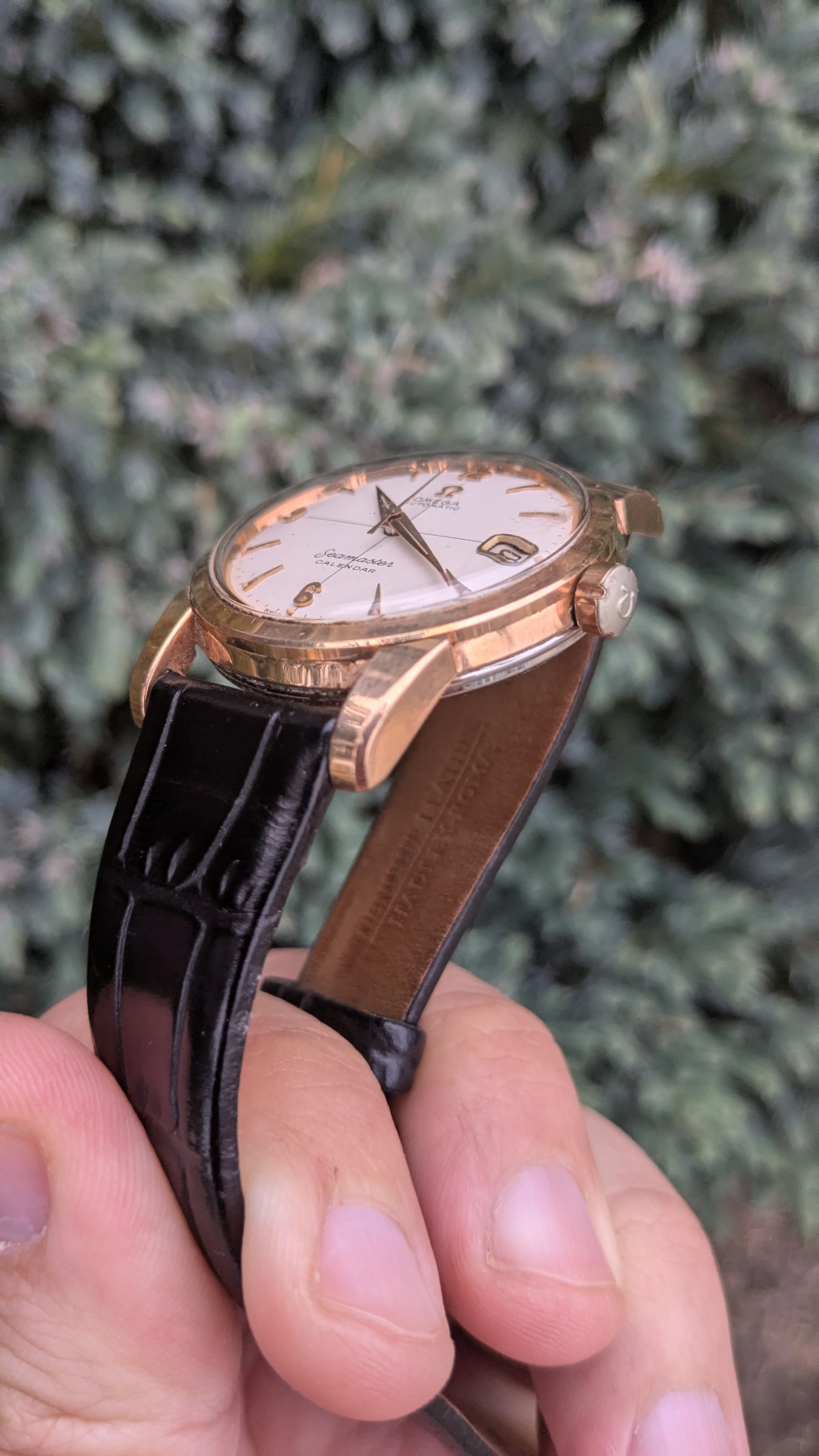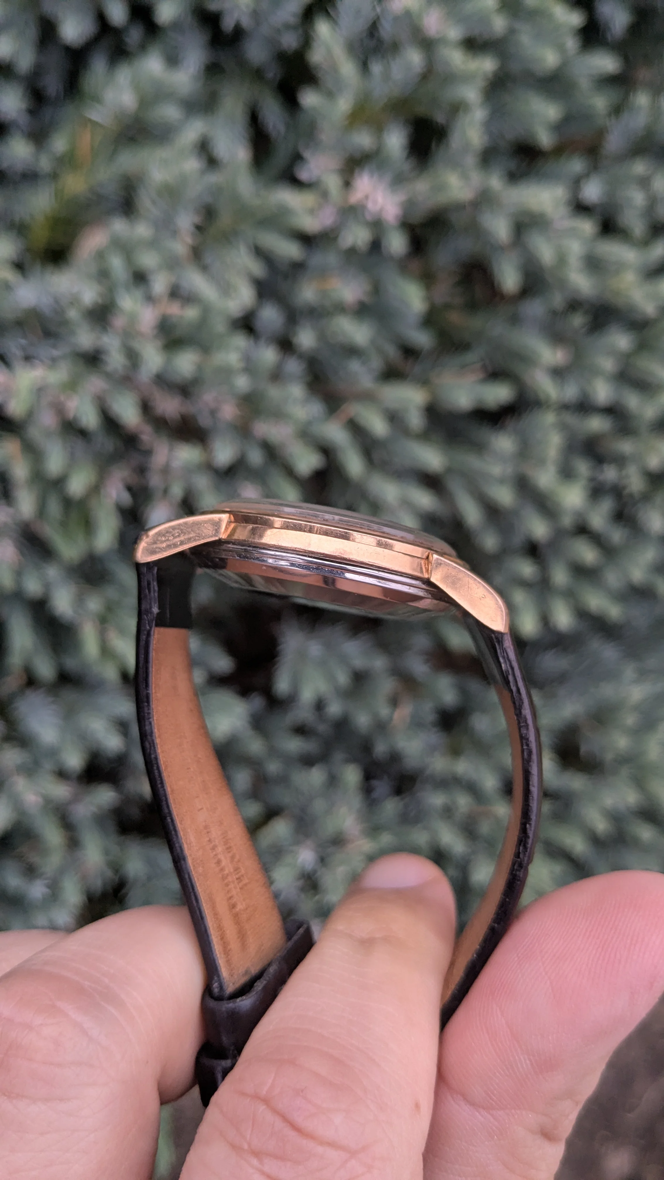 Case: 34mm SS case with intact rose gold cap. I would venture to say this has never been polished and the bevels on the lugs are sharp. The crown is also matching, but has been worn on the face of it as can be seen in pictures.