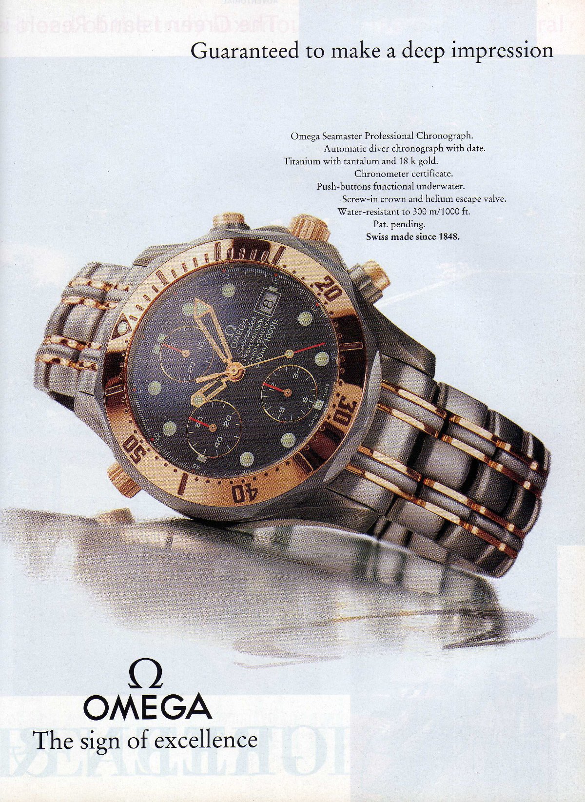 ··Ash @ ΩFA few days ago I was going through my collection of old BMW Magazine issues when I stumbled across this, from March 1994. Fair bit of a surprise as I'd never seen any advertising for the Seamaster Professional Divers Chronograph before, but this is a full page ad for the Ref. 2296.80 tri-metal TiTanRau (Titanium, Tantalum and Rose Gold) version of the modern 2225.80 that I wear on a daily basis.