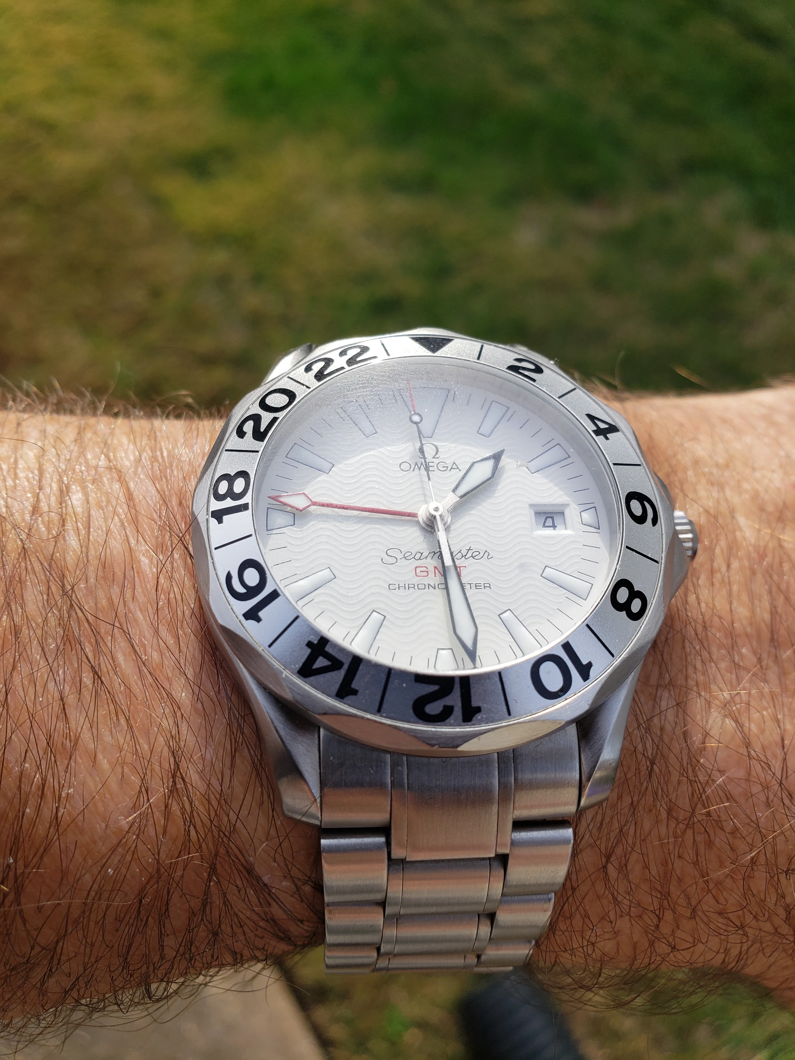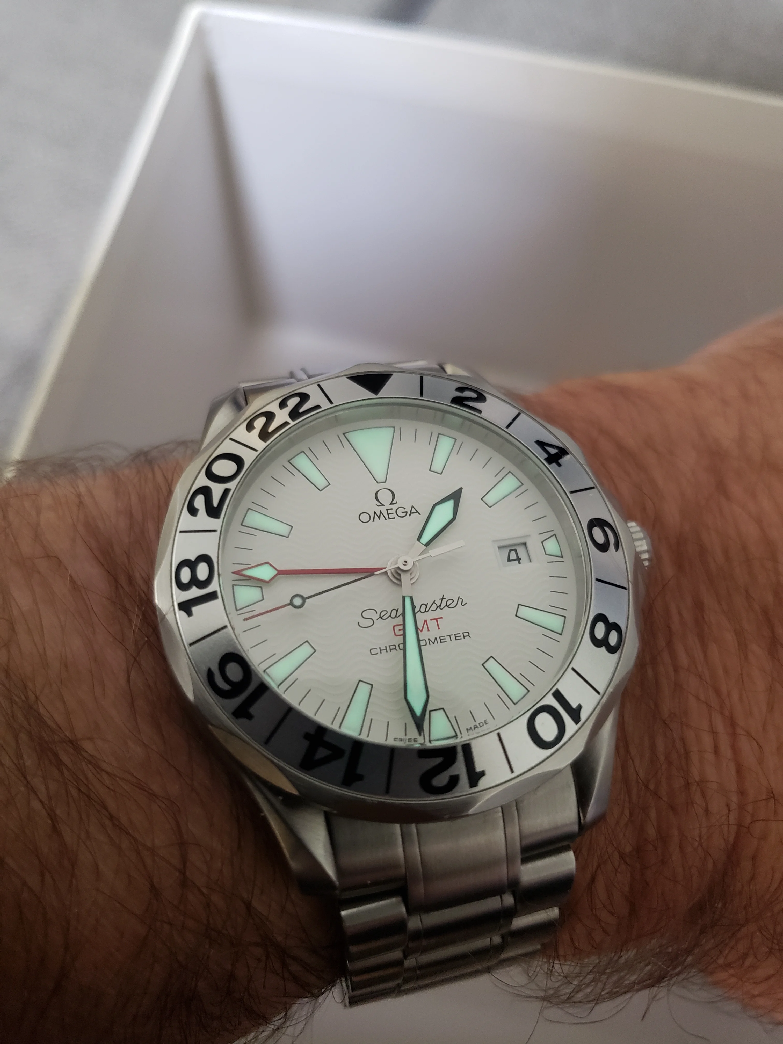 Up for sale is my Omega Seamaster Professional 2538.20, better known as the "Great White." 1128 movement, 41 mm in diameter, 13.1 mm thickness, fits easily under the shirt cuff. Has the white wave dial, large lume plots, sword hands, and red GMT hand. The uncluttered dial makes it extremely readable. IMO one of the best designs from the Peter Blake era.