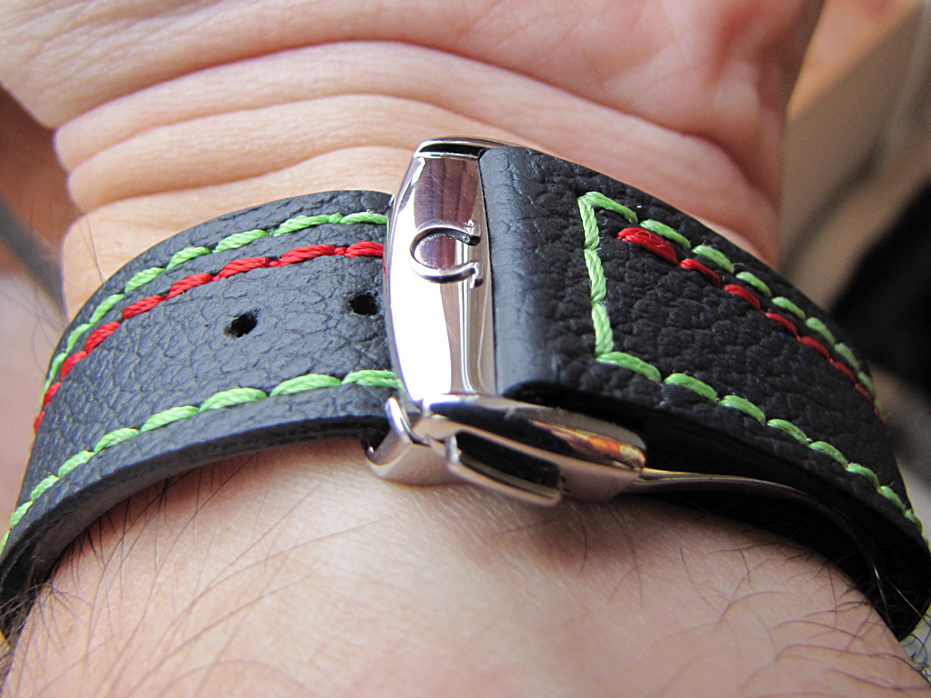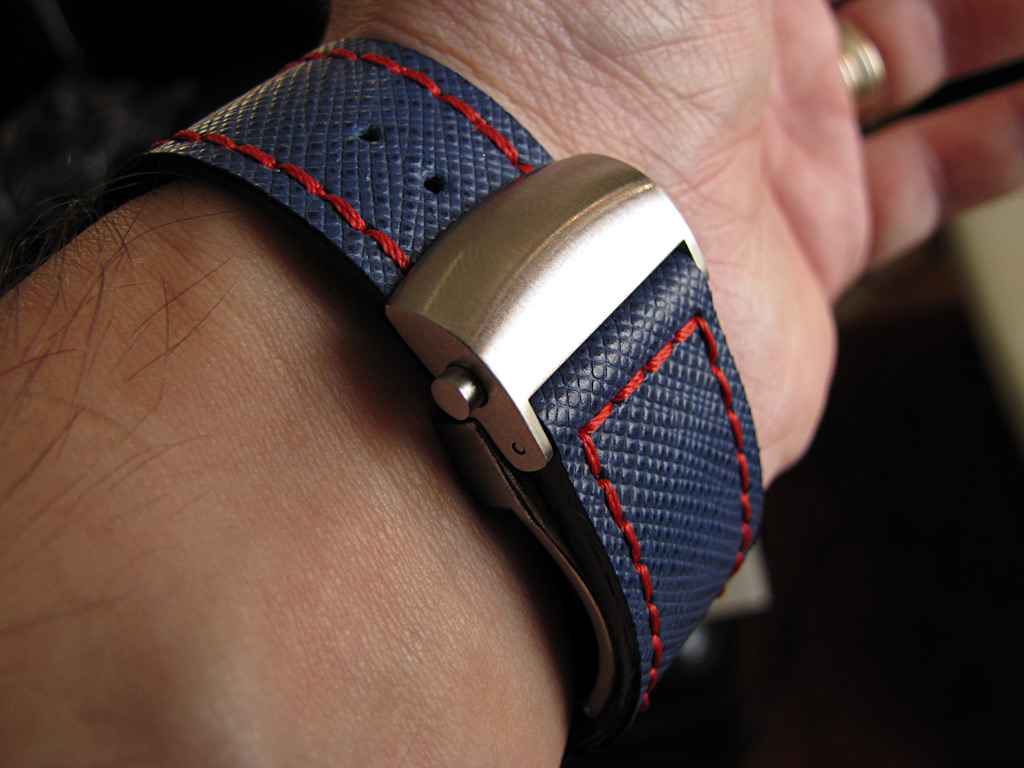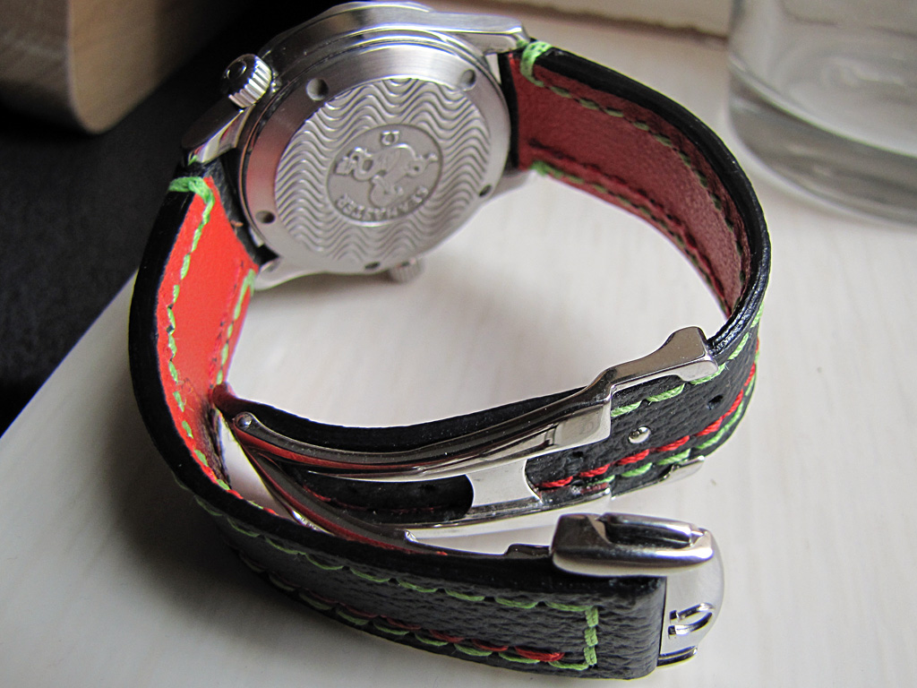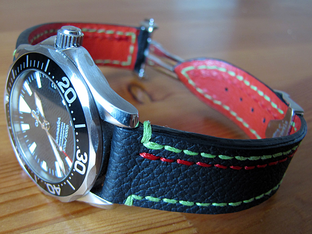 A friend of mine made me a few leather straps. Leather is full water proof prepeared. I chose this blue leather because of its texture. Stitches are made of silk and match the color of the second hand's tip.