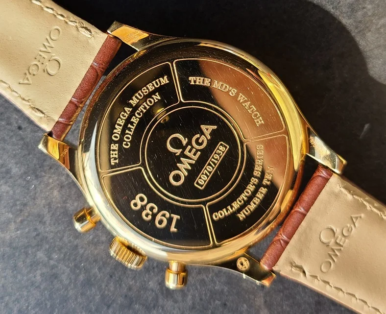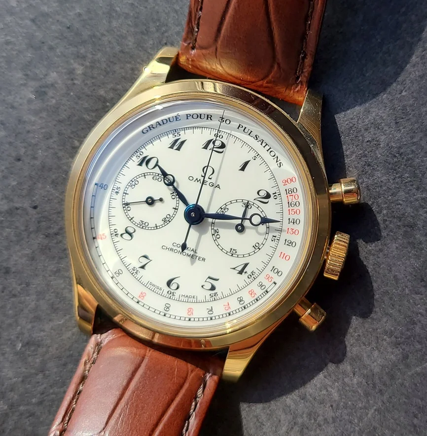Calibre: Omega 3203 Manual-winding chronograph movement with columnwheel mechanism and Co-Axial escapement. Free sprungbalance, continuous small seconds hand, centralchronograph hand and 30-minute counter. Power reserve: 55 hours