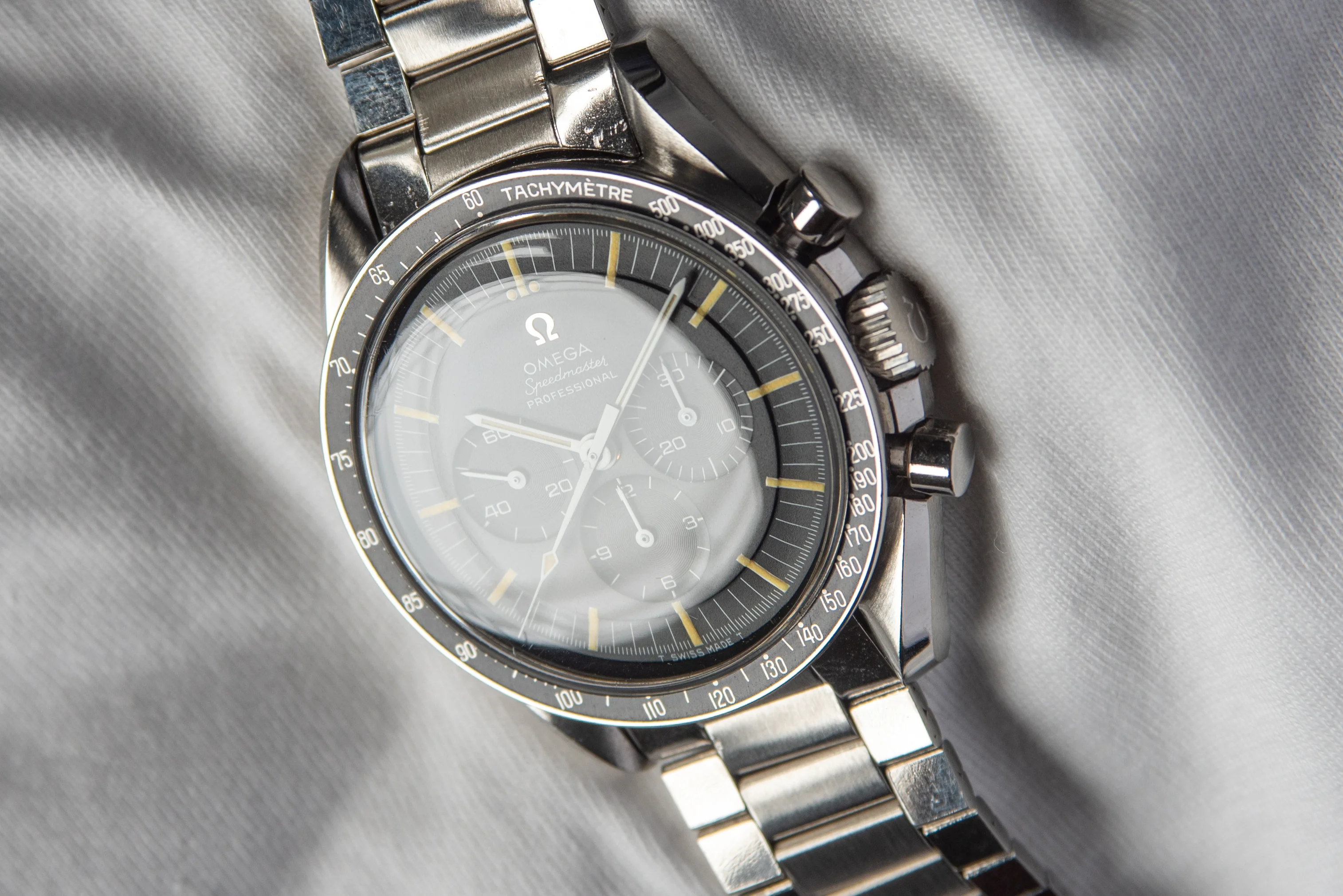 Case: Near mint, unpolished. Case back shows some wear, and top left lug has a small bite. Original signed crown and crystal.