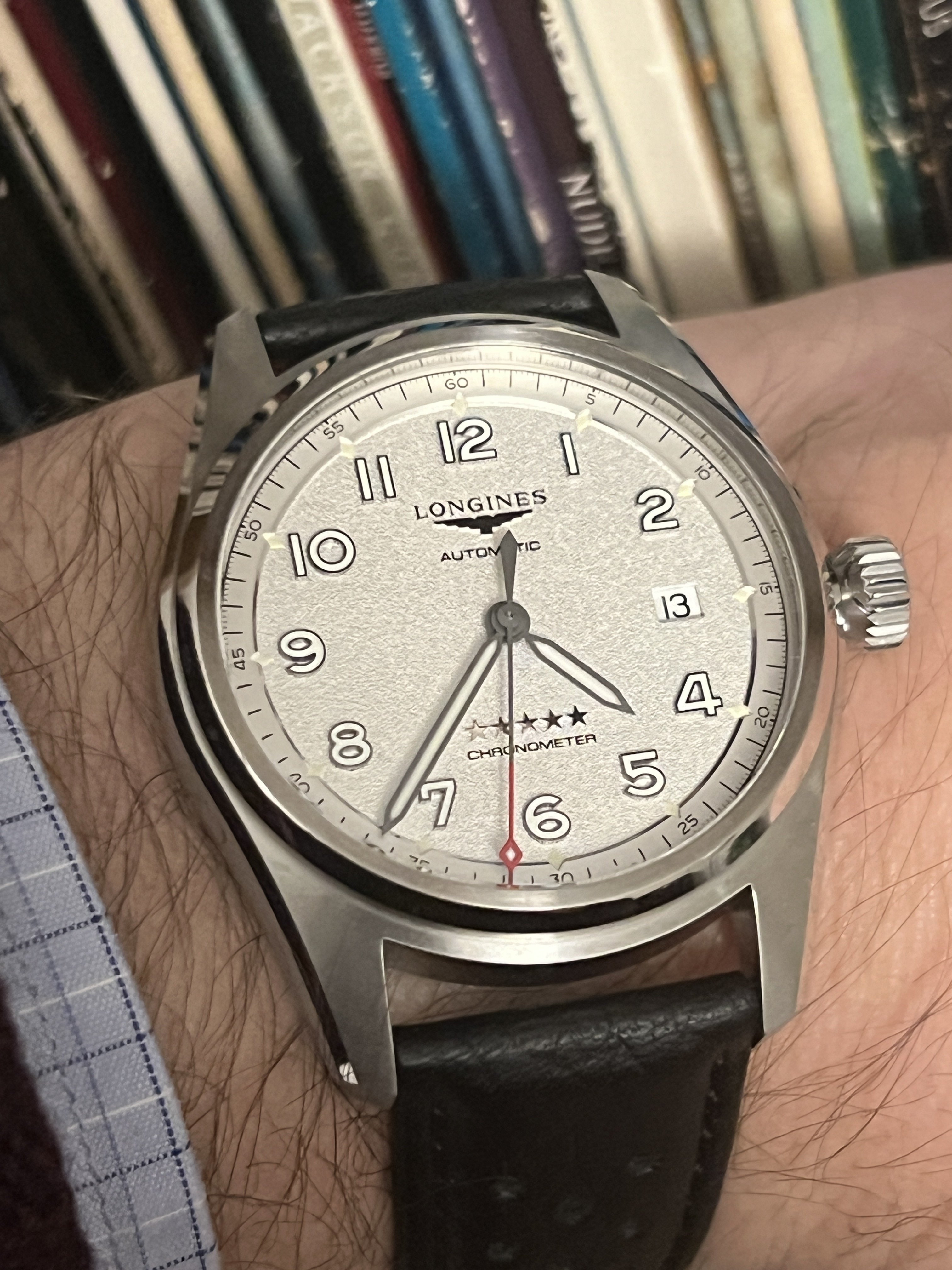 Since we are sticking to the two I think the Longines is cleaner and more elegant. I love the guilloche dial. I like my Speedy to be manual wind, no date and no moon.