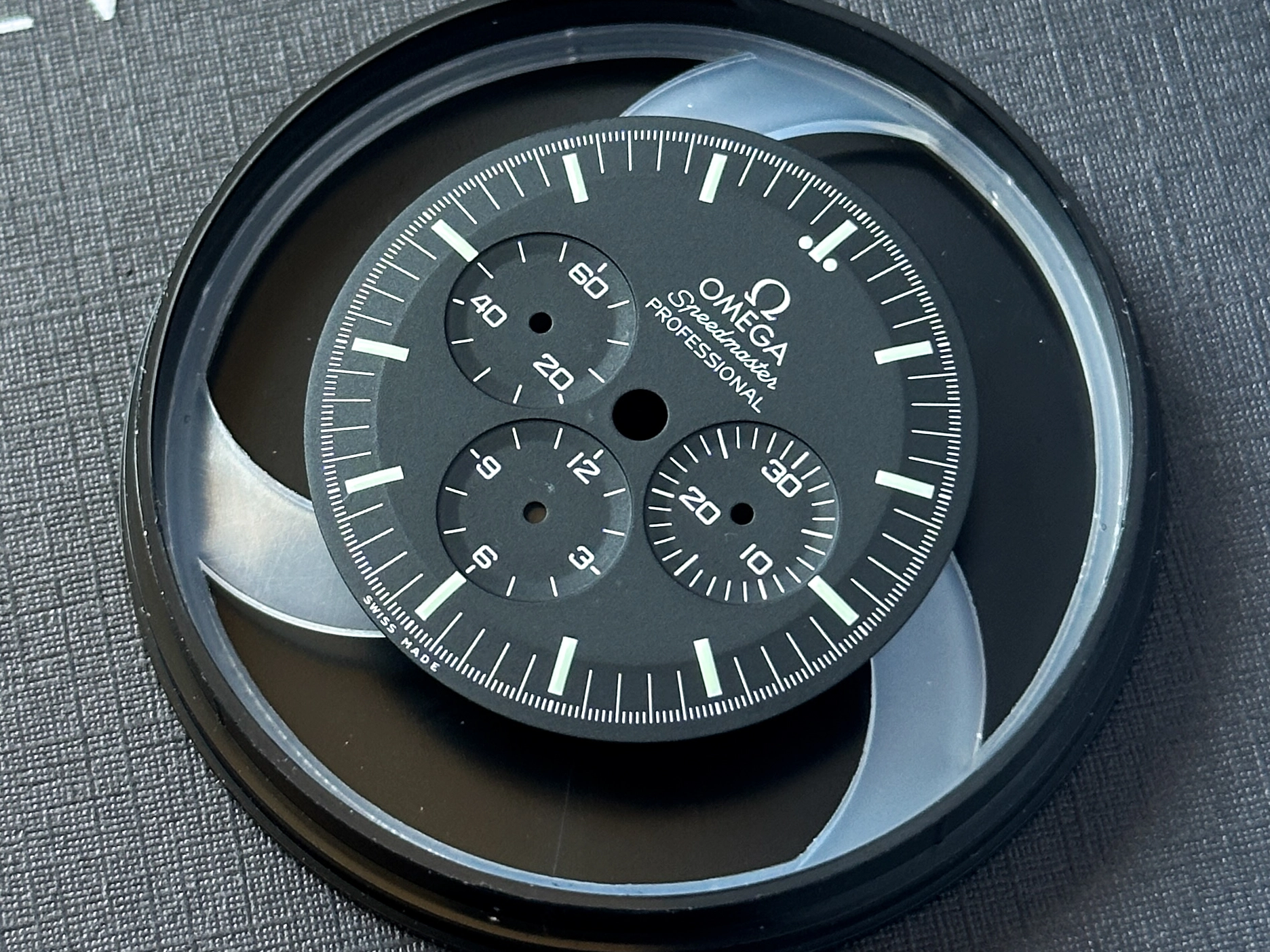 Just like the caseback above, this dial came off my 1861 Speedmaster when I modded it using a TinTin dial. The person performing the mod unfortunately left hand removal tool marks on this dial in two places - Just under and to the left of the center post hole as well as under the 12 in the 6 o'clock subdial. Anything else you see is dust. The last photo is the dial under a genuine used (lightly marked) Speedmaster crystal so you can get an idea of how it presents itself.