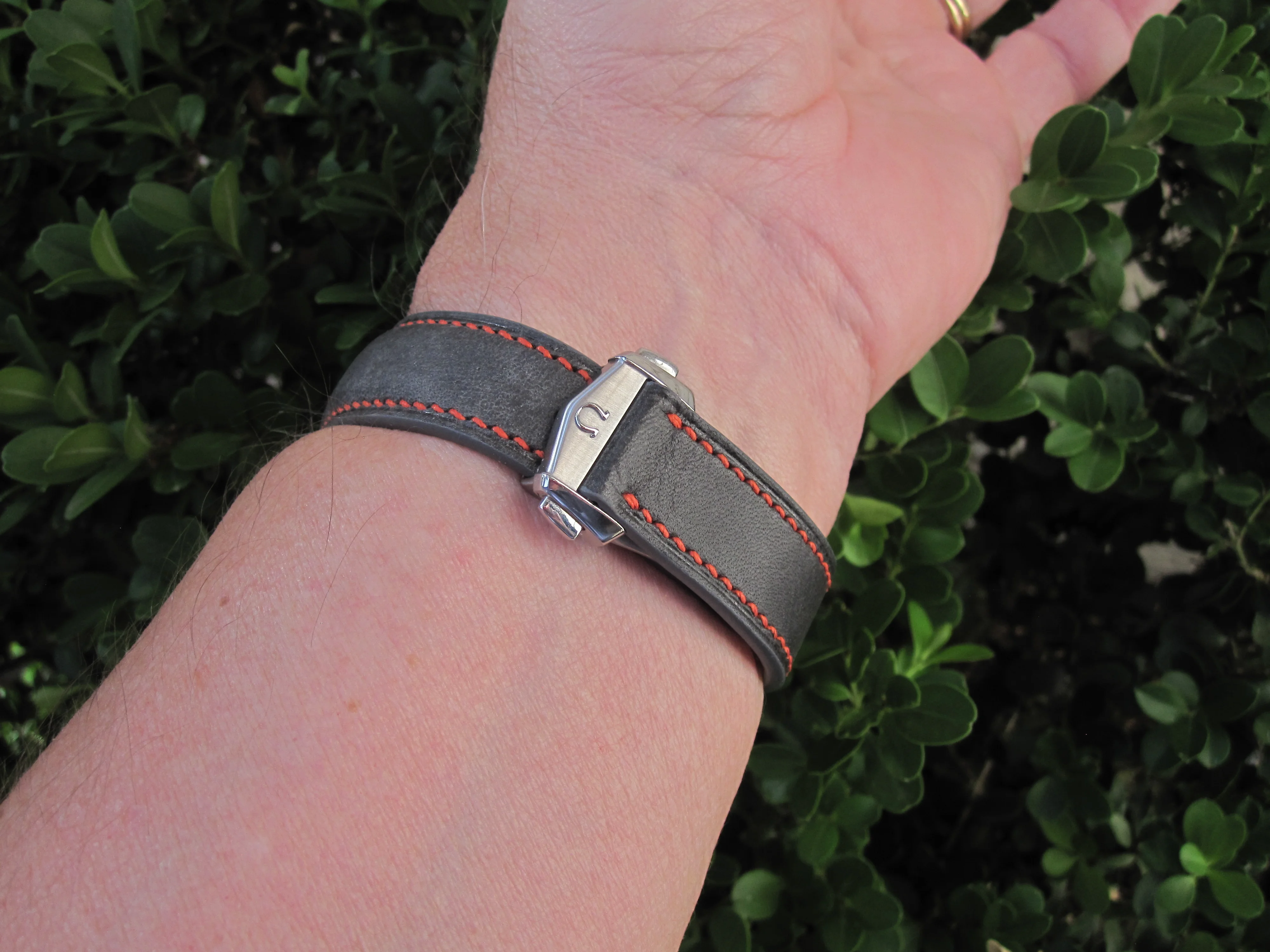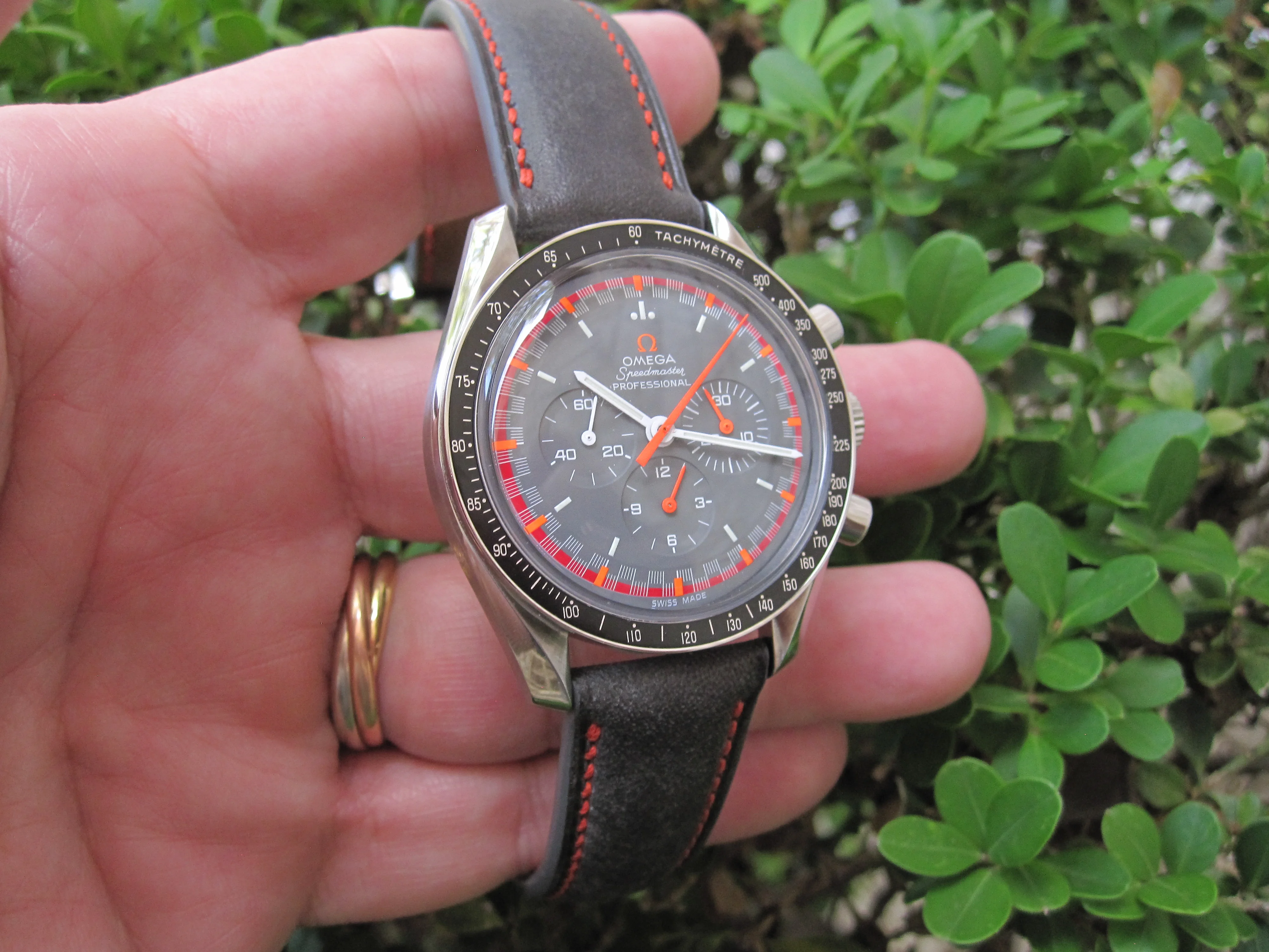·This Ref 3594.50 Broad Arrow from around 1999-2000 was modded by Adam Lewis in 2021 into Racing Special spec with a complete overhaul on the movement, a case refinish, and with a new correct back and bracelet, identical to a Ref 3570.40. I wear it on a Genteel-Handmade charcoal grey Maya leather strap with orange stitching and Omega DP buckle. Just a different way to have the correct look on your wrist. It's NOT a real Japan Racing Special and not presented as such, but it's indistinguishable from a real one, especially if worn on the bracelet. Personally, I don't see the point of paying a premium for one of the 2004 sold in Japan when the only characteristic of this LE watch is the dial and hands, and since Omega freely sold the dial and hands for years afterward. Their business decision at the time, which they finally decided was not in their best interest after all. But it was/is an easy mod.