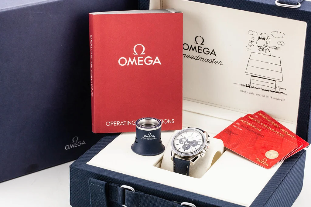 ยทUp for sale is an excellent condition Omega Speedmaster Moonwatch Silver Snoopy Award 50th Anniversary, reference # 310.32.42.50.02.001. It comes with all boxes, papers, booklets, loupe tool, and Omega Warranty Card dated November 2021.