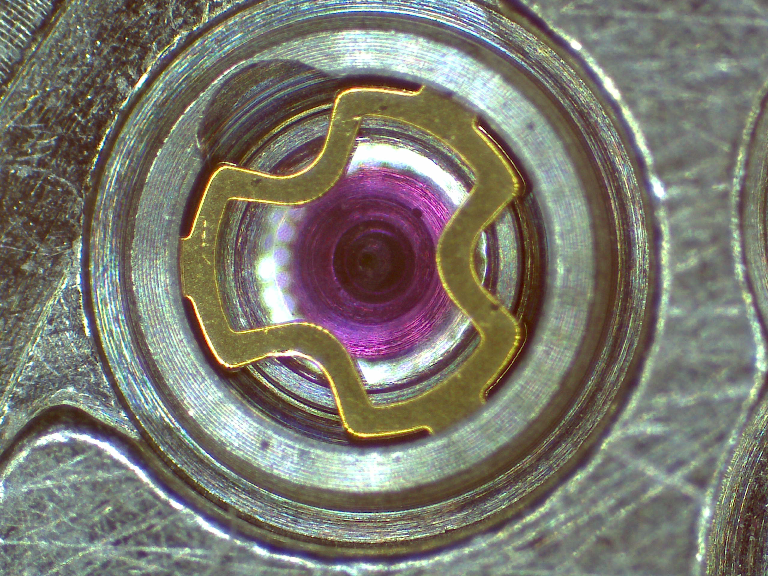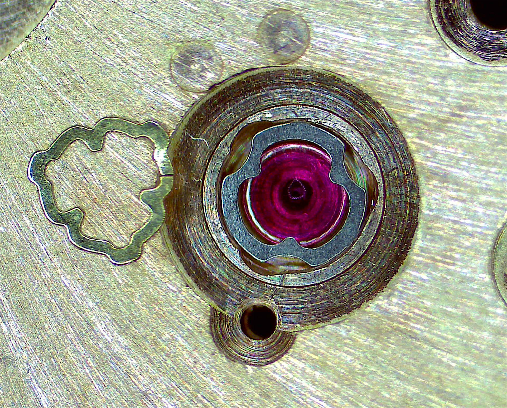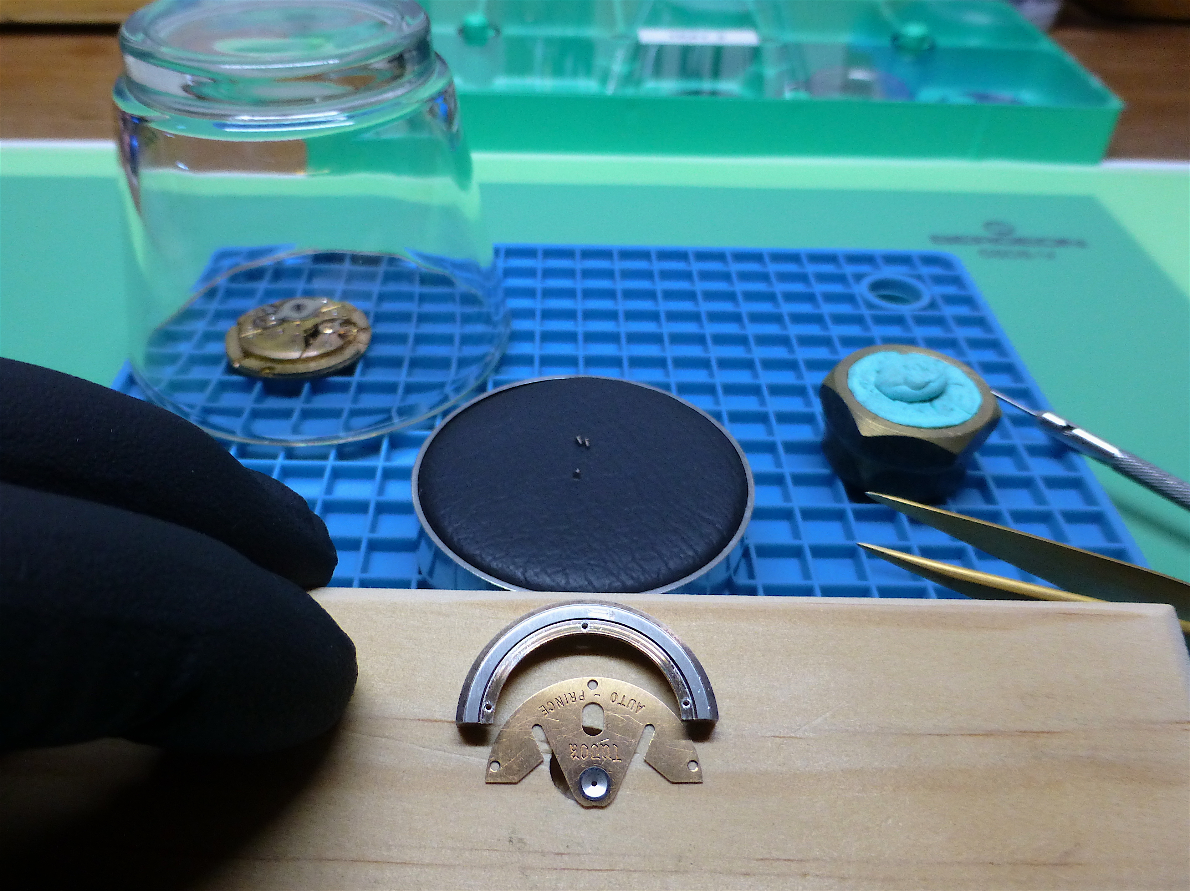 Then, squeezing the rotor pin/rotor/bridge between the fingers of my left hand, I used my right hand to pick up my tweezers, pick up the tiny cross clip that hold the rotor on the pin and position it over the pin. Next I had to swap tweezers for a specially shaped bamboo stick, all the while keeping the rotor parts together and not disturbing the precariously poised cross clip. The bamboo stick was then pushed onto the clip to seat it. It god a bit interesting when the finger of my glove started to wrinkle under pressure and get in the way of the clip, but thankfully it popped into place and didn't ping off into the ether!