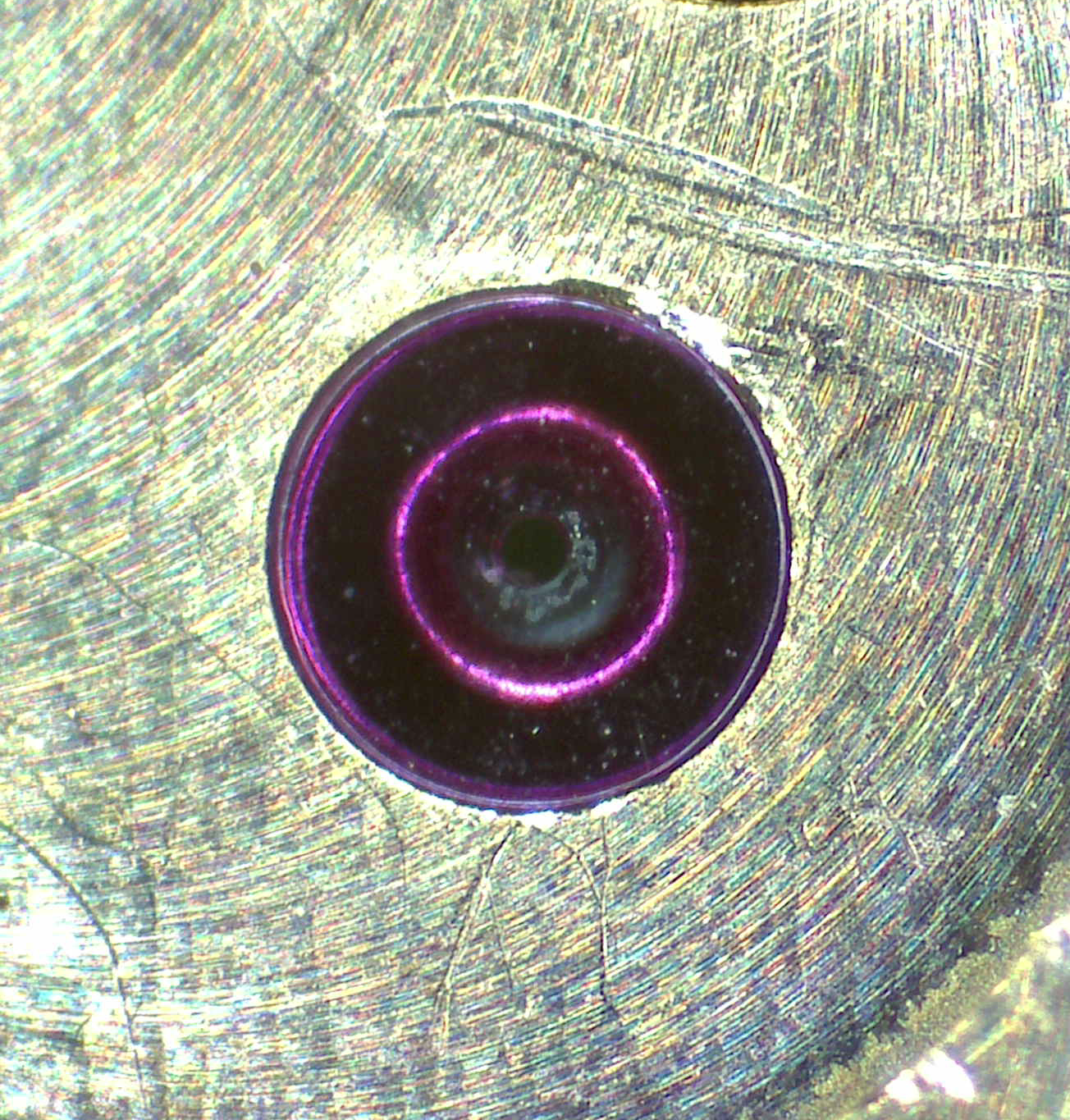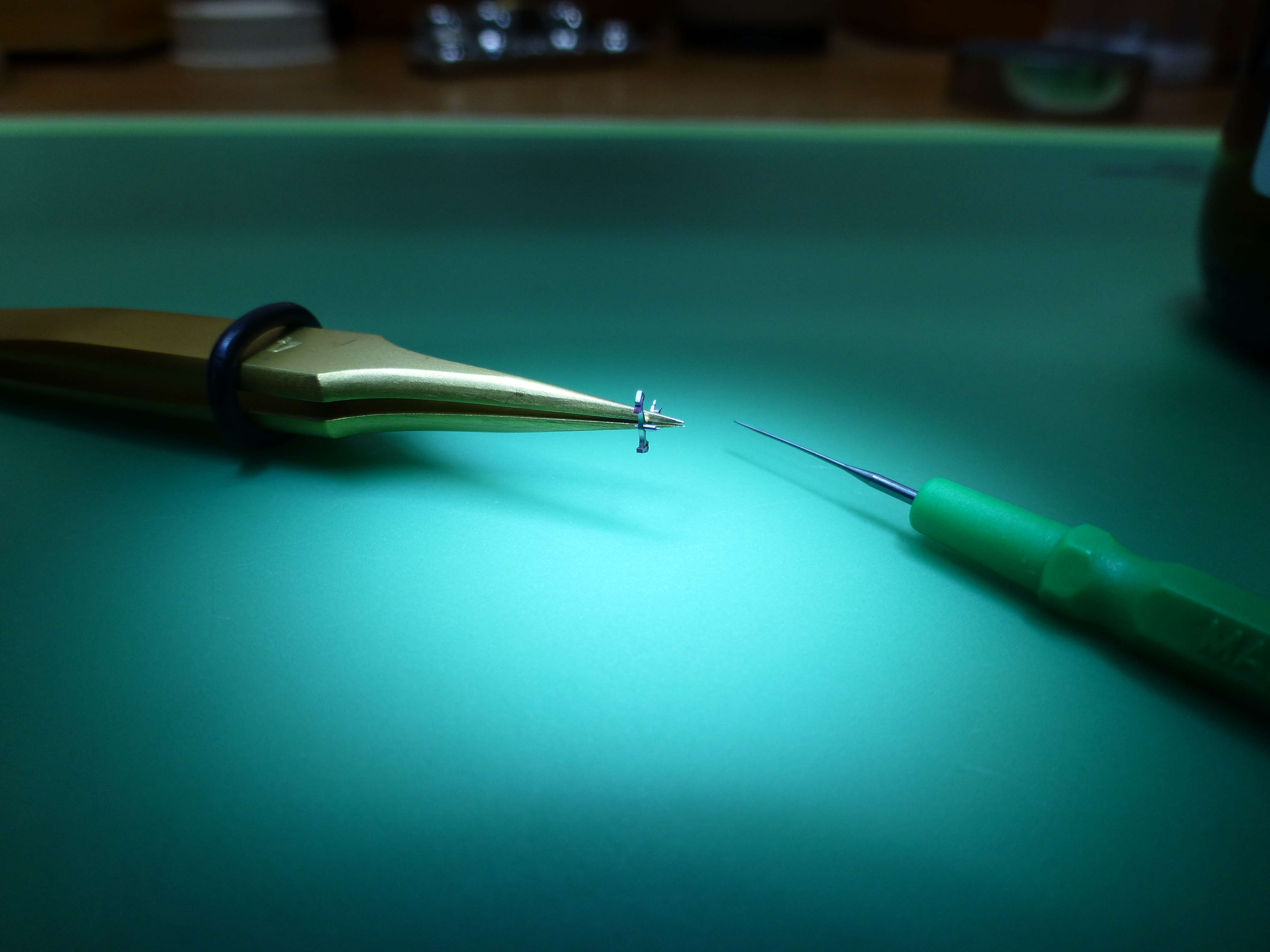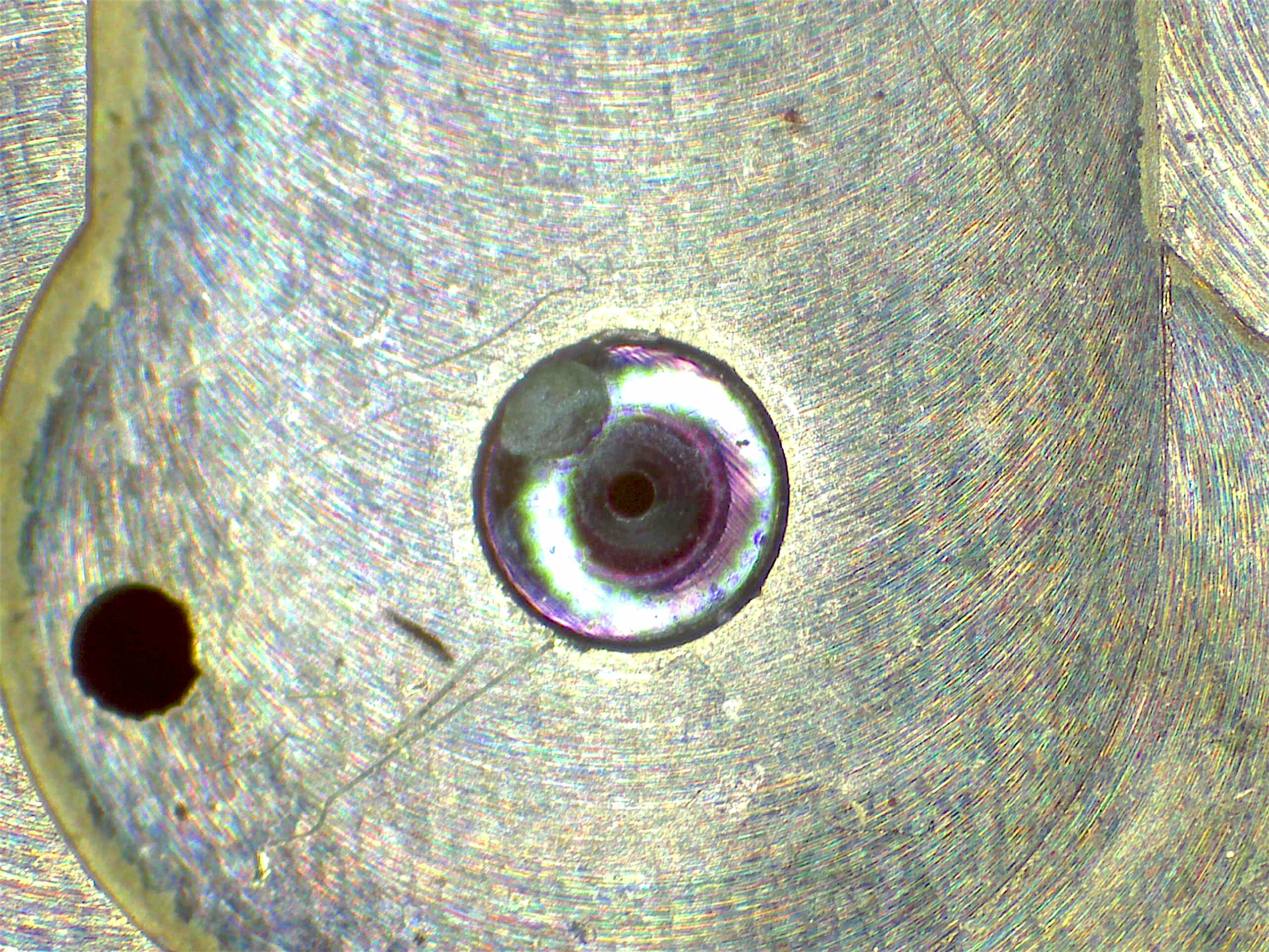 Then, squeezing the rotor pin/rotor/bridge between the fingers of my left hand, I used my right hand to pick up my tweezers, pick up the tiny cross clip that hold the rotor on the pin and position it over the pin. Next I had to swap tweezers for a specially shaped bamboo stick, all the while keeping the rotor parts together and not disturbing the precariously poised cross clip. The bamboo stick was then pushed onto the clip to seat it. It god a bit interesting when the finger of my glove started to wrinkle under pressure and get in the way of the clip, but thankfully it popped into place and didn't ping off into the ether!