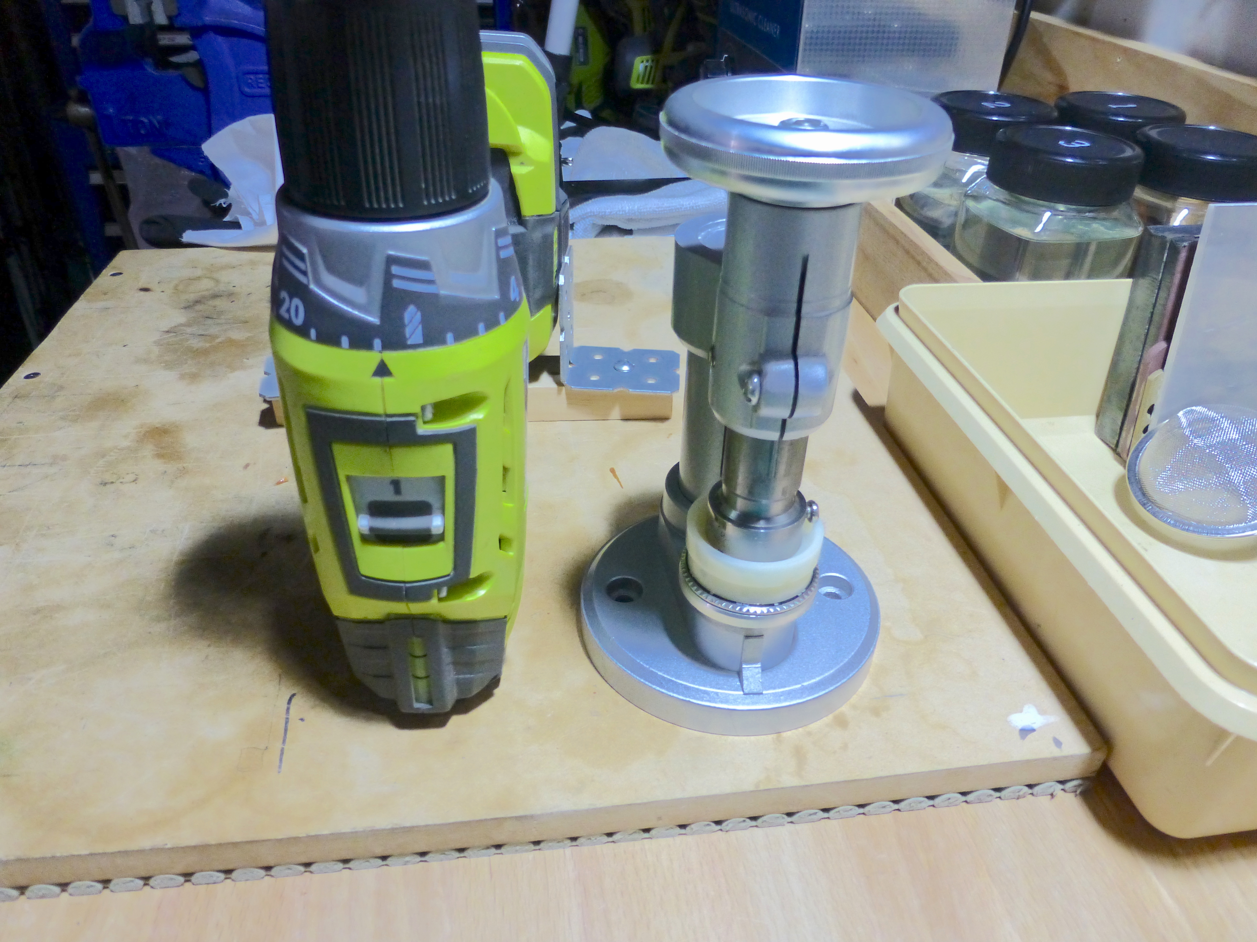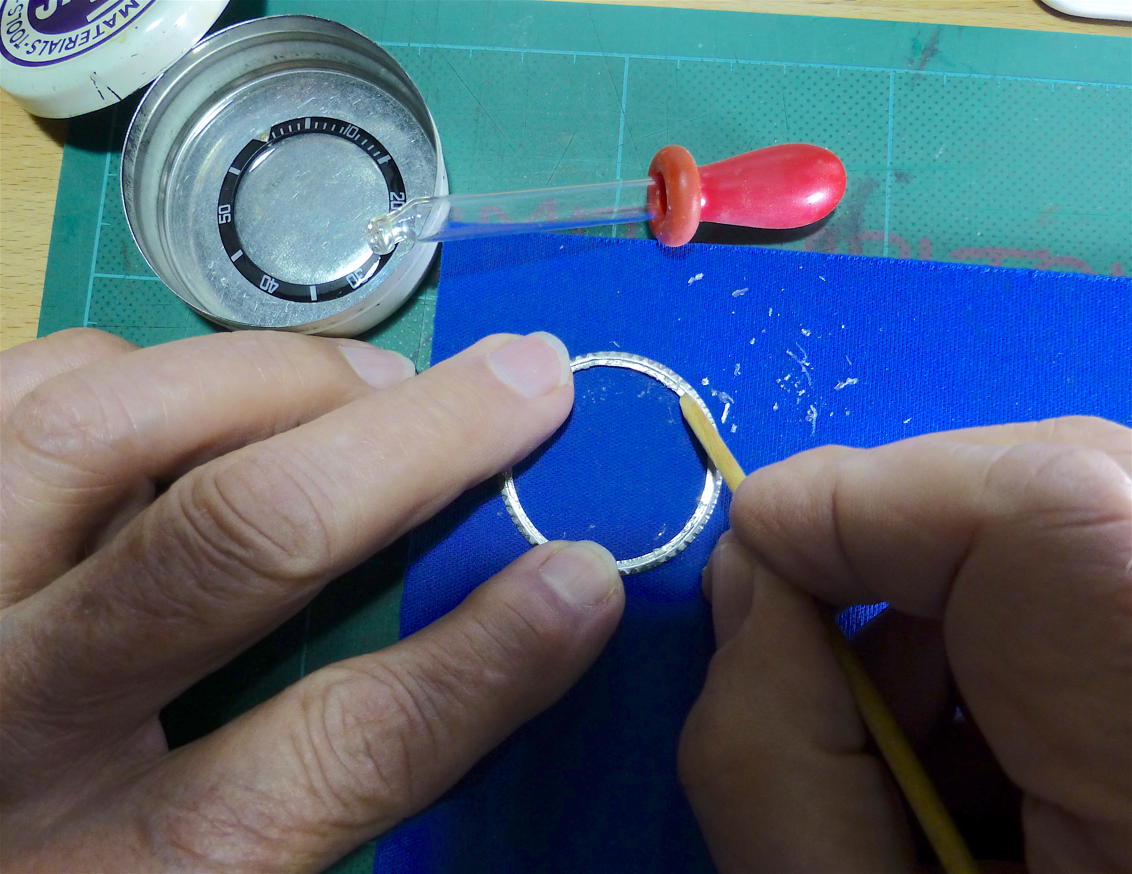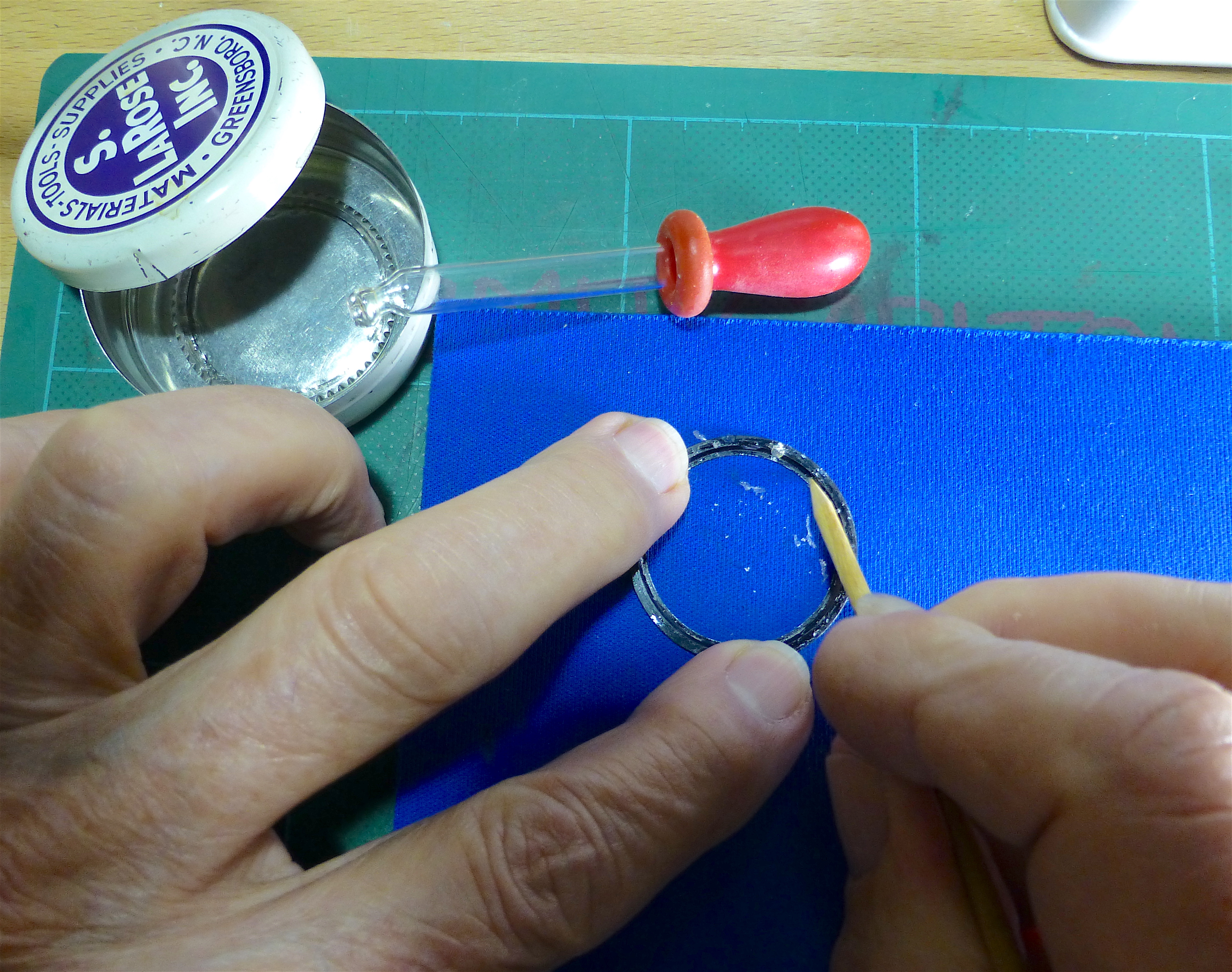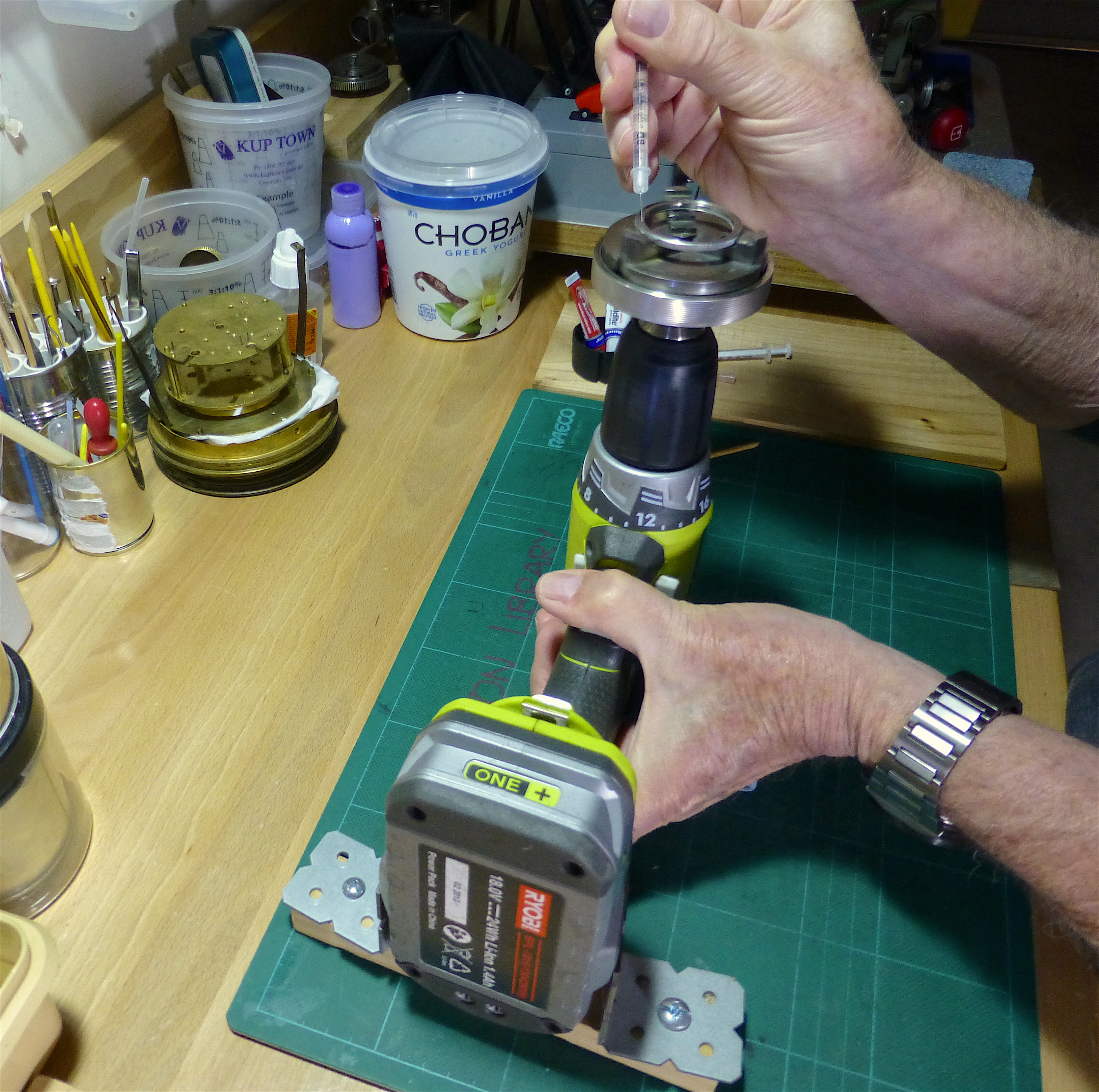 Out came my trusty "vertical lathe" 😁 so that I could apply a fine even bead of glue around the bezel. Using a fine hypo allowed me to apply glue in a controlled manner thus avoiding lumps and big drops that would possibly squeeze out and get all over places I didn't want it.