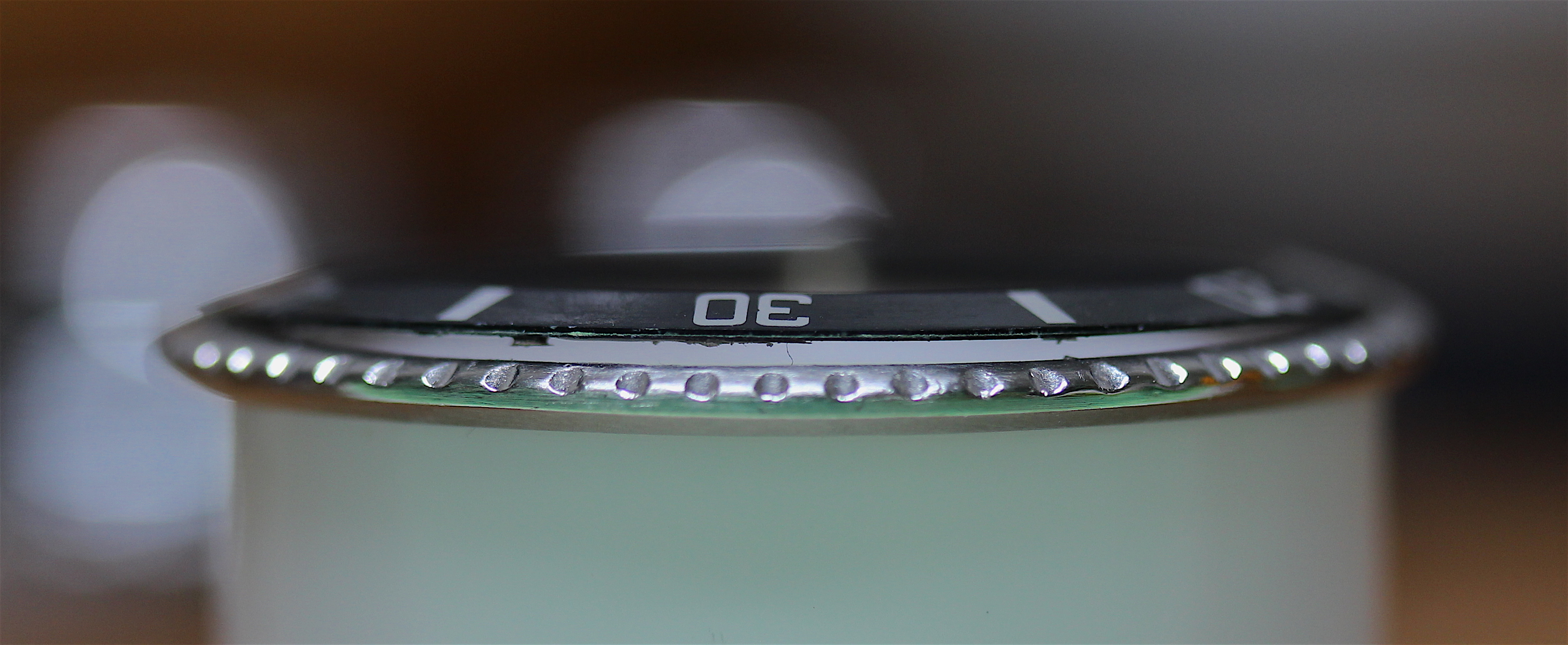 The insert was then aligned to a mark on the bezel that I'd found gave the "best fit option", it was gently put in place (avoiding smearing any glue) and then put into a press to clamp both parts together for 24 hours.
