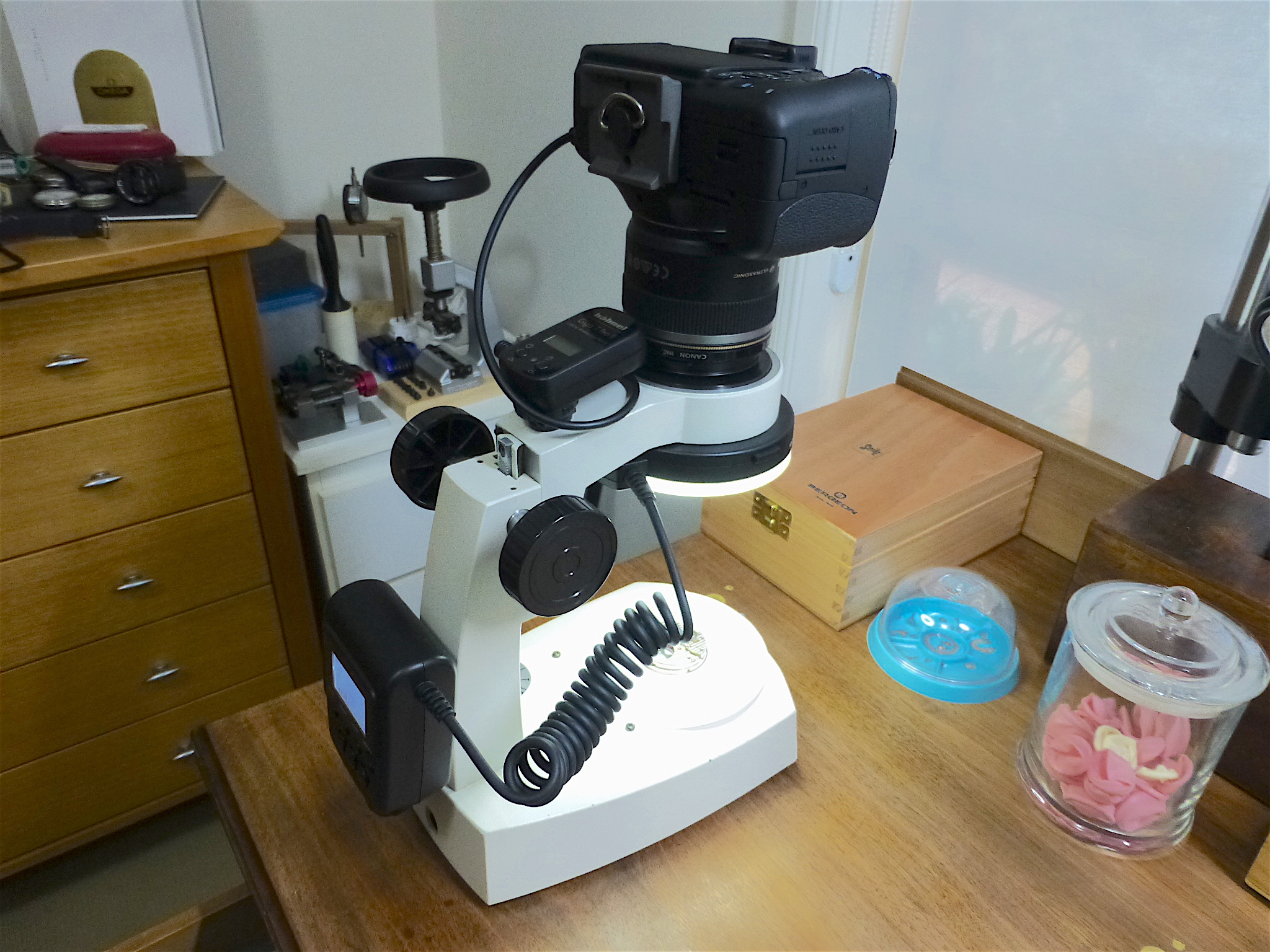 You can use a light ring like I showed, it has a diffuser but still causes a bit of reflection. I often use it just for disassembly/assembly shots if I don't have a tech guide for the caliber I'm working on.