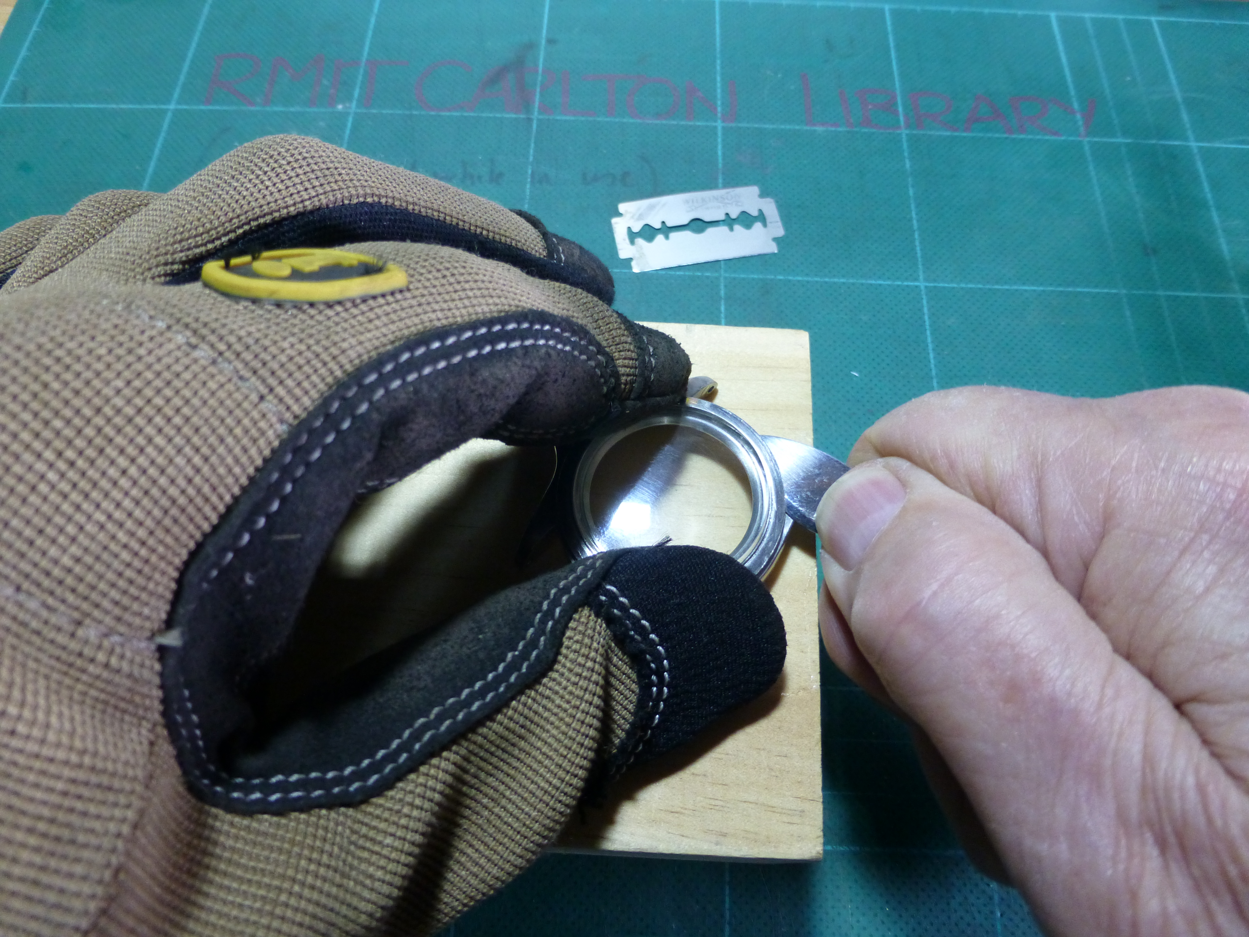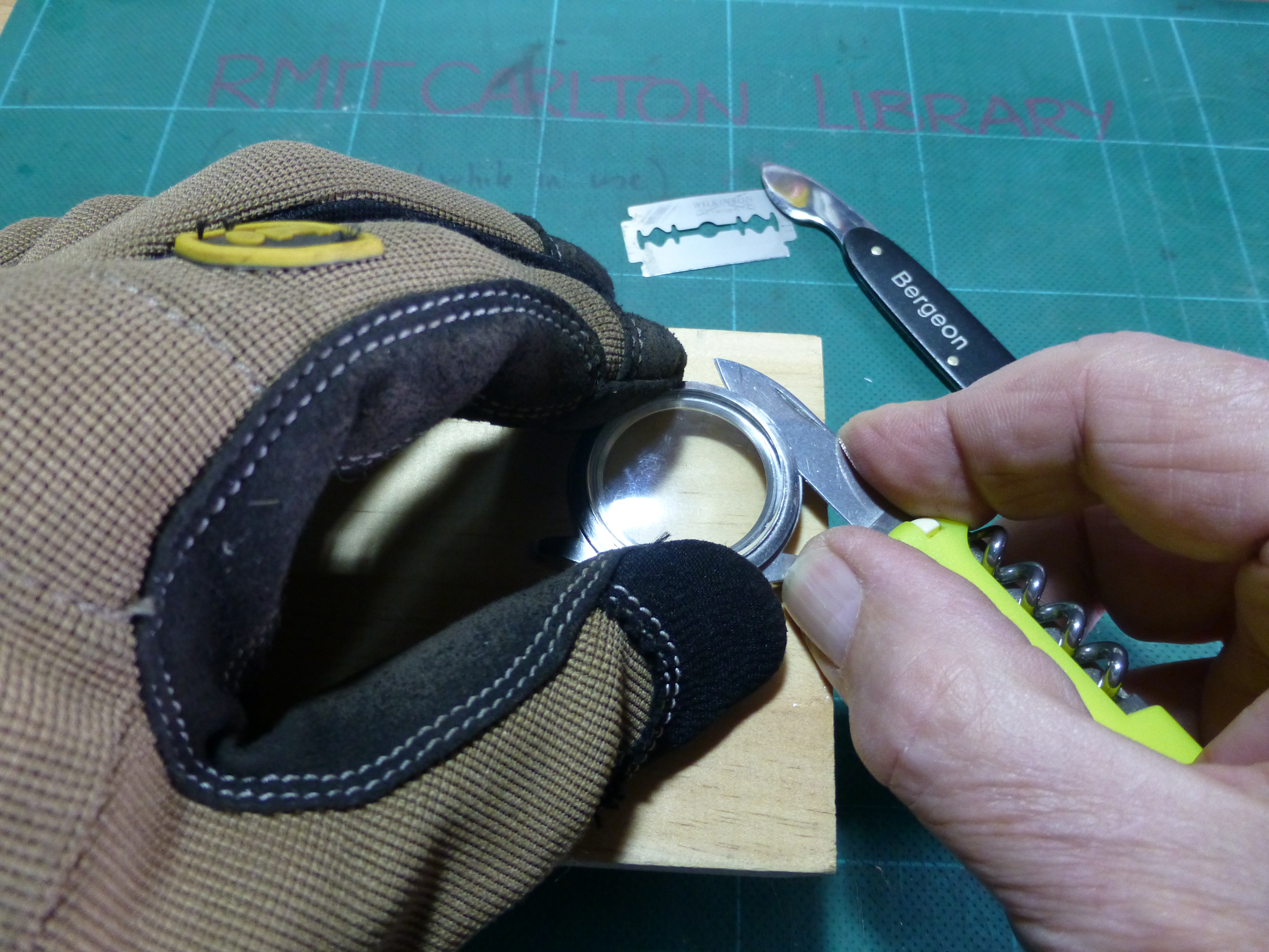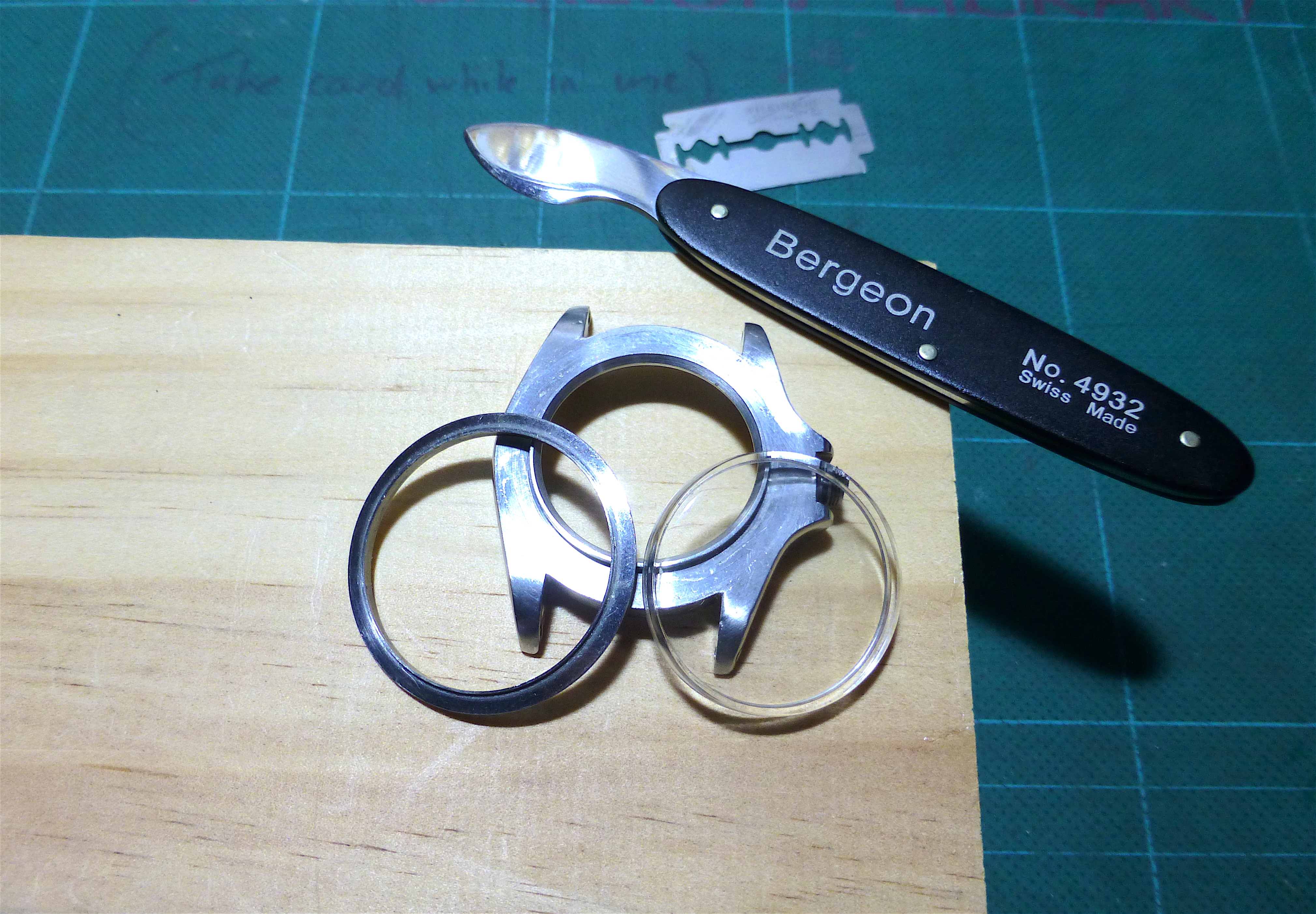 Not trusting my bezel remover to get into such a small seam, I used the tried and true method, starting with a safety razor blade until I had enough room for a larger blade.