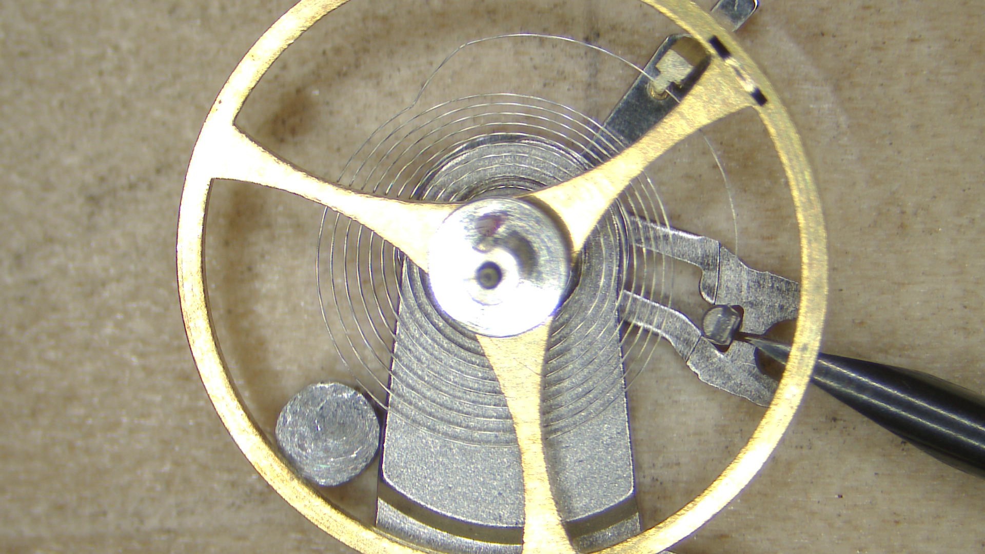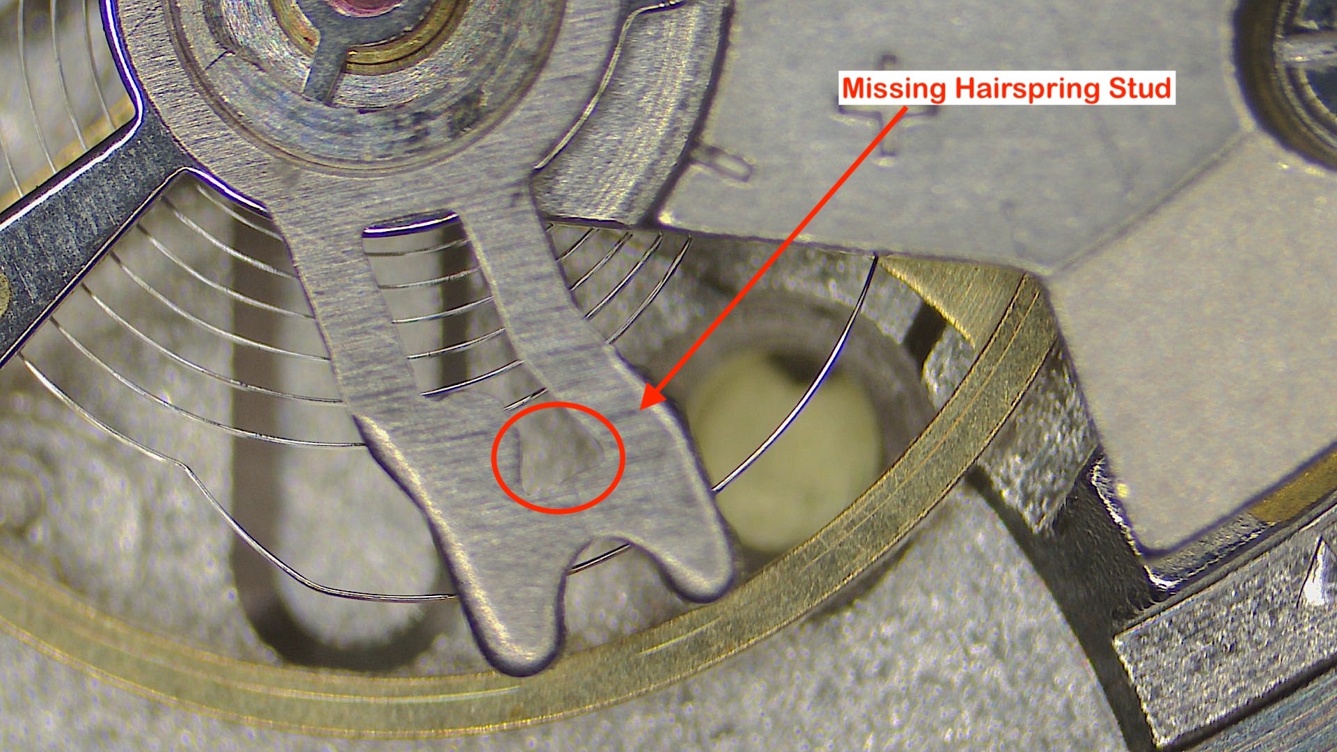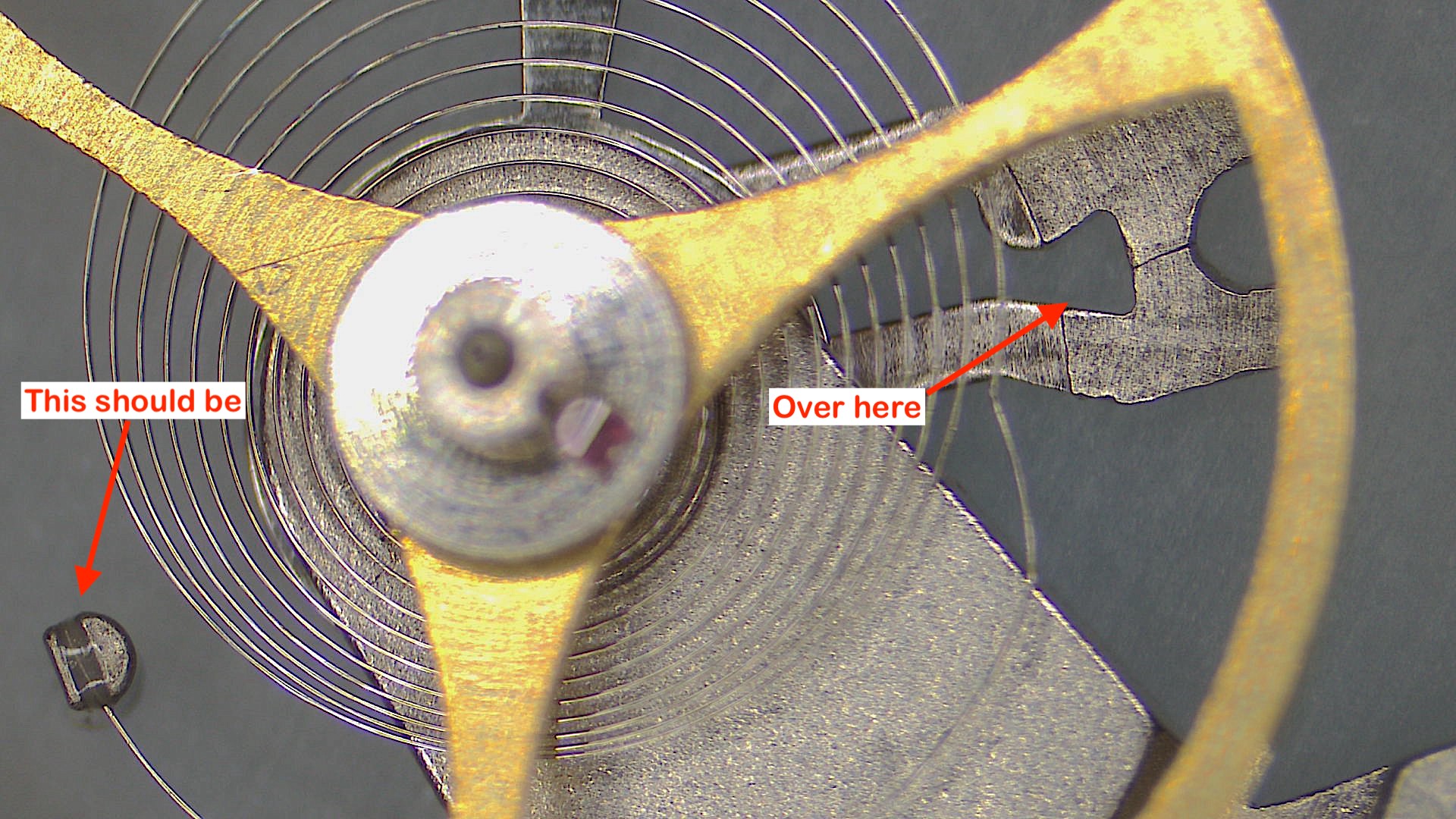 Looking closer I saw that the hairspring coil was seriously out of whack. Instead of nice evenly spaced coils, the spring was compressed to one side.