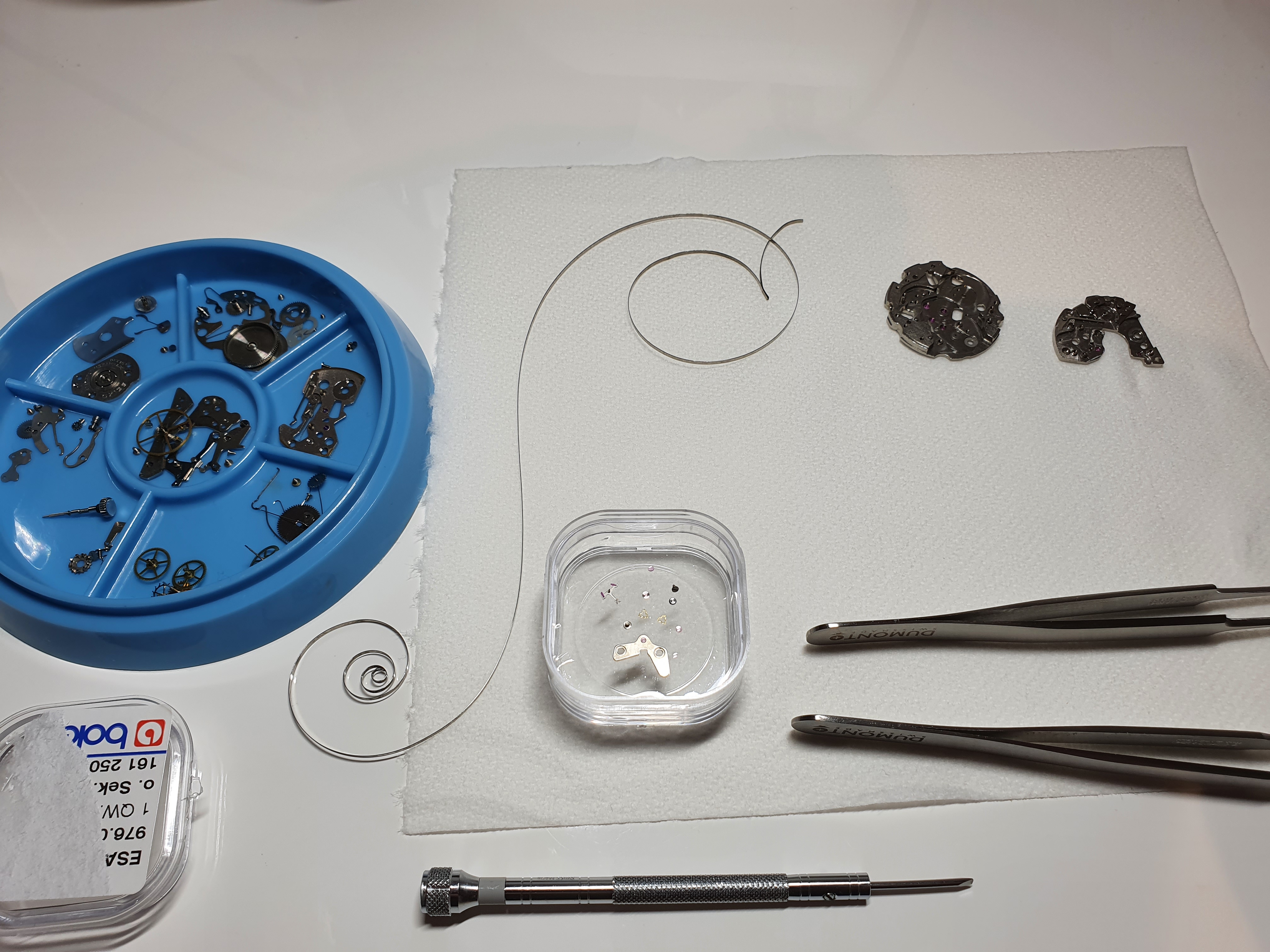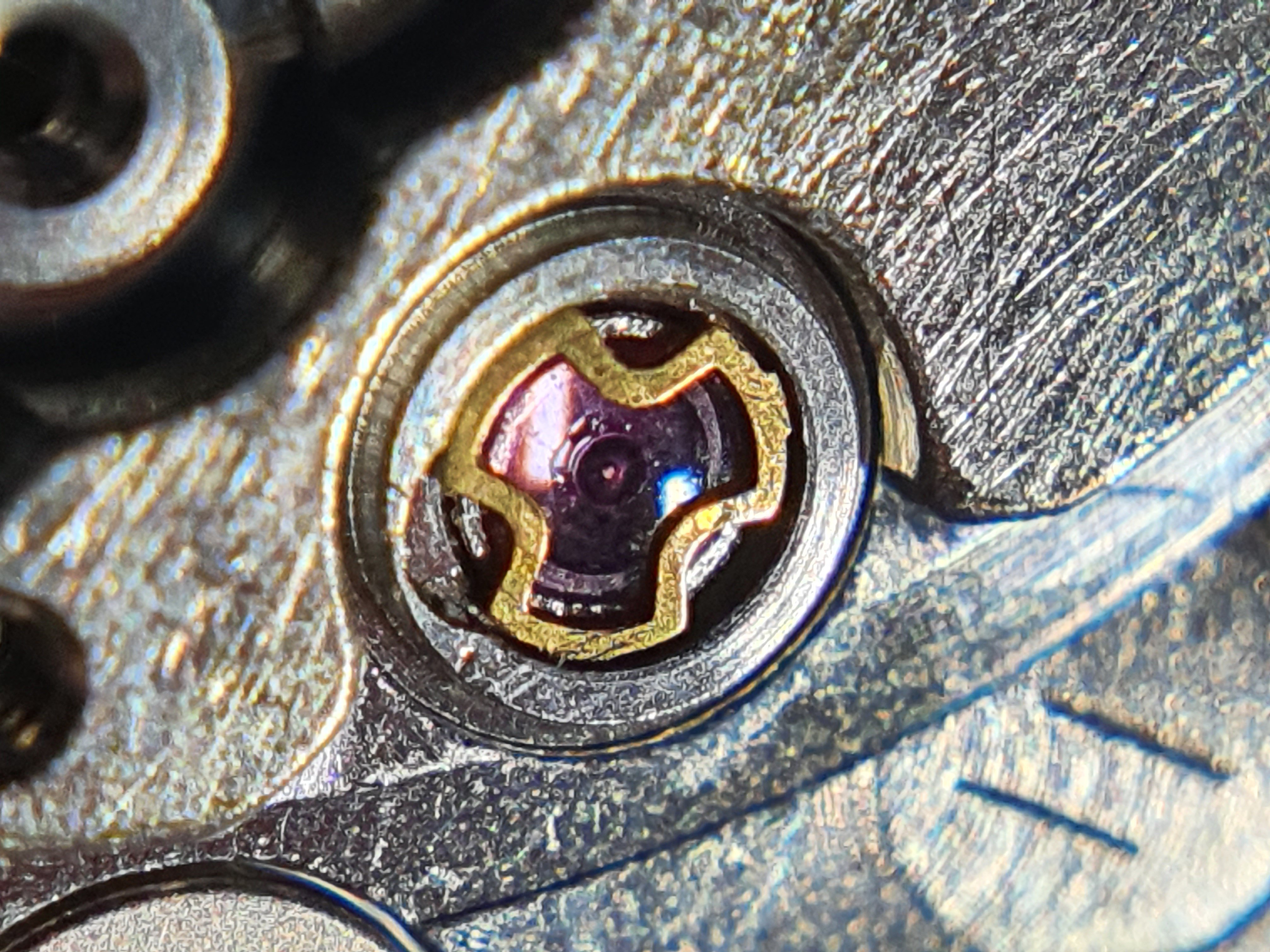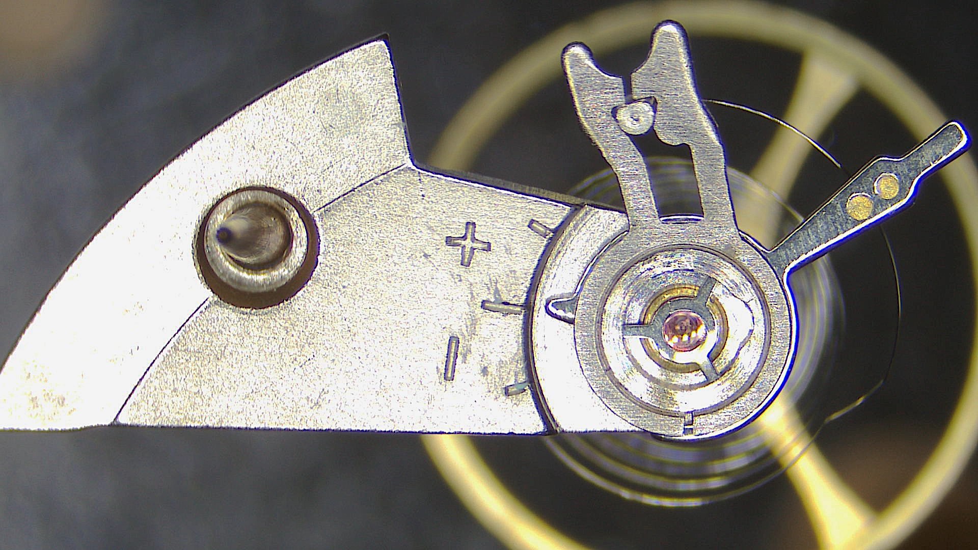 Looking closer I saw that the hairspring coil was seriously out of whack. Instead of nice evenly spaced coils, the spring was compressed to one side.