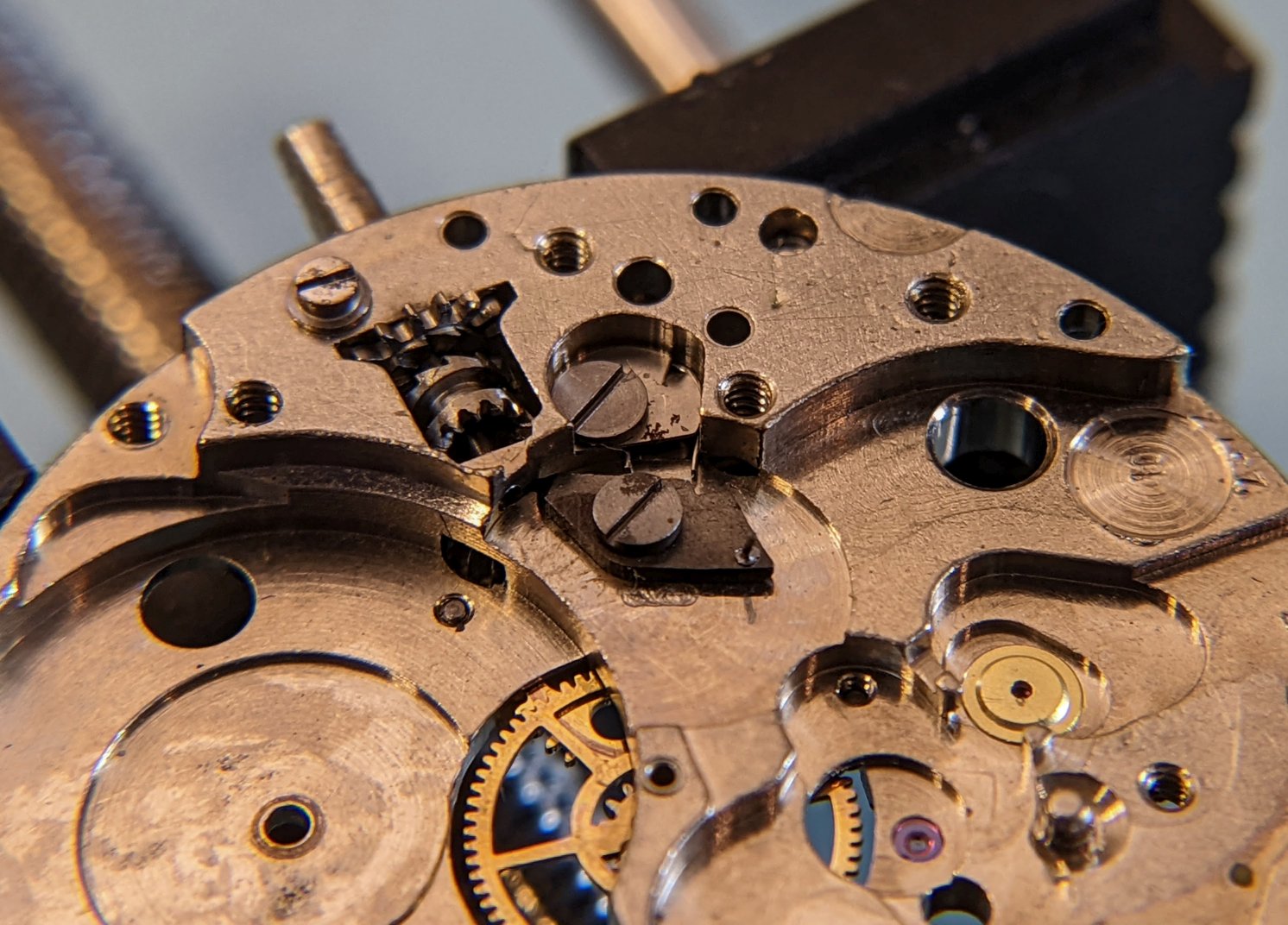 The DR 2F2 hacking lever. When the stem is pulled out to setting position the hacking lever rotates & presses the hacking pin into the side of the balance wheel (looks pretty crude, compared to the crafting & finishing of the rest of the components...)