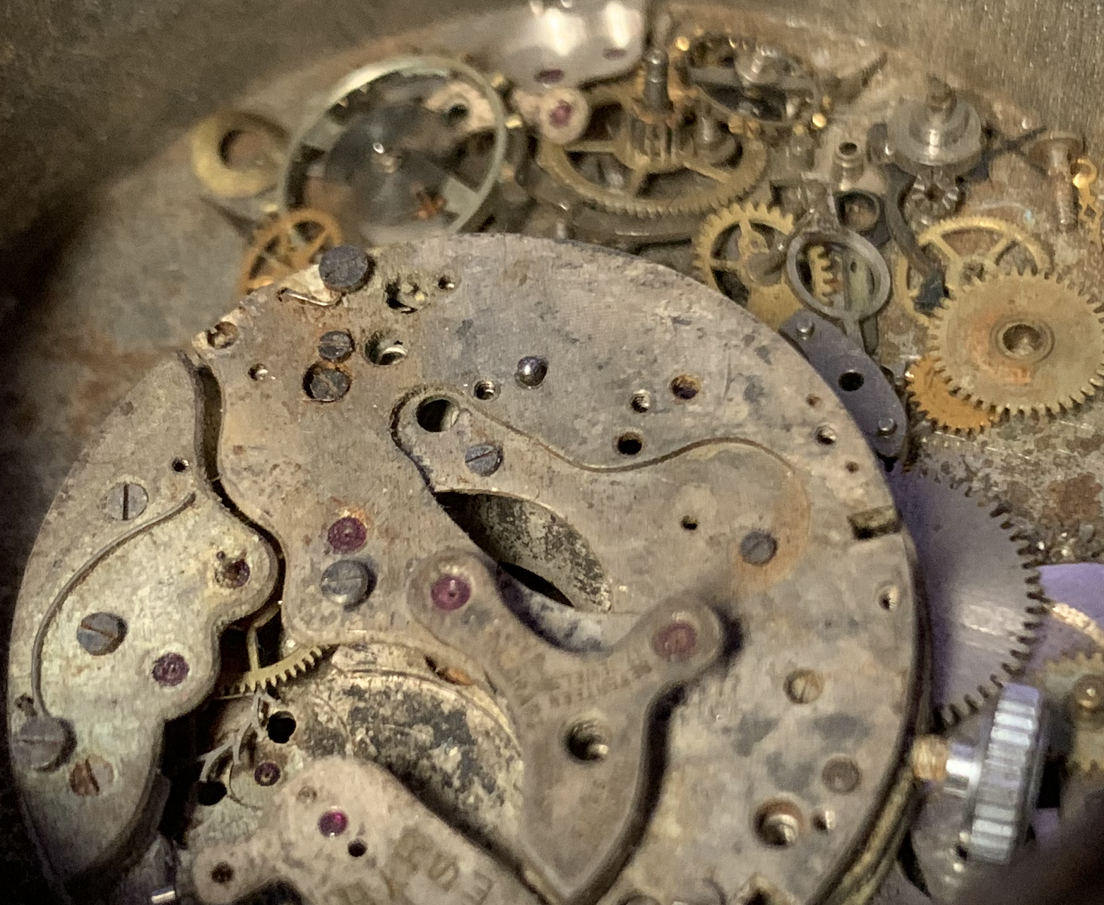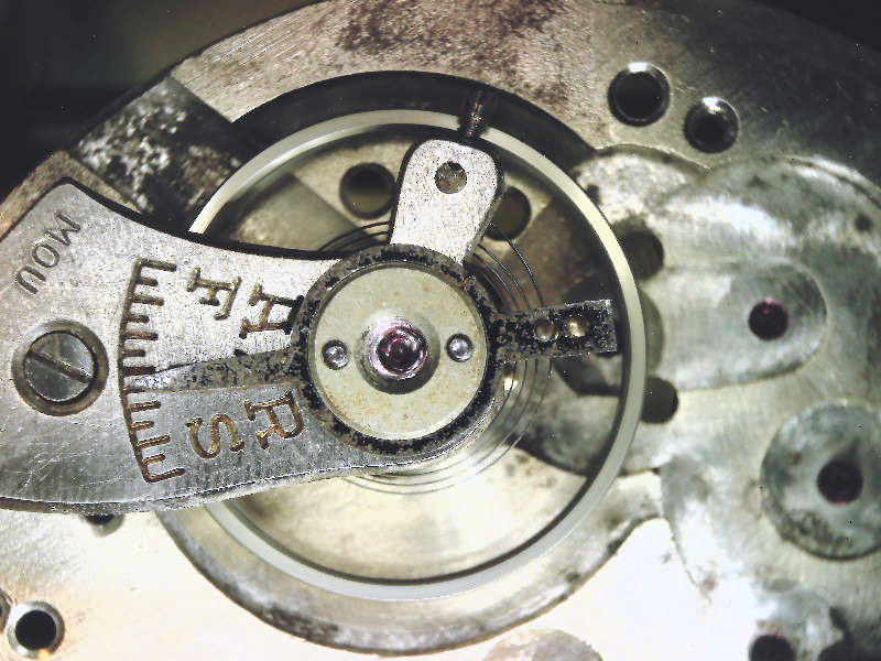 The camera also exaggerates the discoloration, making it look like red rust when to the eye it is dull gray and hardly noticeable. The only way to truly fix this would be to polish the plating off the movement and re plate it. Much more work than it is worth. The watch does have a history, even if that history was 40 or 50 years in a rusty tin can. (I probably have owned it at least 25 years in that state.)