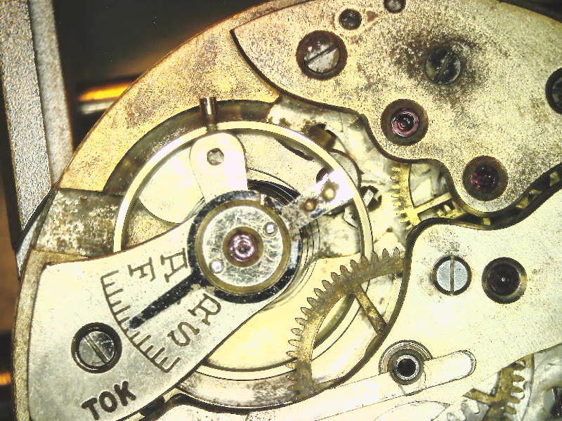 As noted above there are two balance bridges and 3 chronograph bridges. The balance bridges have the letters MOU and TOK (or TOX) Photographs I took of the rusted can after opening it shows this should have been the TOK balance. TOK is not listed in the tables of tarrif codes. It would however go with Time craft.