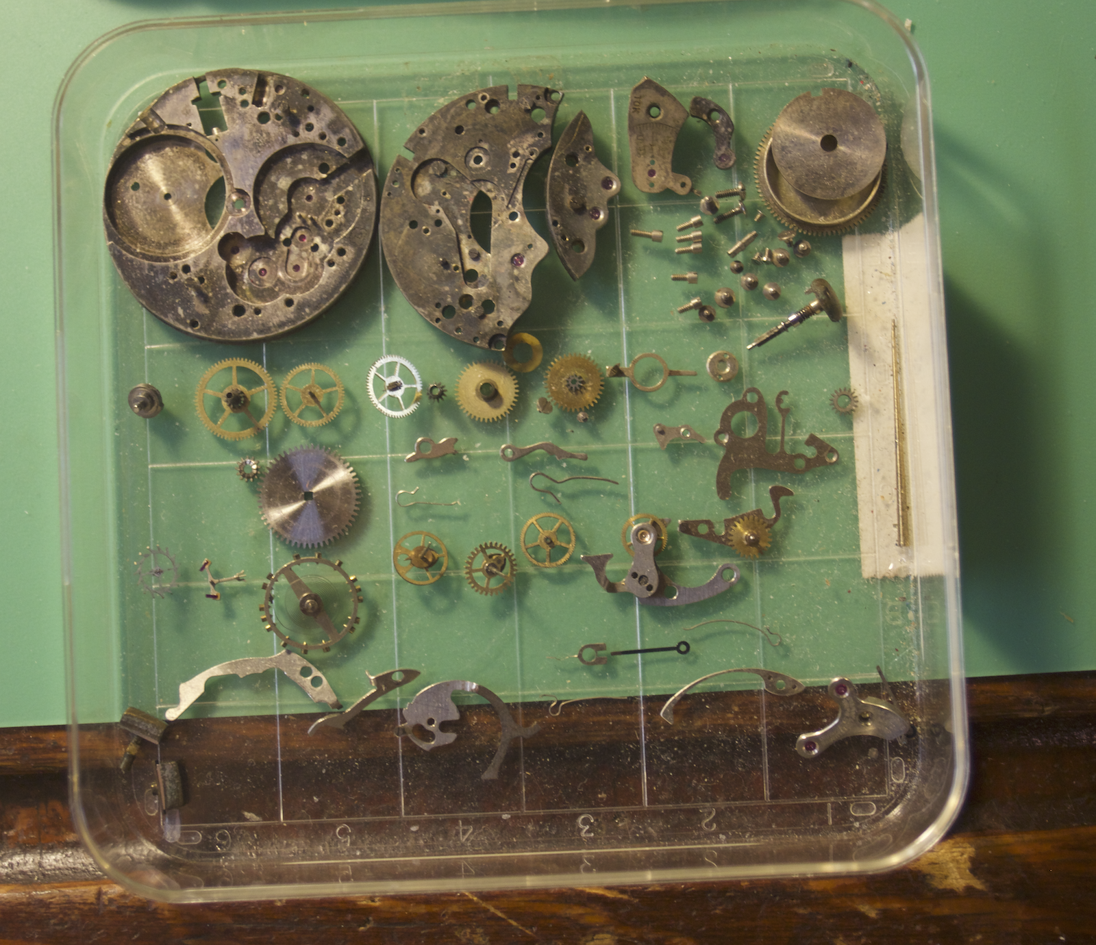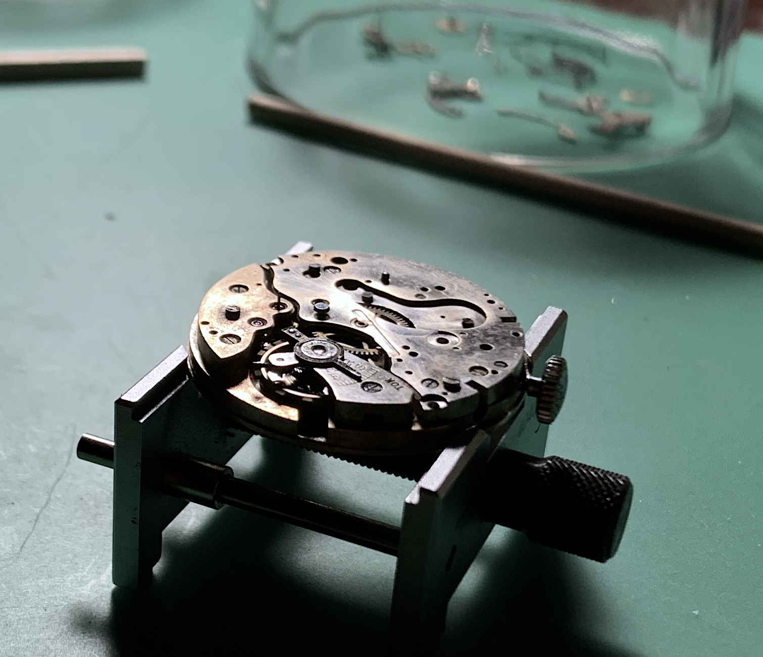 Working on this movement is like working on a clock after the Omega 650. I have also upgraded a few tools, like a good movement holder. So the NOS spring dropped into the barrel. and the train and bridges pretty much fell into place. I would have liked to get the set and motion works installed, but as I have noted I went down a rabbit hole. Which as I noted above I will have to clean the other balance bridge if I want to keep the frankenizing of these movements and cases to a minimum.