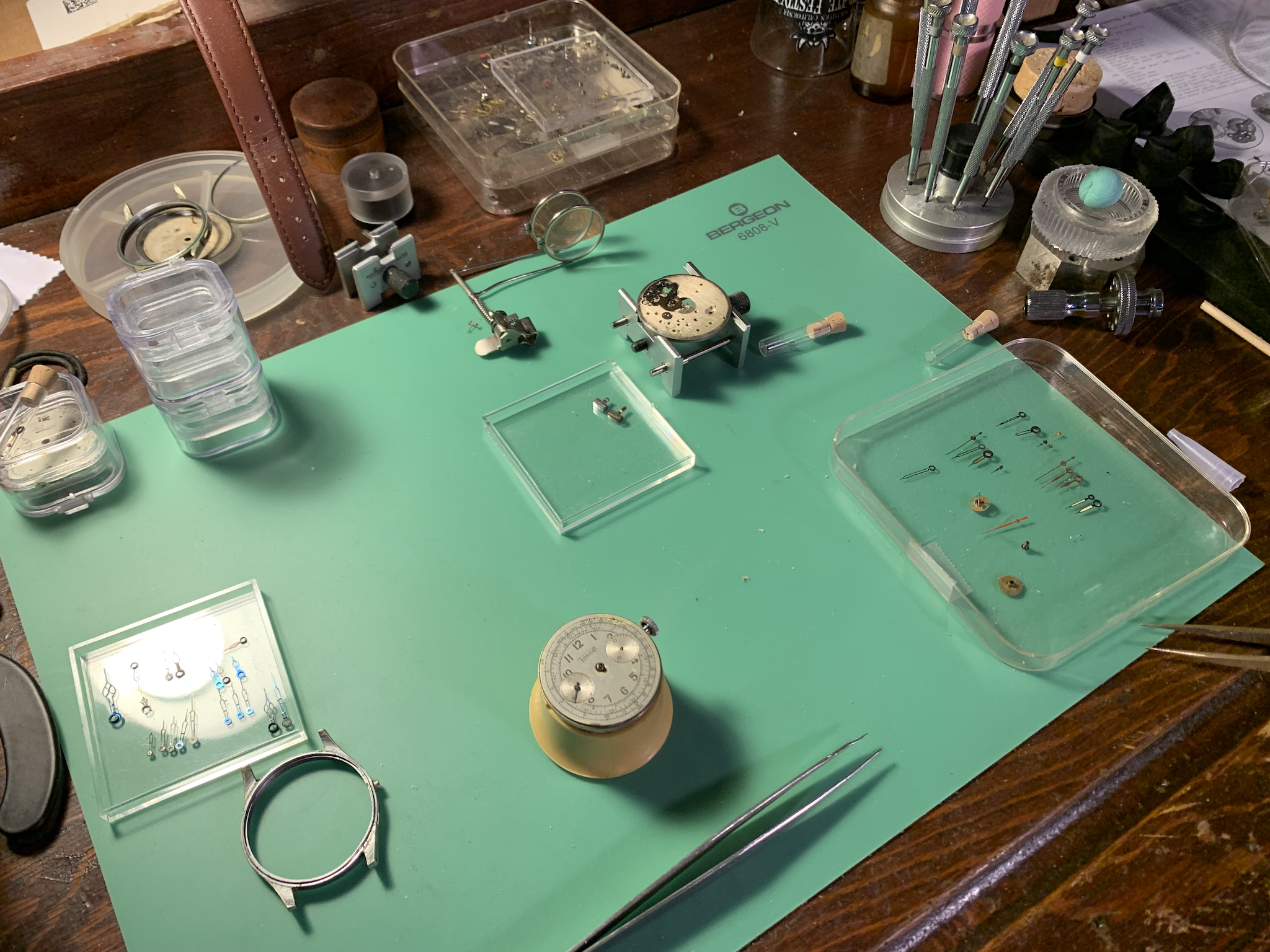 The next part is where things get interesting. I thought I had 7 Landeron 48 movements. One has some of the chrono stripped off. This it turns out is a Bovet, which is a rather well known brand, there are You tube videos which detail restoration of one of these. It also came clear from my Esembl-O-Graph books this is a Landeron 51. At least two of the other movements are also landeron 51. This leaves 4 Landeron 48 movements.