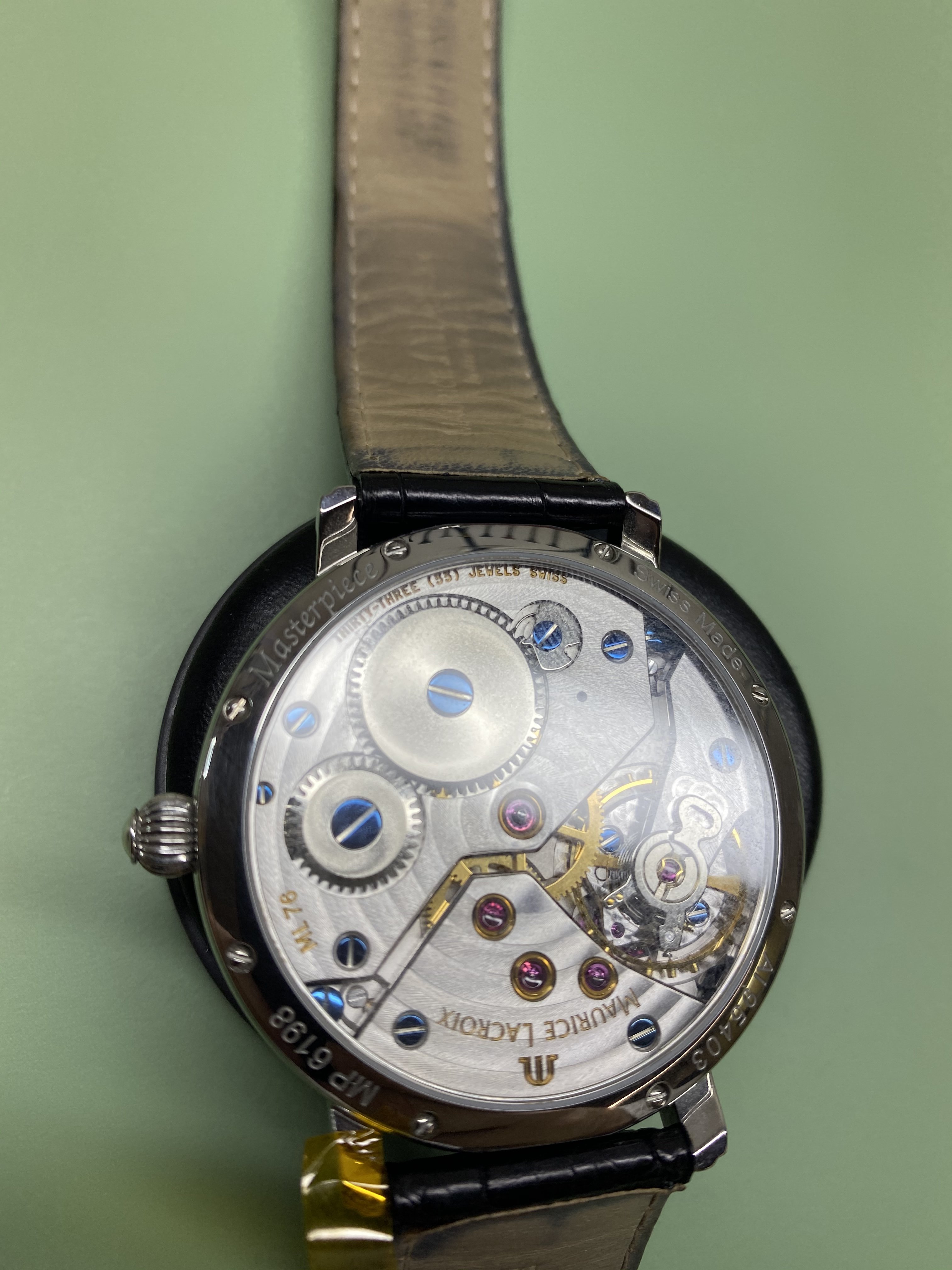 ··Omega Certified WatchmakerI recently was able to receive training on the Omega 861(more on that later) and the Maurice Lacroix Masterpiece Calendrier Retrograde. I acquired this watch recently from the original owner, it is from 2002, and has never been serviced. The amplitude was around 290 degrees full wind, however on inspection the jewels were mostly dry. Fortunately the previous owner said they didn’t wear it very often, so my hope was nothing was torn up from running dry.