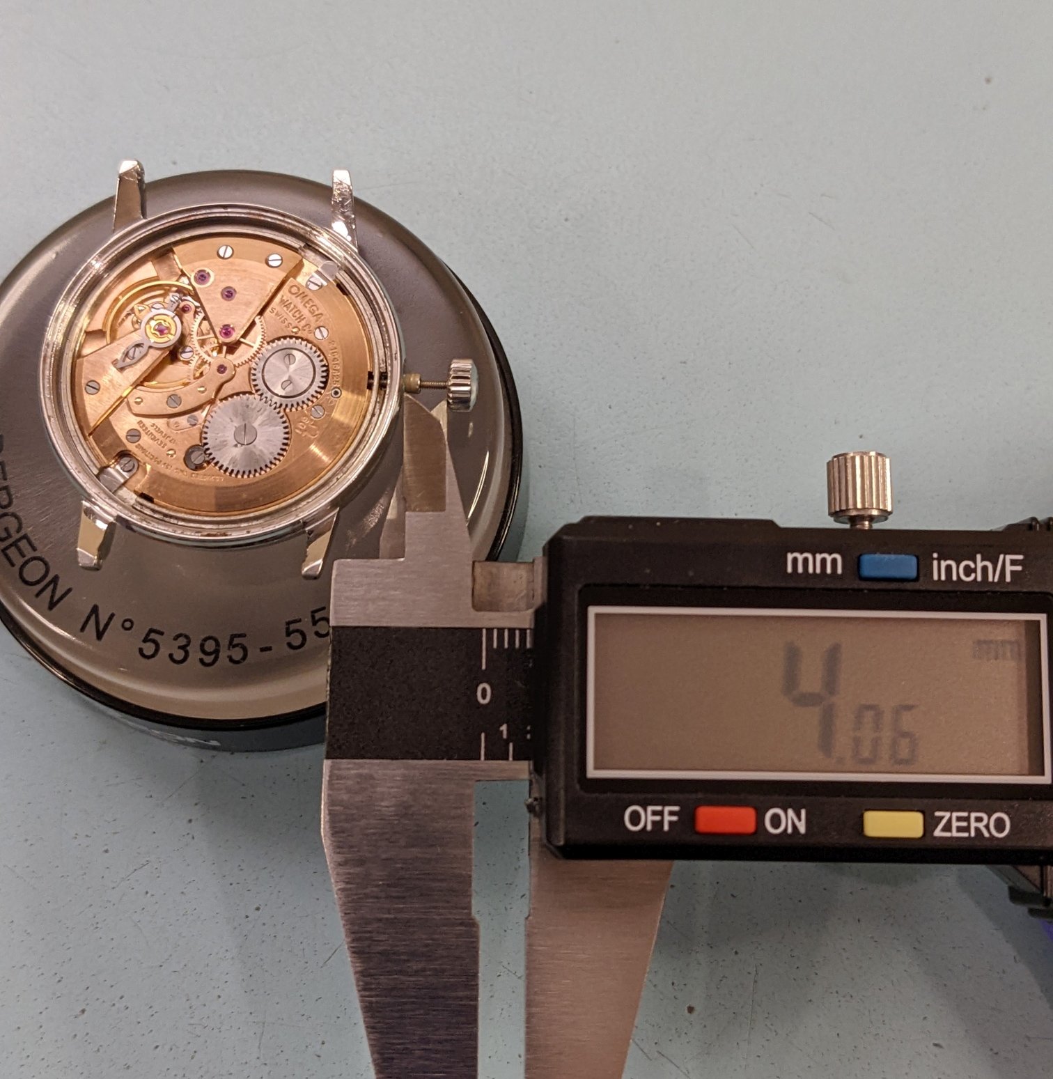 Gauging how much the stem needs to be shortened by in order for the inside of the crown to fit flush against the case.