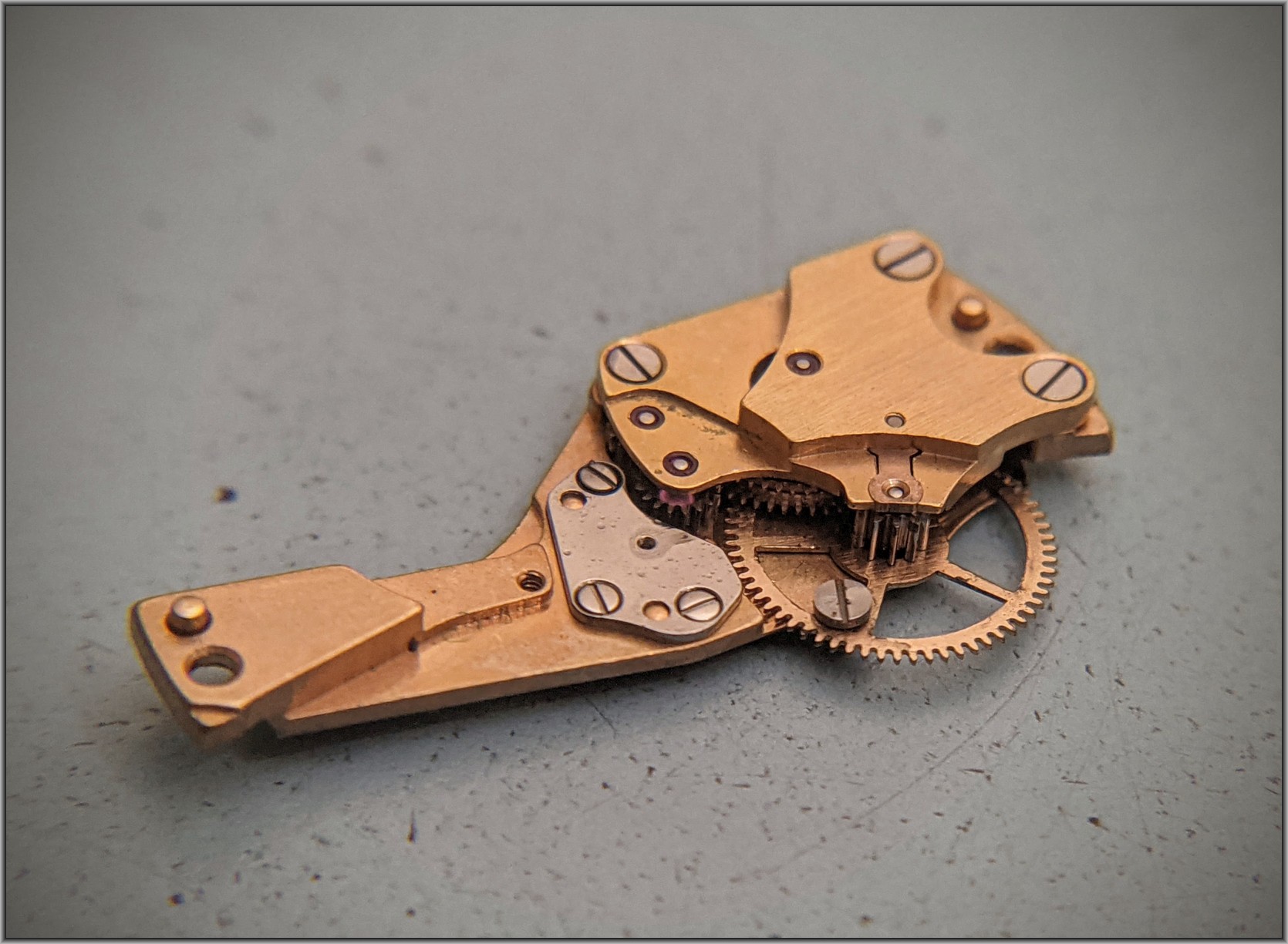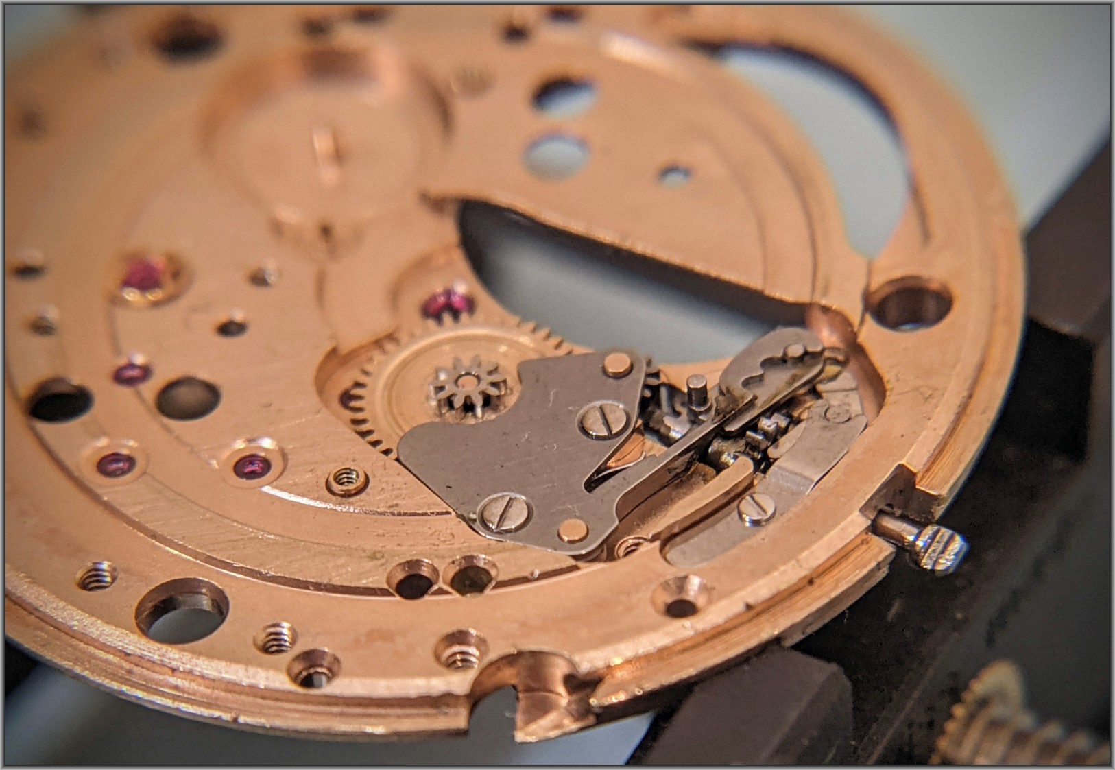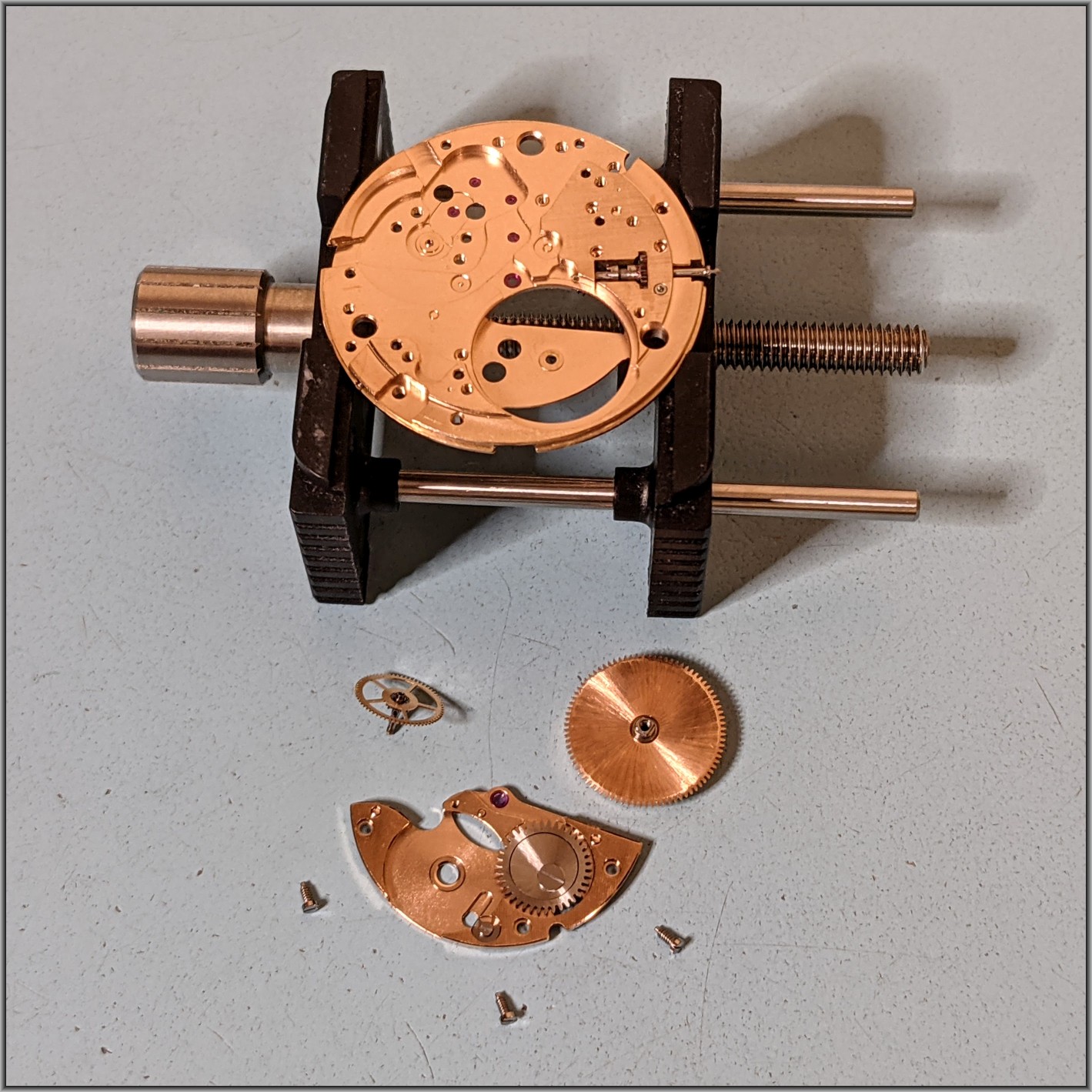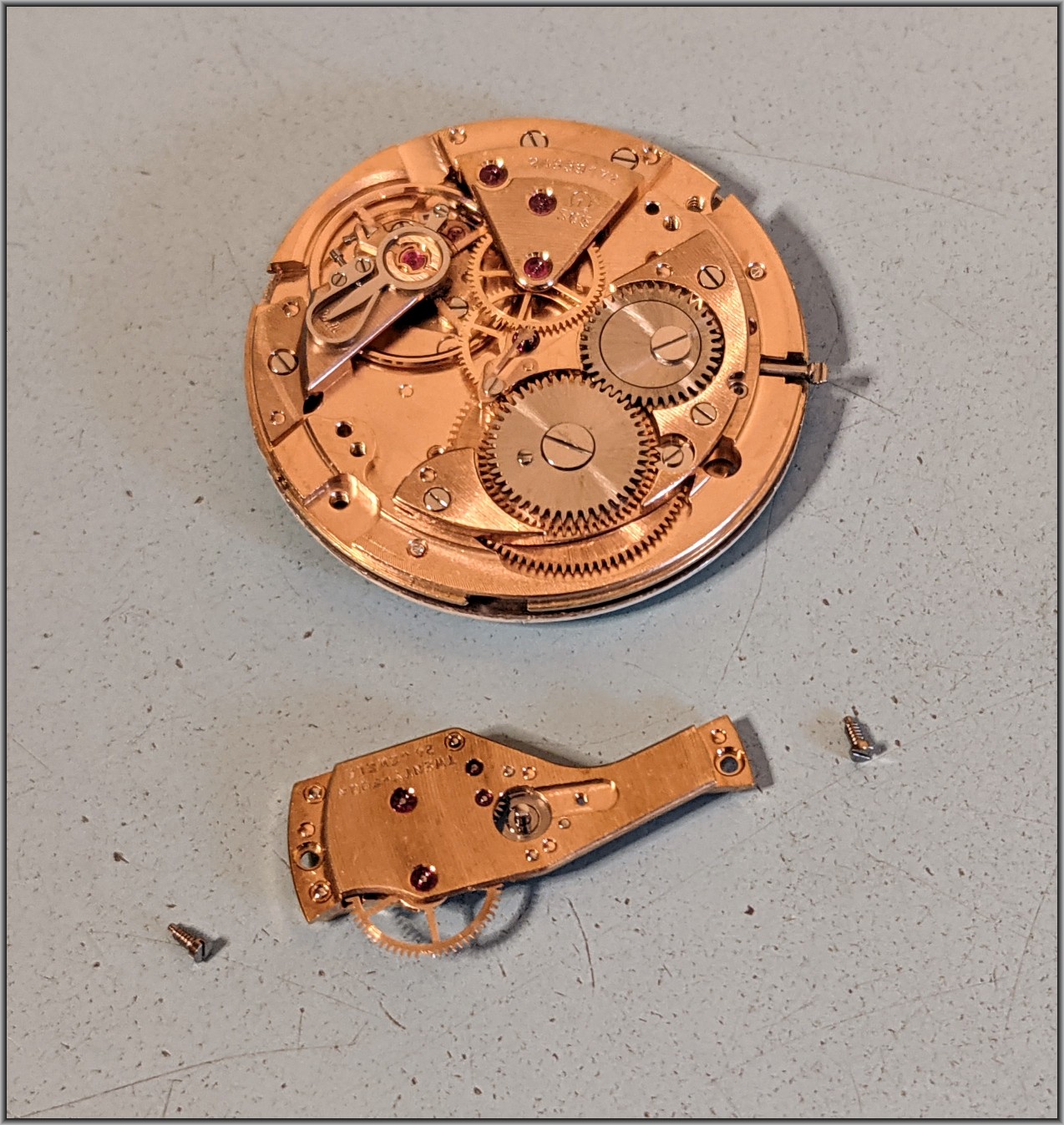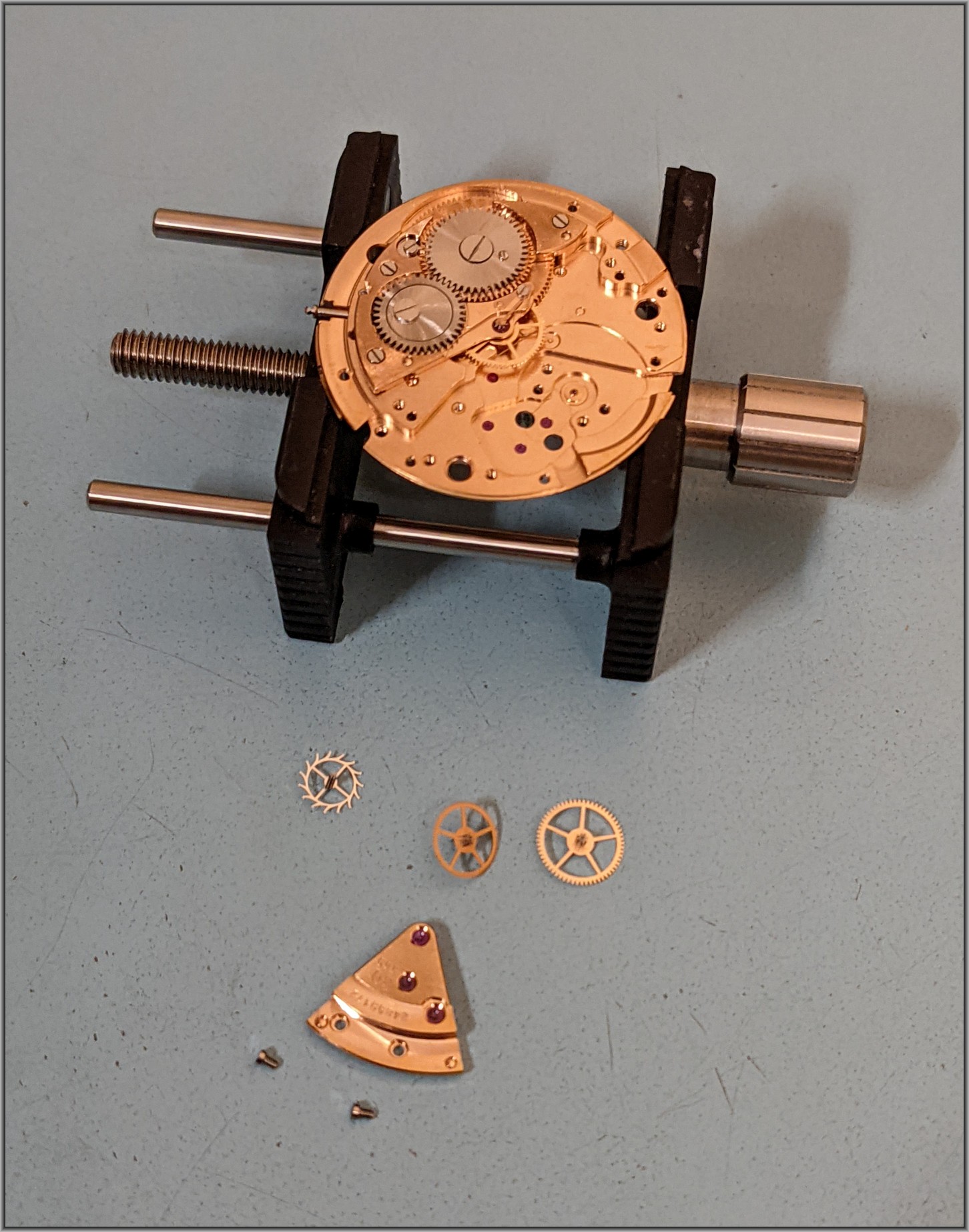 The intermediate winding drive wheel is what took the damage from those stray parts. This part is not salvageable, but was able to find a used whole auto-wind mechanism at a reasonable cost to serve as a parts donor.