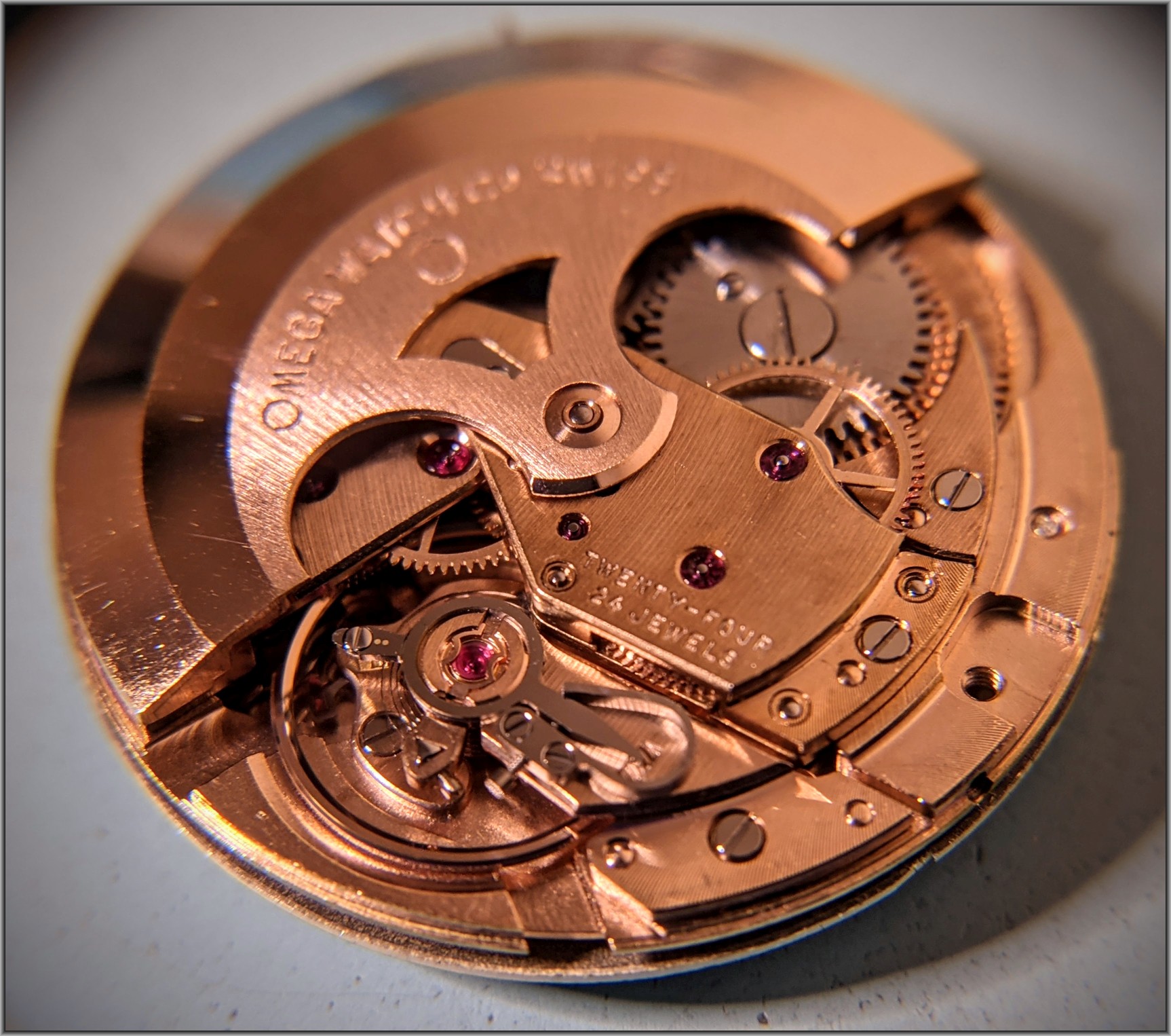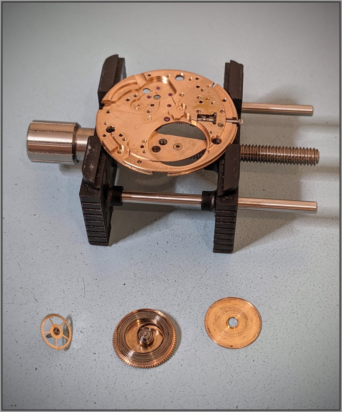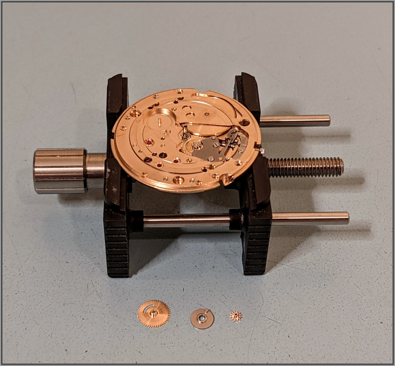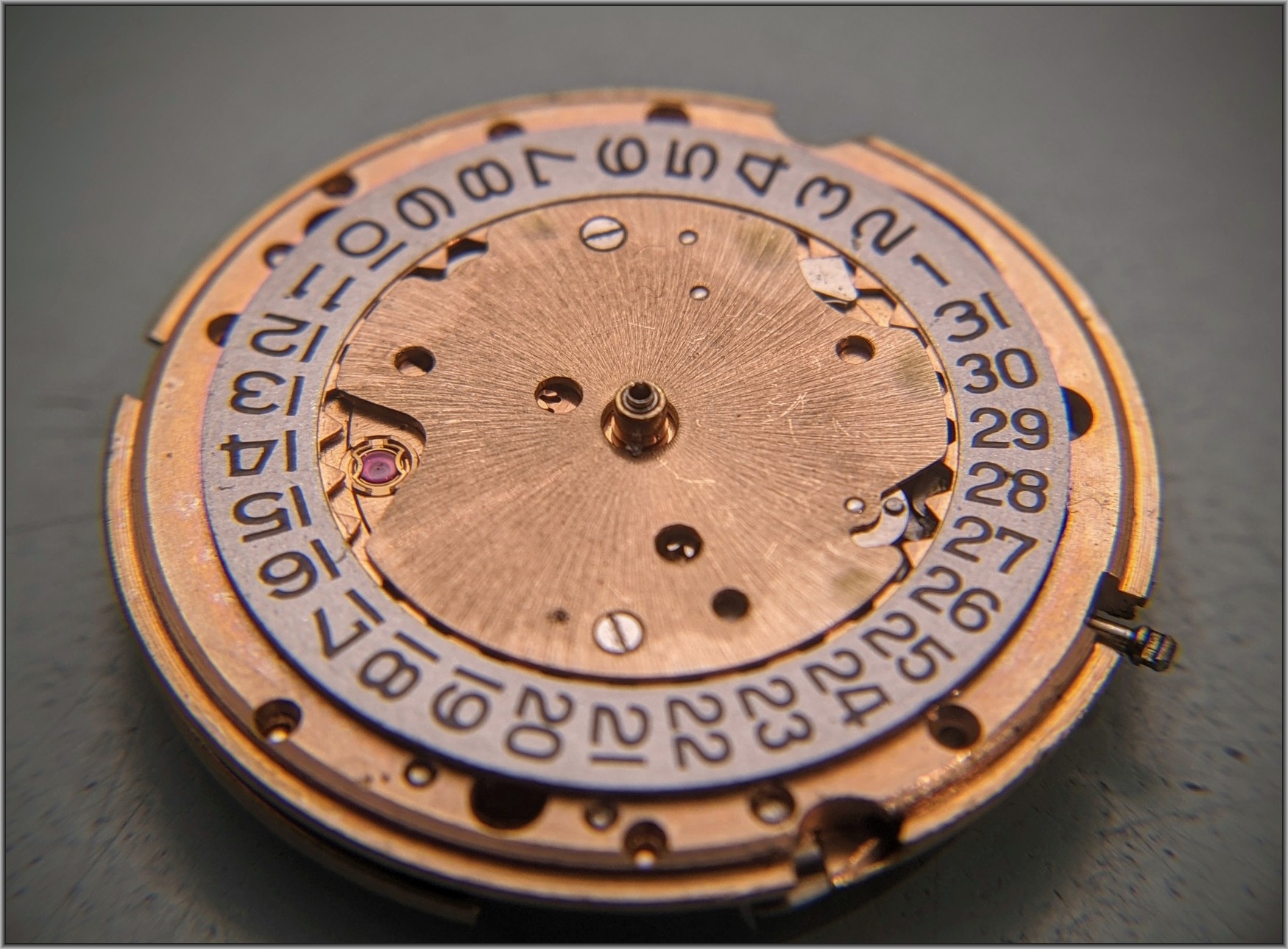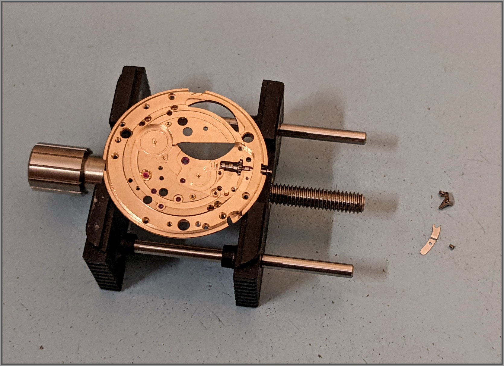 The intermediate winding drive wheel is what took the damage from those stray parts. This part is not salvageable, but was able to find a used whole auto-wind mechanism at a reasonable cost to serve as a parts donor.