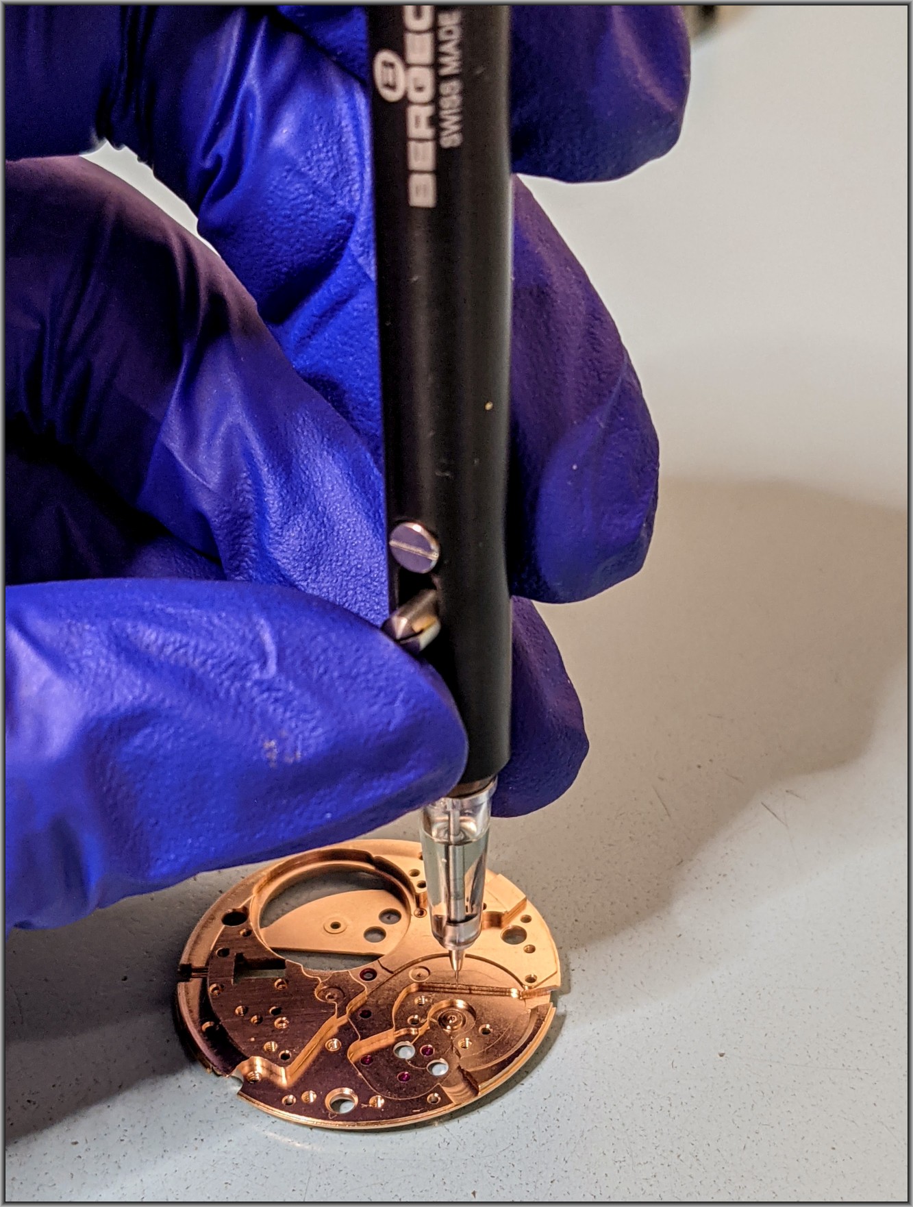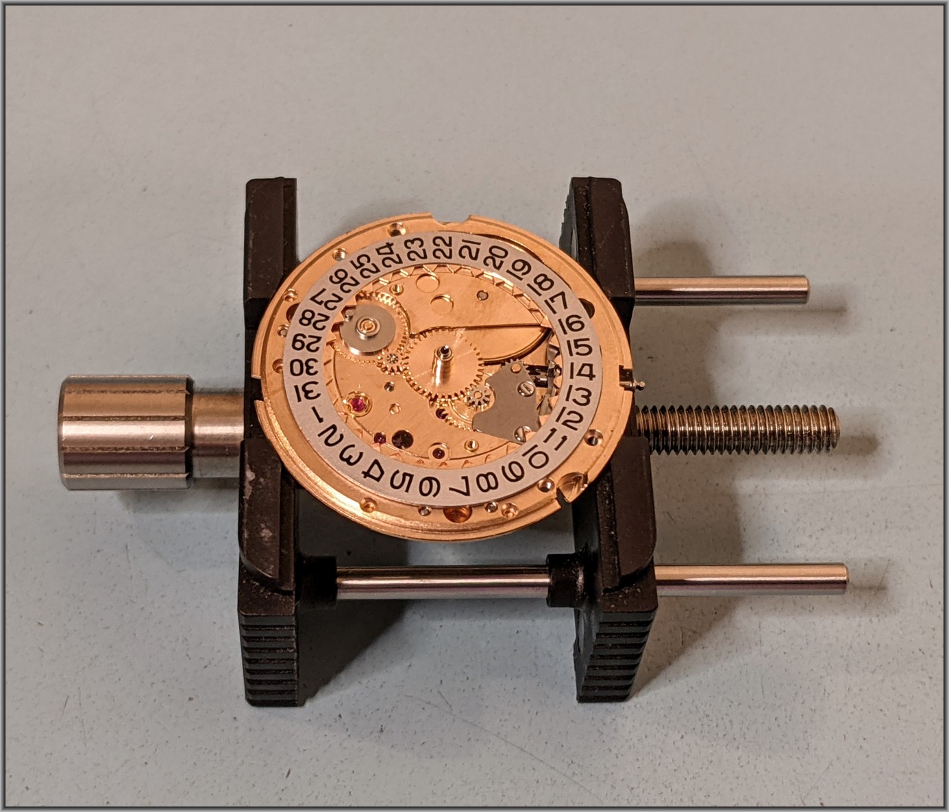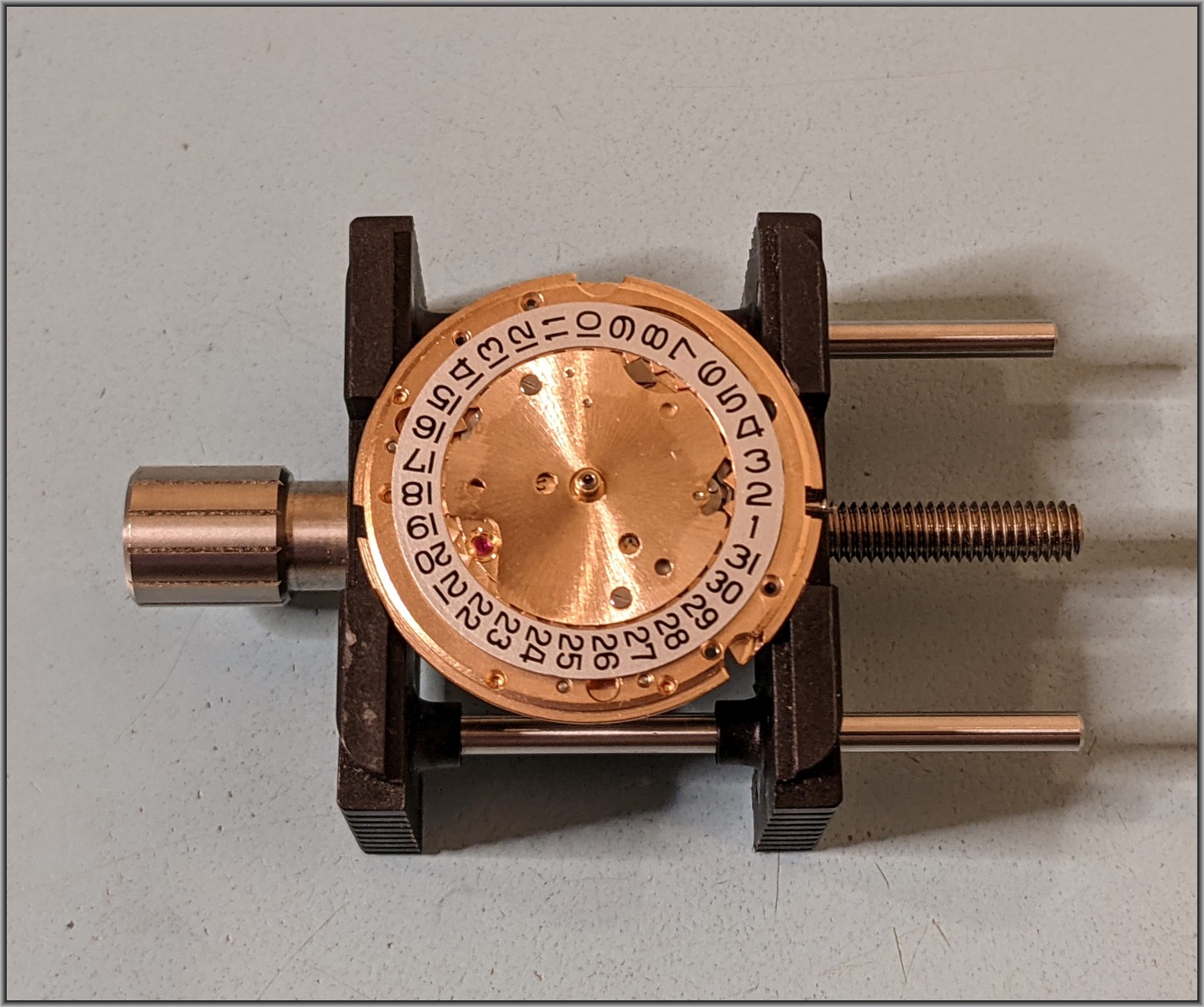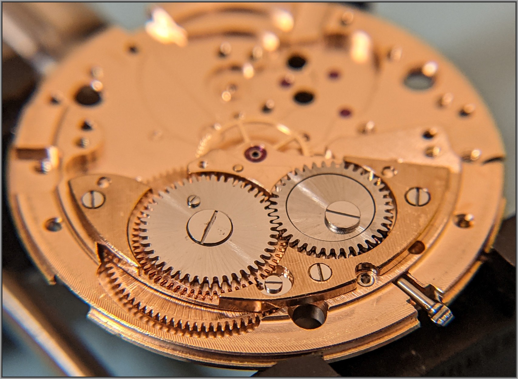 So how much damage has been done by steel pinions turning brass wheels when the brass wheel aren't going to move?... The brass leaves are tiny, & no match for the steel pinions of the automatic winding mechanism. Damage done, let's see how bad.