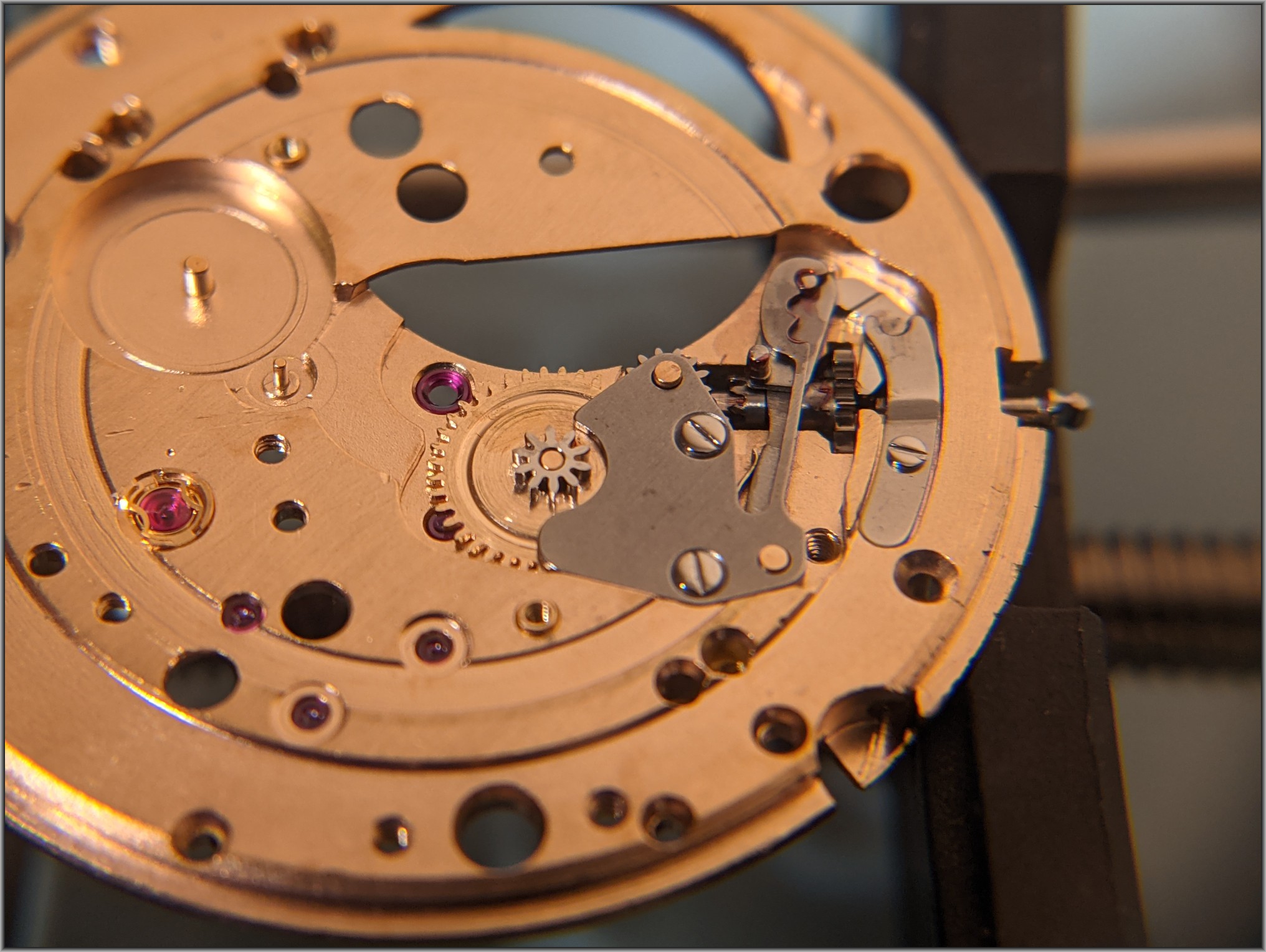 Clutch, winding pinion, & winding stem. Grossly excess oil (doesn't smell great, either...).