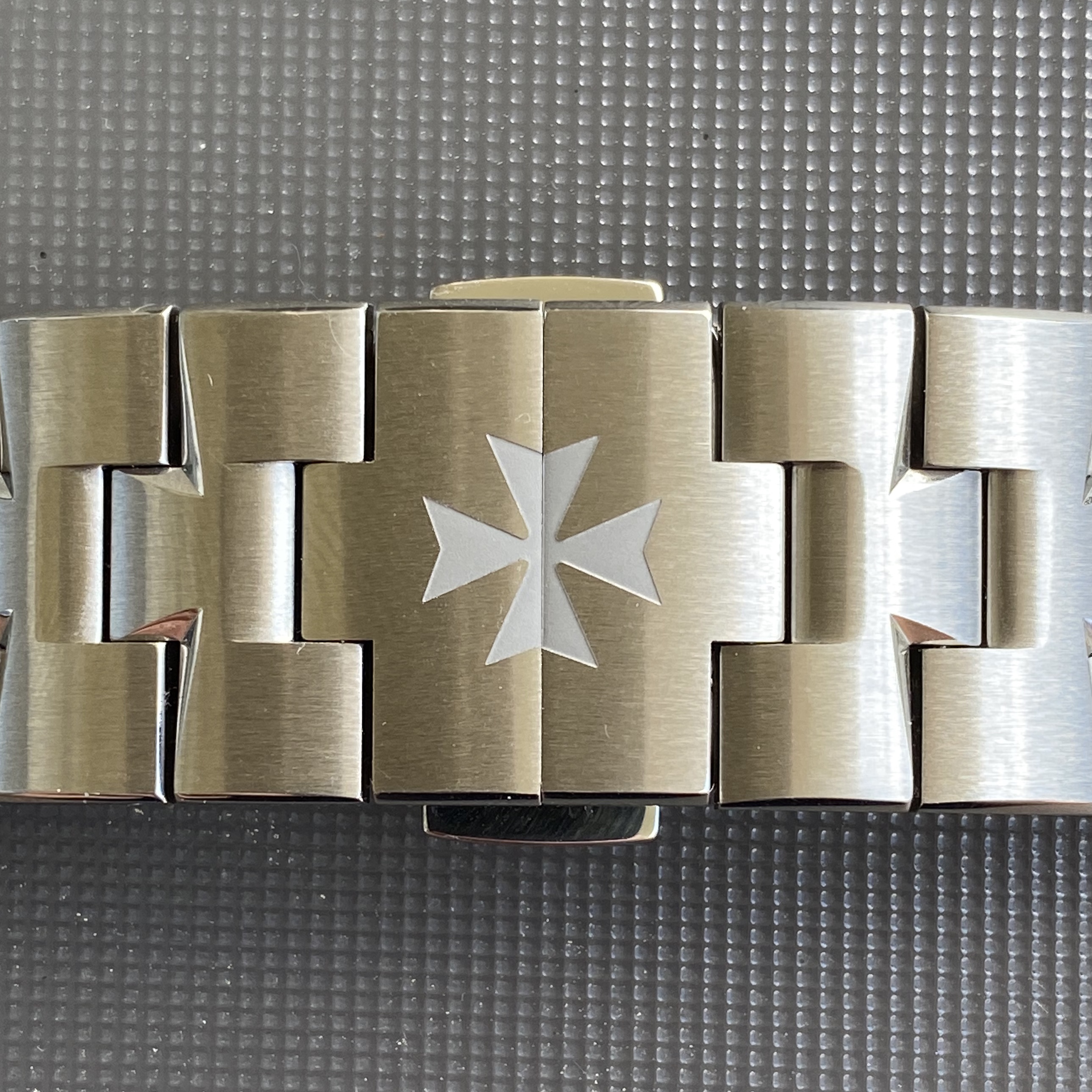 The dial, protected by sapphire crystal with anti-reflective coating on both sides, is framed by the round inner edge of the partly polished, partly satined bezel. The striking bezel is obviously inspired by the Maltese cross - the logo and trademark of the brand for many years - and contributes to the sporty and distinctive appearance of the overseas.