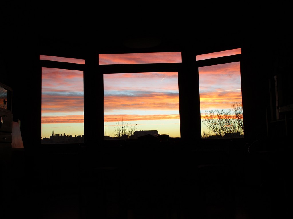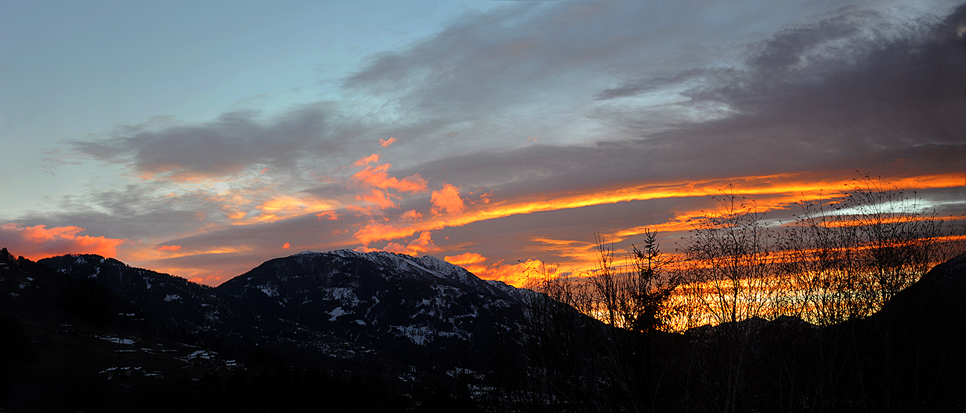 I thought to share a rare panoramic view from my window which is visible only in high winter (from around X-mas to mid of Jan.) when clouds are present while the sun rises (still hidden) behind the mountains. Always an enjoyable start into the day...
