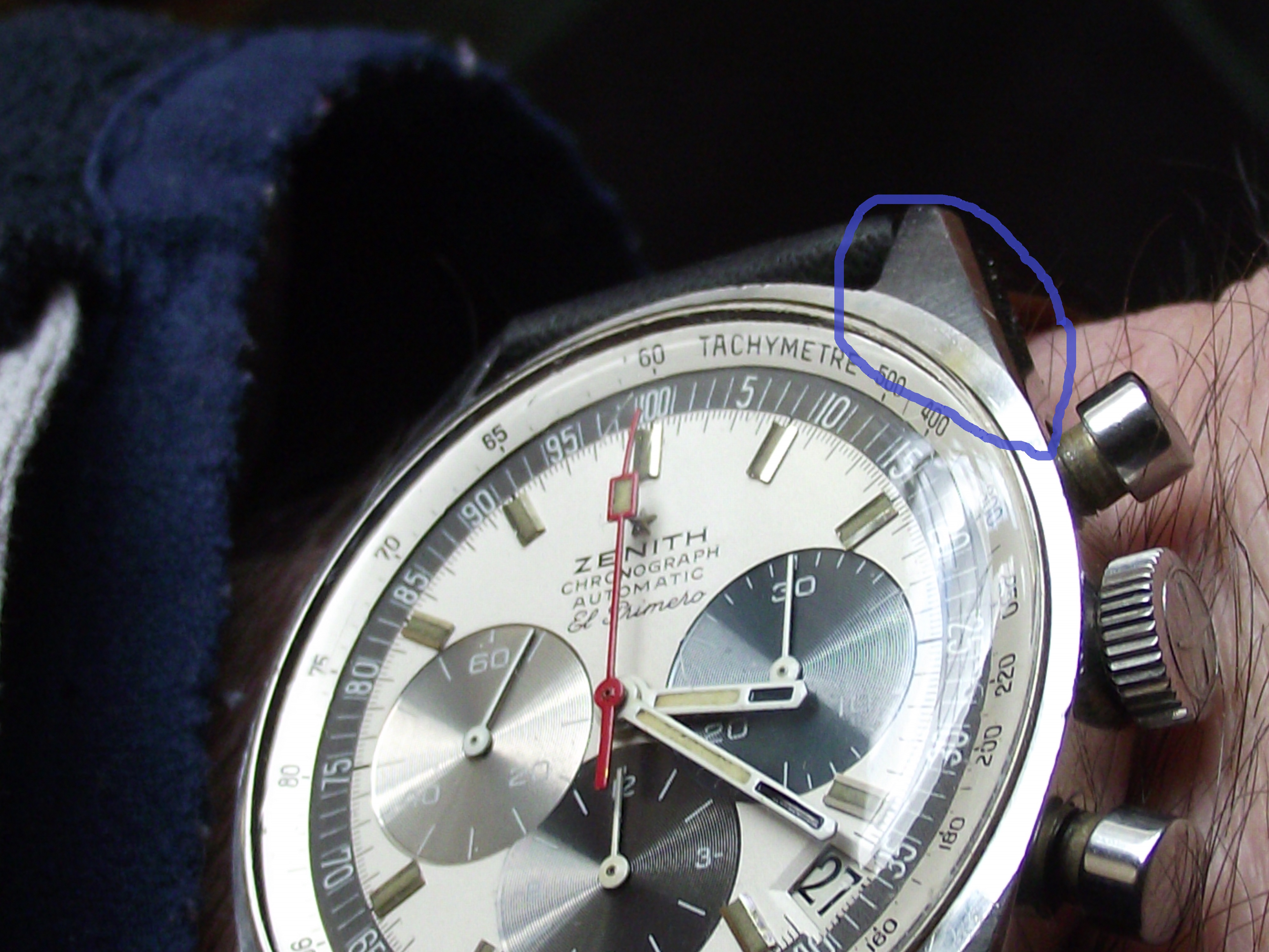 If you study the case from the front you can see at the point where the lugs meet at the top of the case, the lugs spill over onto the top of the case uninterrupted. Also the bevel edges on the side of the lugs run the full length of the lugs up as far as the top of the case. These features give the mark I case a far smoother flatter look than the mark II & mark III cases which have a groove on the lugs at the point where they meet the top of the case. This groove also acts to interrupt the bevel edge on the side of the lugs from running the full length up as far as the top of the case/bezel.