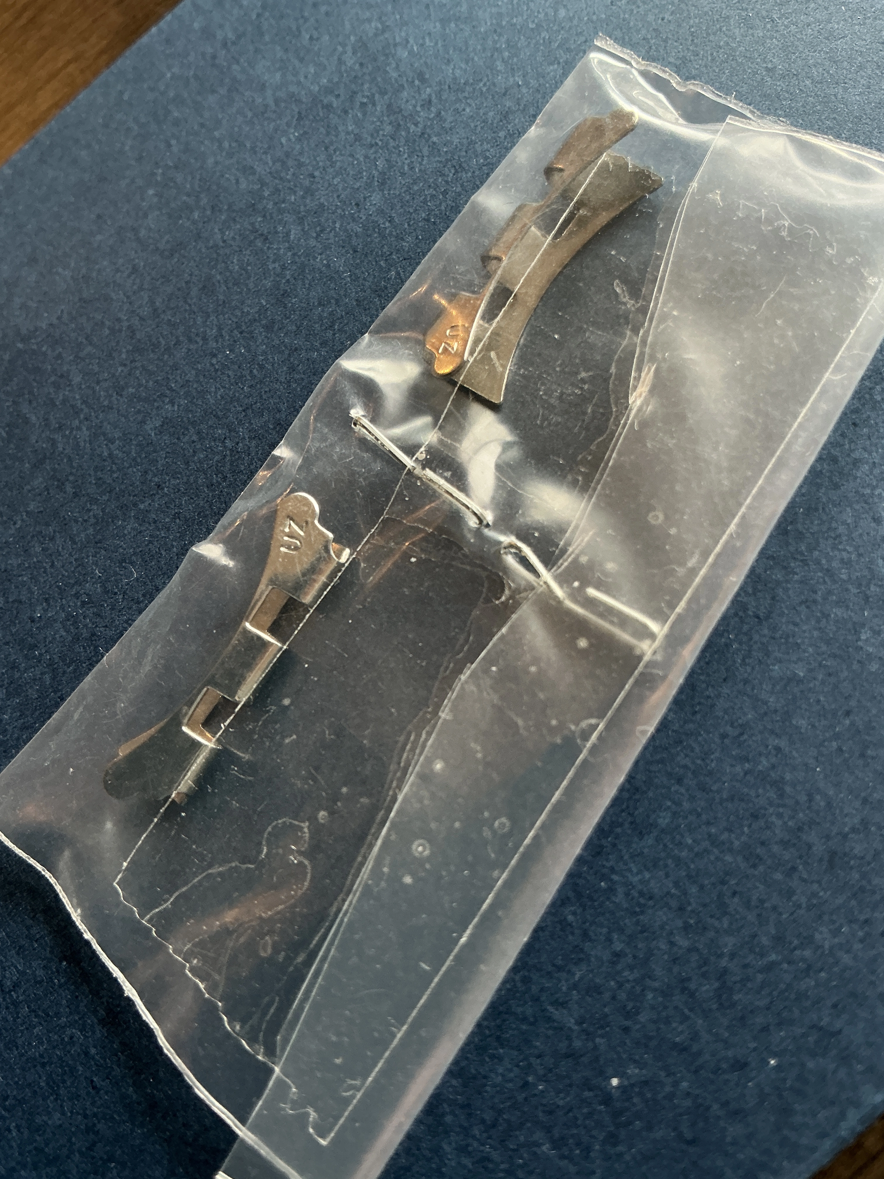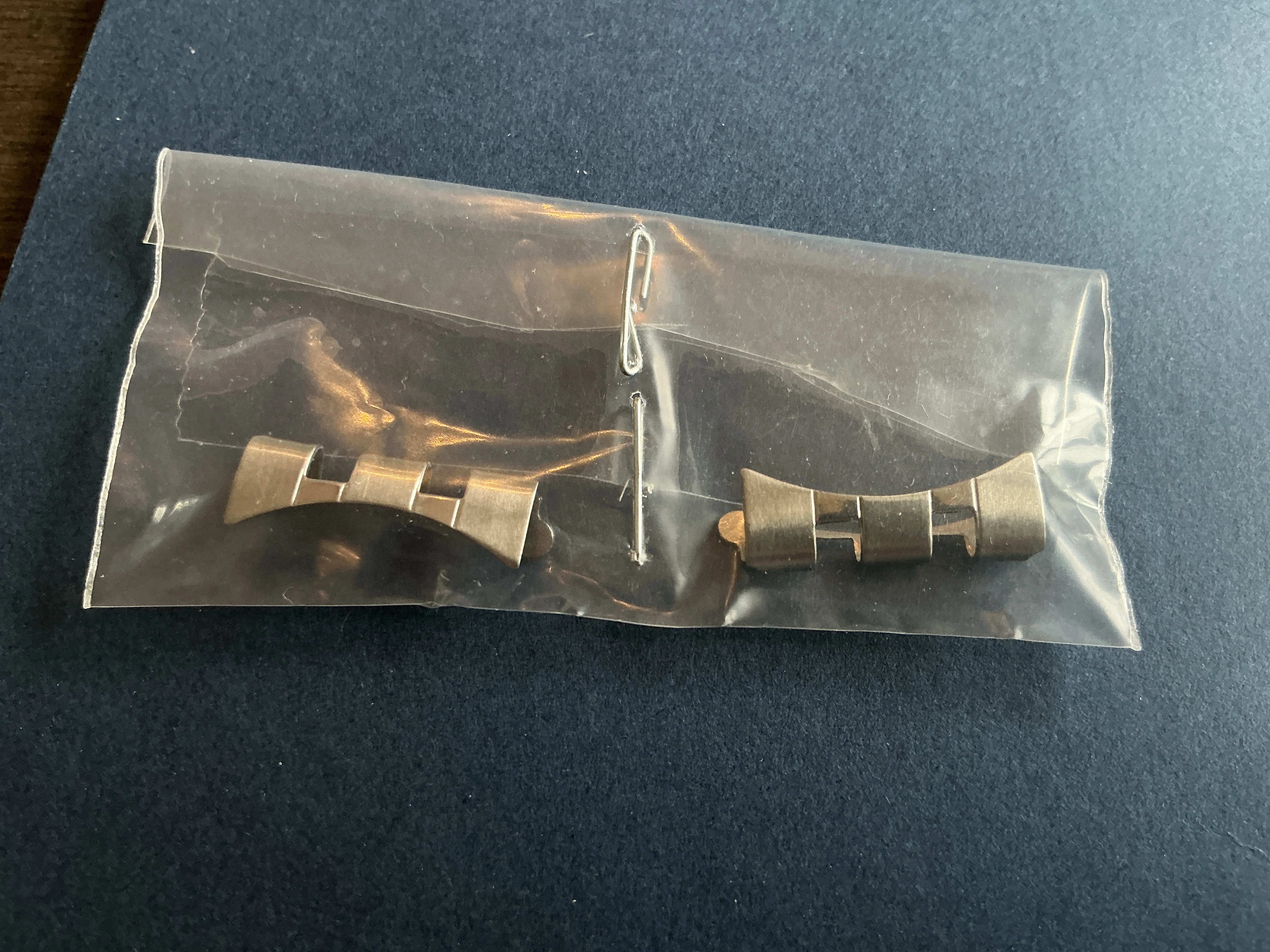 | Incredibly rare, brand new and unworn pair of “UZ” stamped end links for Universal Geneve Gay Freres bracelet. Will fit the lugs of any 19mm Universal Geneve (measurement of the endlinks is about 18.8mm wide), from Polerouters to 1960s Tri-Compax and Ninas (note: fit to the curvature of the case will vary among various models, of course). Please feel free to ask any questions, as all sales are final. I’ll pick up the cost of any domestic shipping in the USA. Cost of any international shipping to be discussed with buyer. |