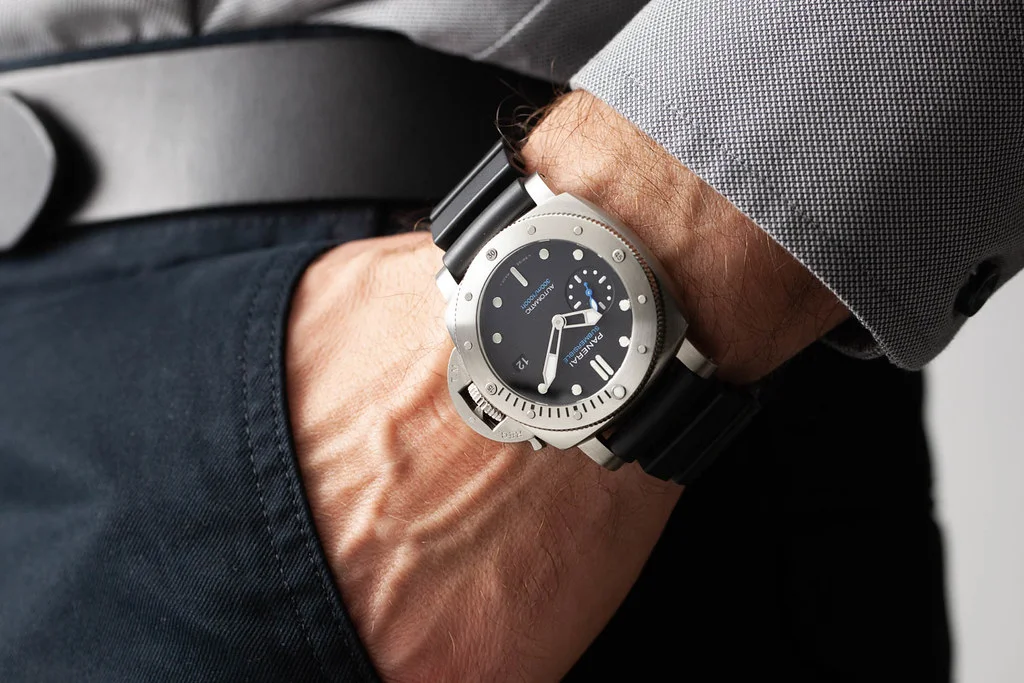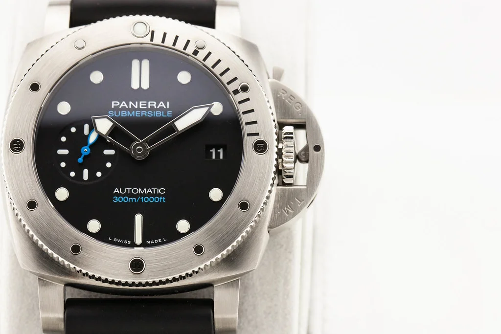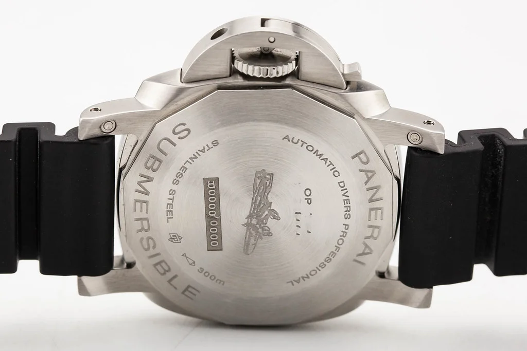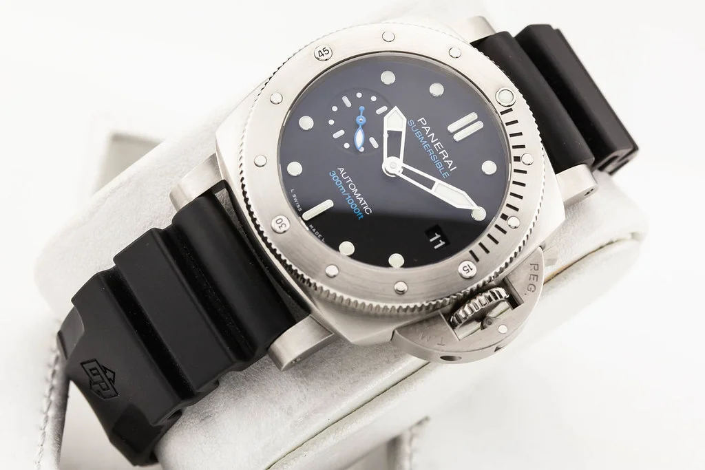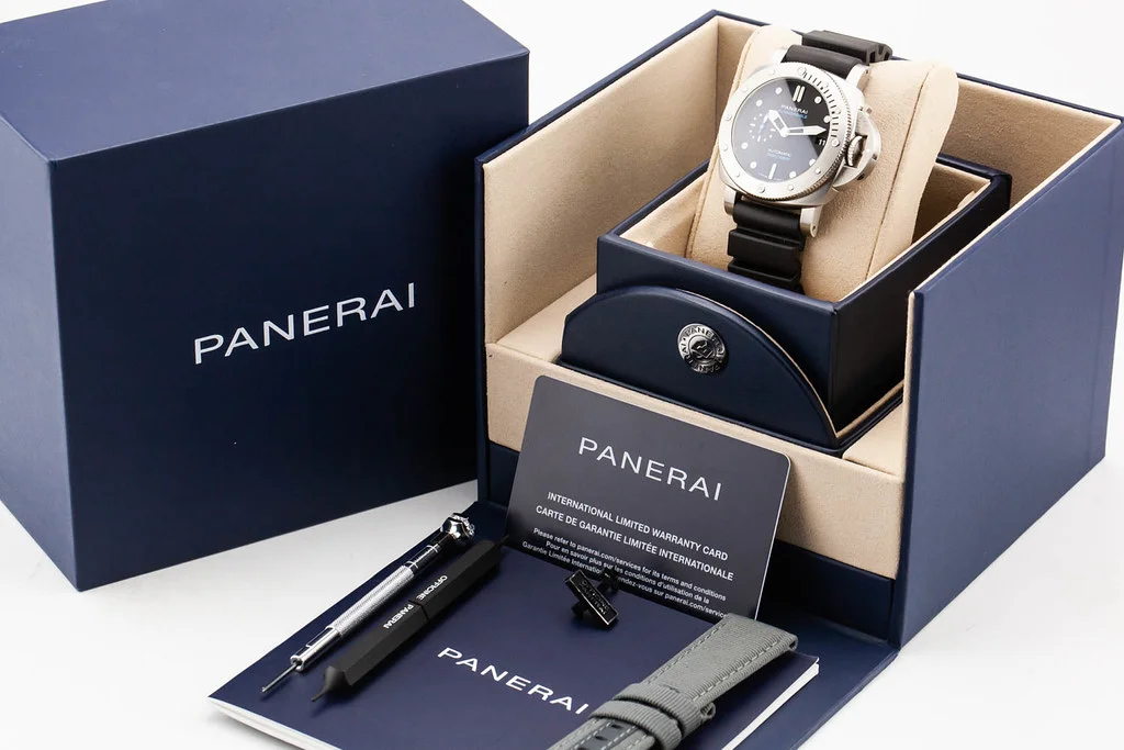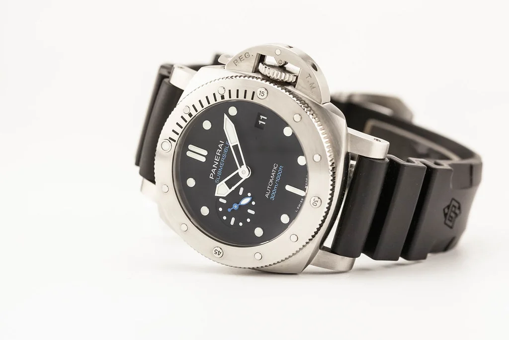 ยทUp for sale is an excellent condition Panerai Luminor Submersible 42mm Automatic 2973 on Rubber Strap, reference # PAM02973. It comes complete with all boxes, papers, booklets, tools, fabric strap and Panerai Warranty Card dated September 2024.