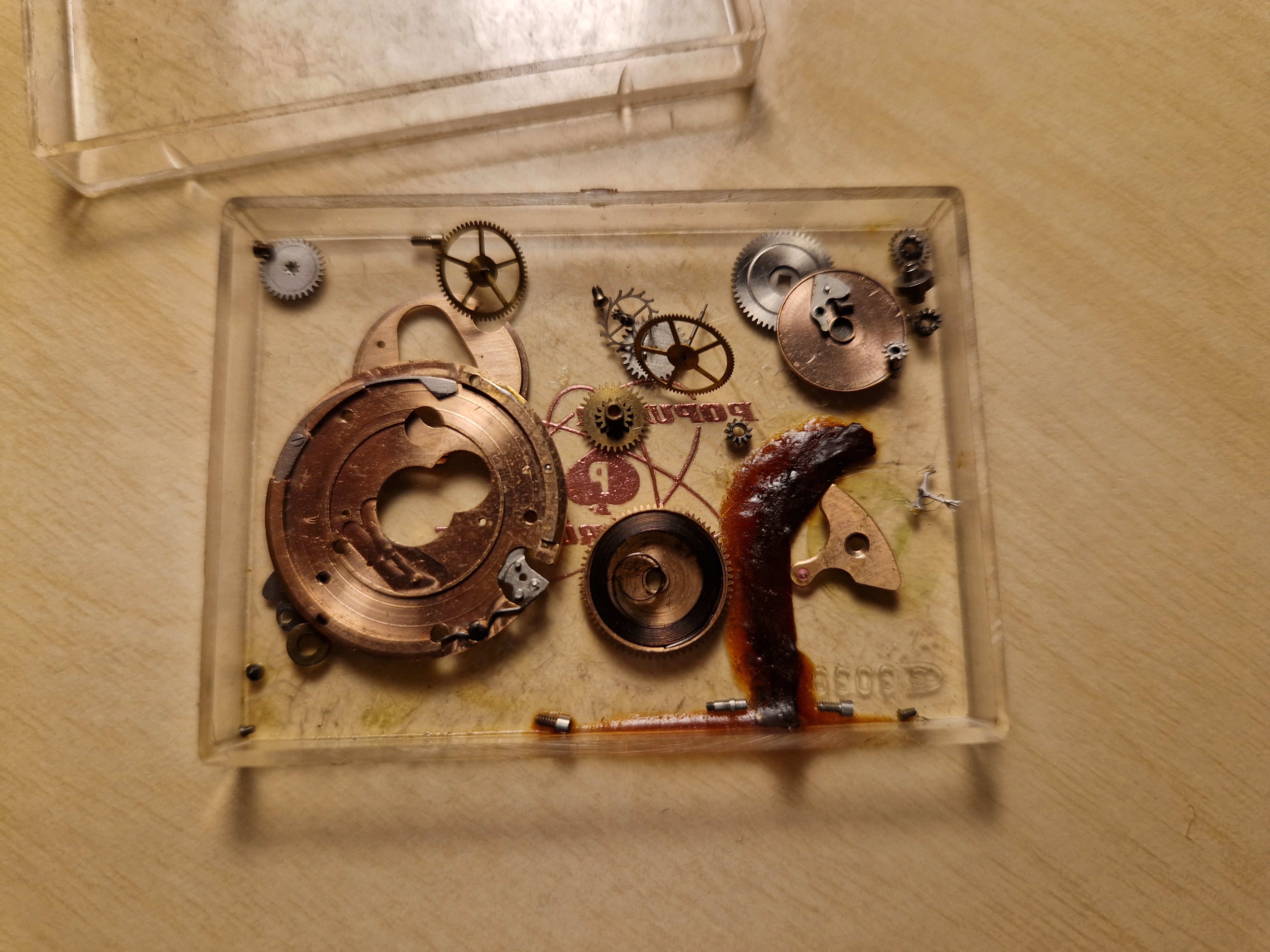 What I see us a calendar plate, some barrel parts and some winding setting parts. There are slso som center seconds wheels. Someone also splled grease and oil into the box. There is an escapement too.