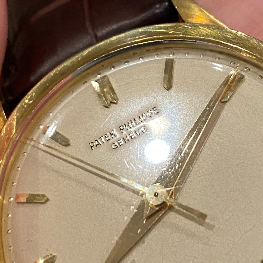 From what research I've done, the dial 'printing' is not actually printing. Instead of the standard use of tampography on a flat surface, vintage Patek Philippe dials used a process called 'champlevé,' where the script was first engraved, then filled in with vitreous enamel. This is why the script lacks serifs, and why it appears slightly raised.