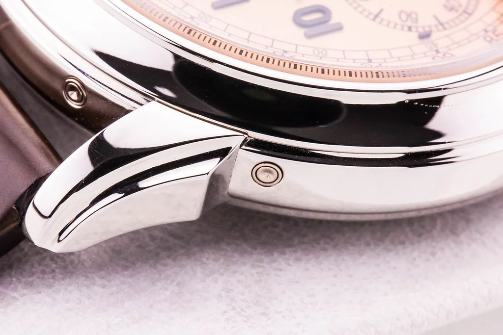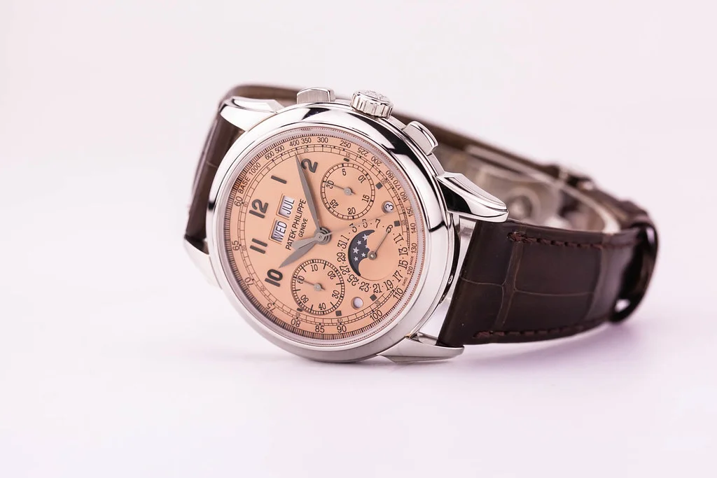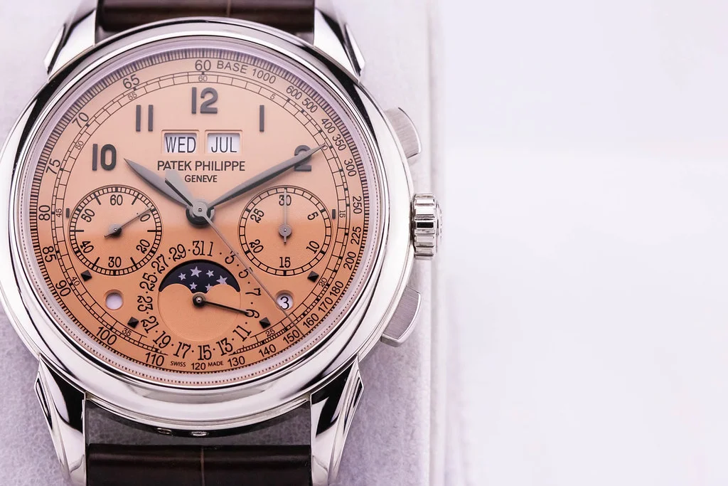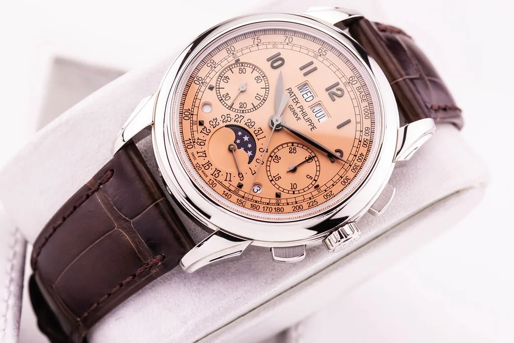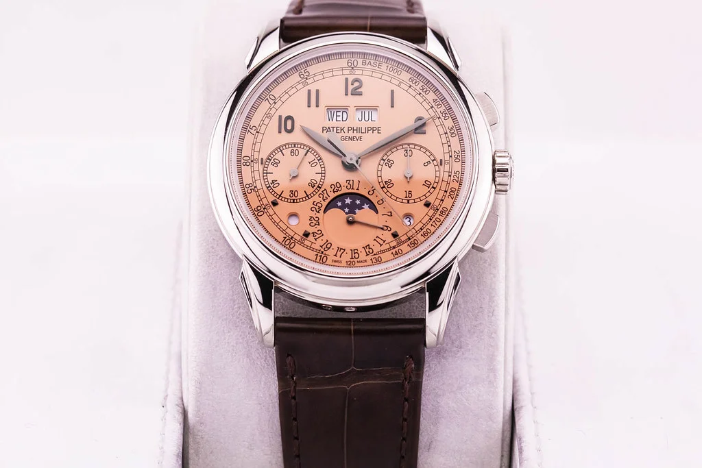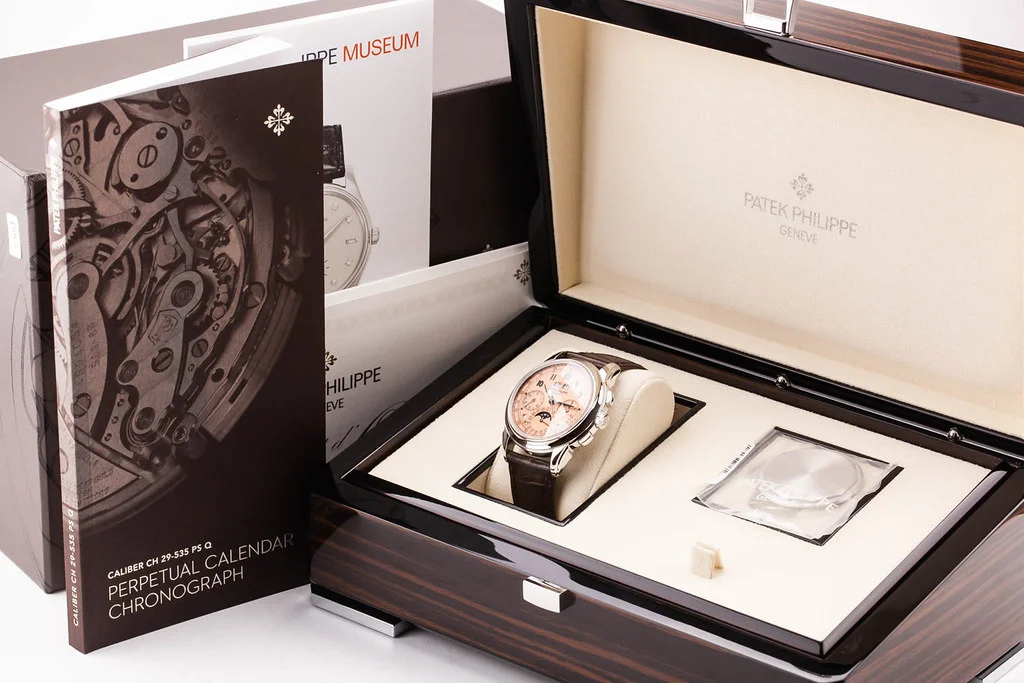 ·Up for sale is an excellent / near mint condition Patek Philippe Perpetual Calendar Chronograph Platinum 41mm Salmon Dial on Alligator Leather, reference # 5270P-001. It comes complete with all boxes, papers, booklets, and Patek Philippe Certificate of Origin dated August 2021.