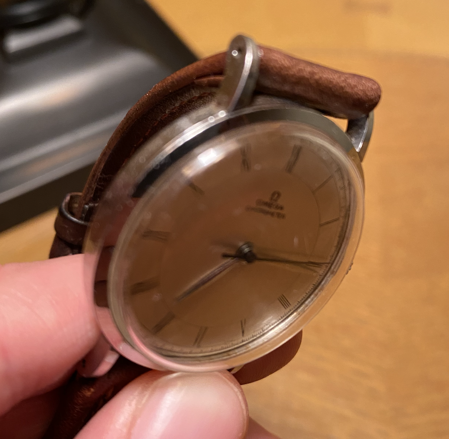 Looks pretty obviously like a fake Omega to me. Most obviously fake from the lack of photos of the 50 cent quartz movement? I am not sure why anyone would think some Ukrainian might re-dial a fake watch?