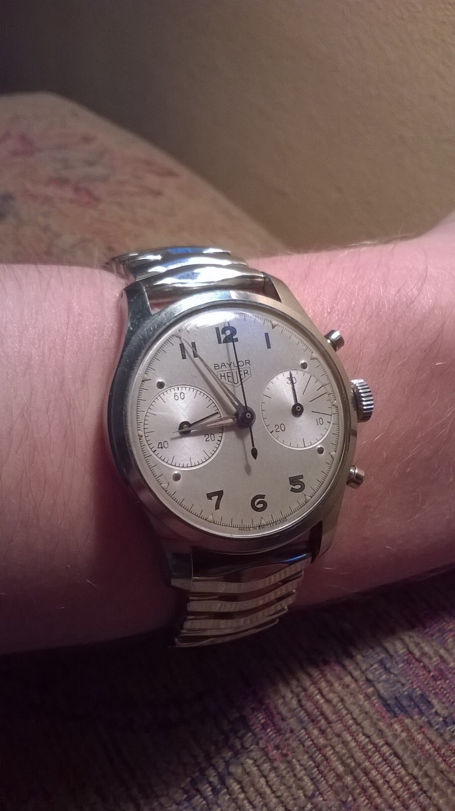 It is a Baylor heuer and is mechanical. Inscriptions on the inside of the metal bracelet say "champion USA" "lance statues" and "USA pat 2249086". It also says JB on the inside of every link.