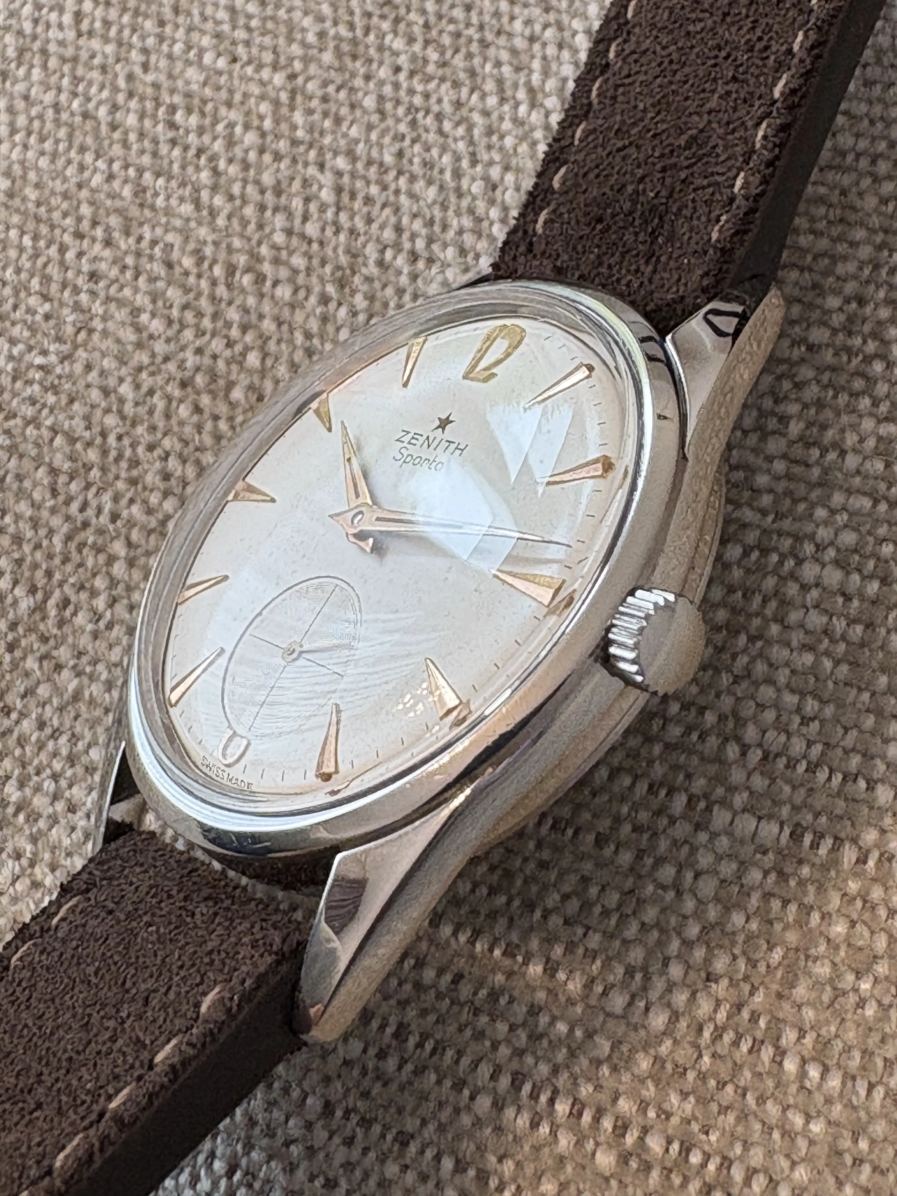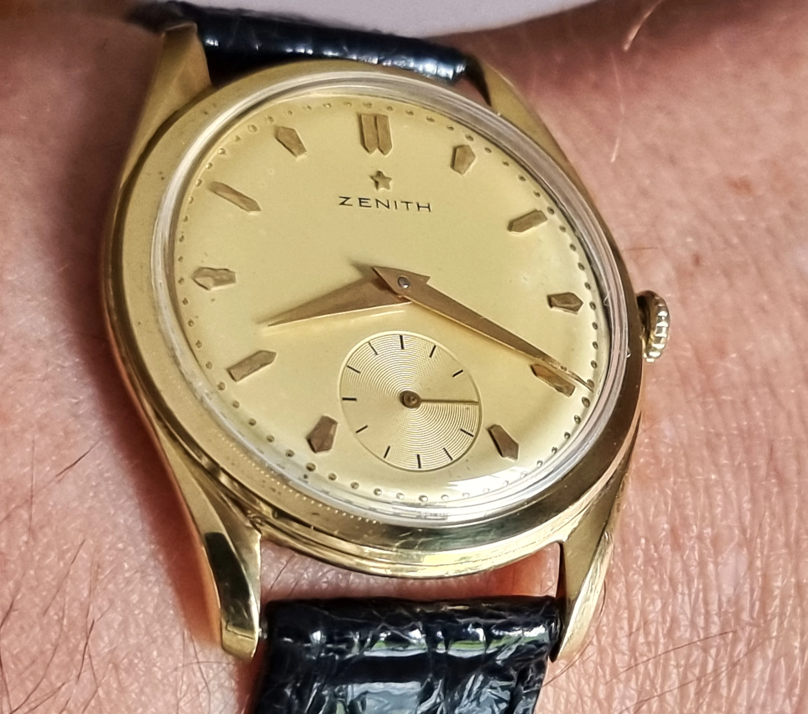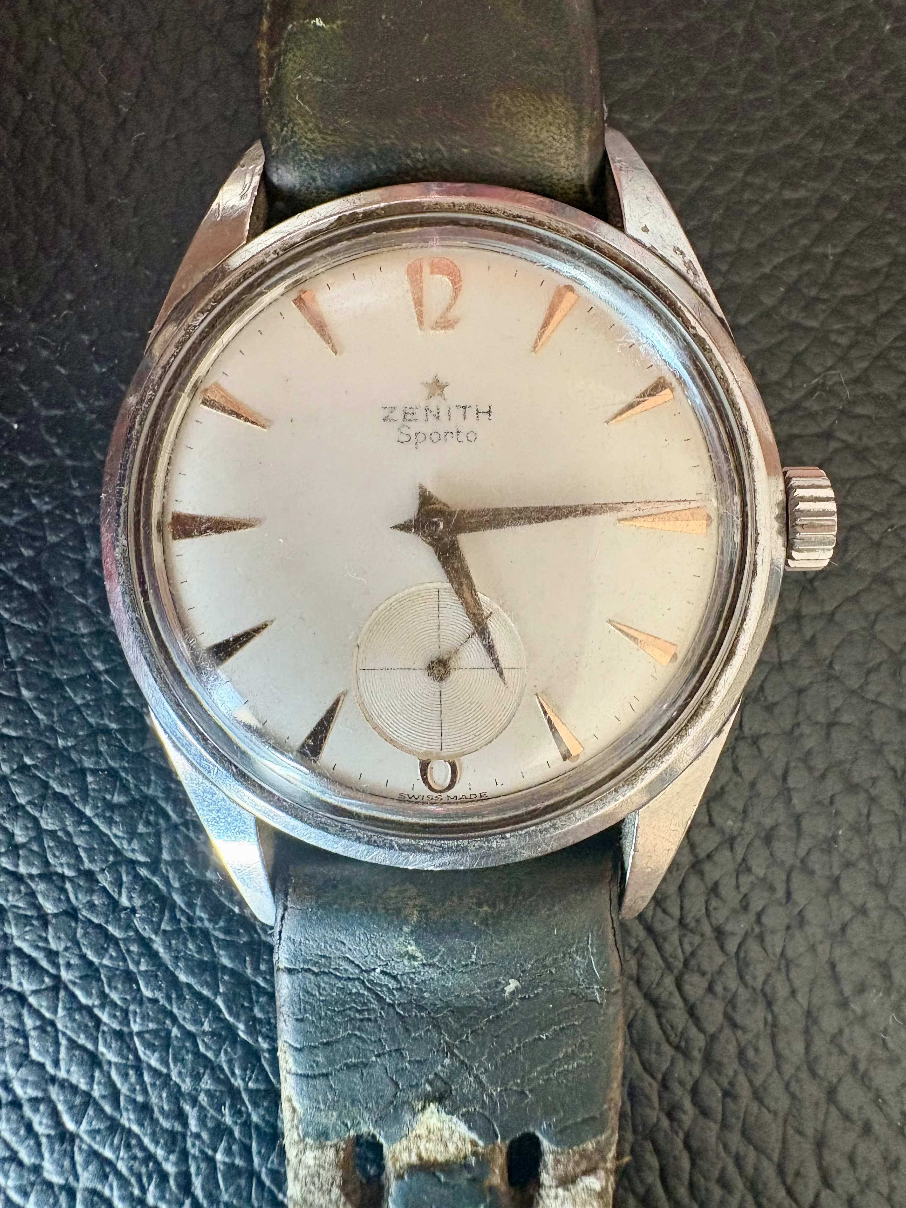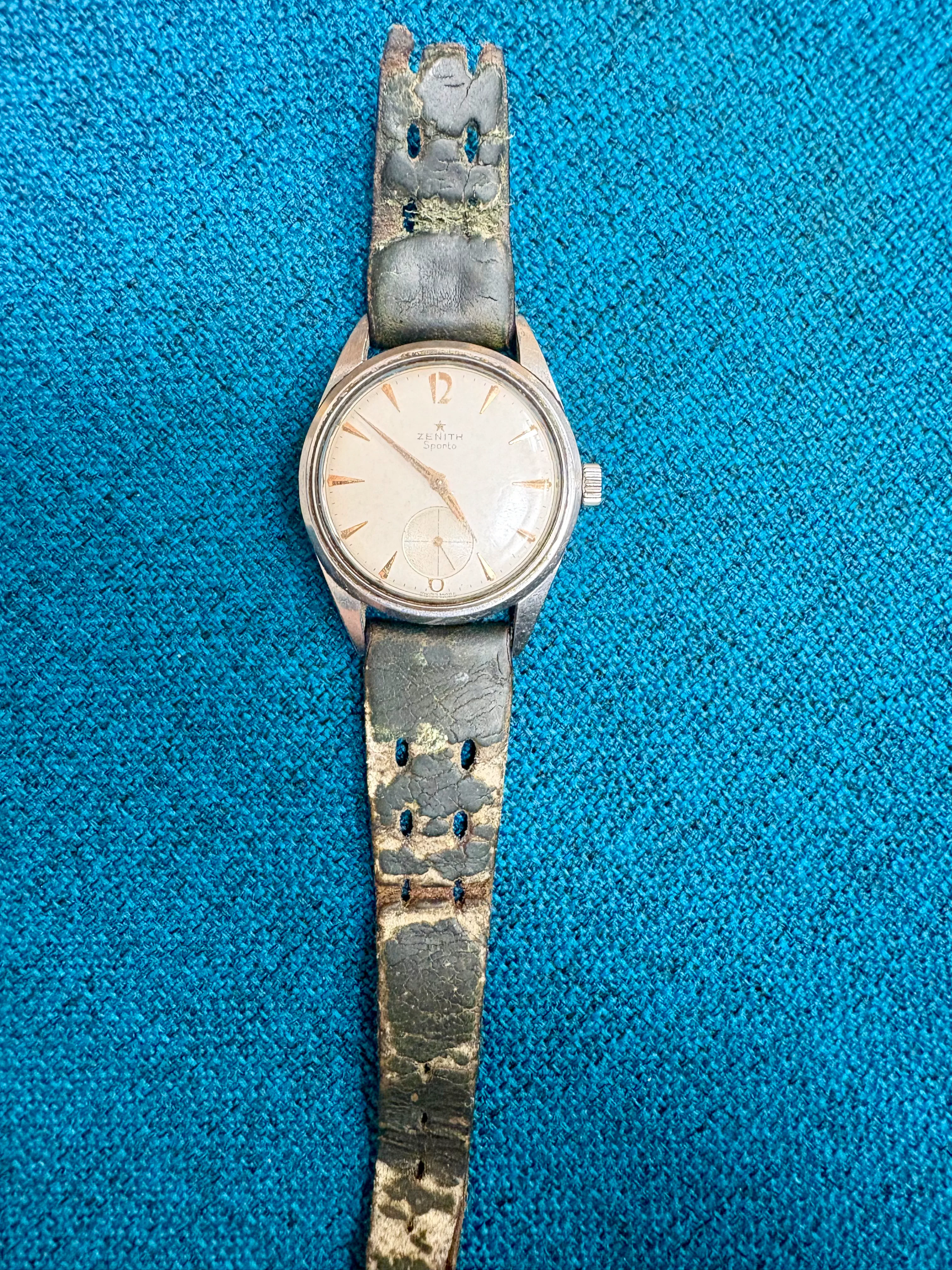 I came a cross this beauty from late 1950s (I think) today. Haven't opened up the caseback yet, but I believe it should house Zenith Cal 40 or 126-6. According to seller it's been in their family since the purchase, of which last 23-ish years in a box at the attic. Didn't measure it yet to confirm, but I think it's the XL (36mm) version of Zenith Sporto.