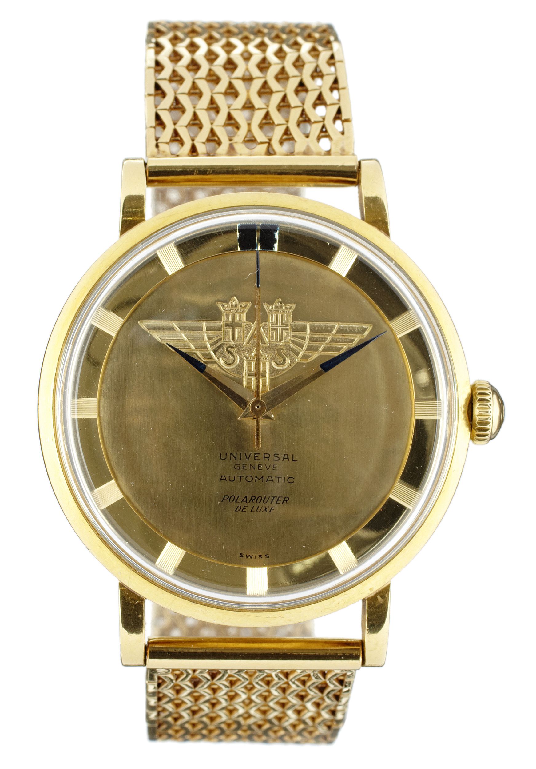 UNIVERSAL, Polar Outer De Luxe, automatic men's watches, 1954-55, marked in the works / dial / case, white works caliber 138 SS, bumper automatic, 17 jewels, gold colored dial with SAS logo, gilt numbers ring with dash, center seconds hand, case and bracelet with gold 18k, 36 mm diameter, total weight 78 g, the SAS original case; works, bracelet not original