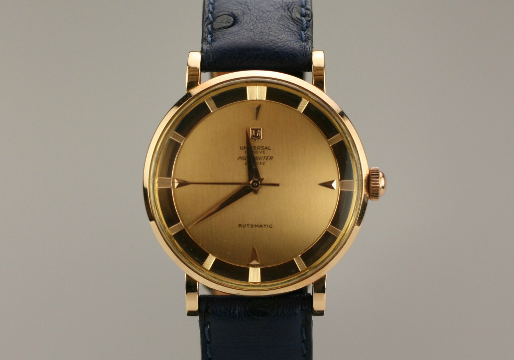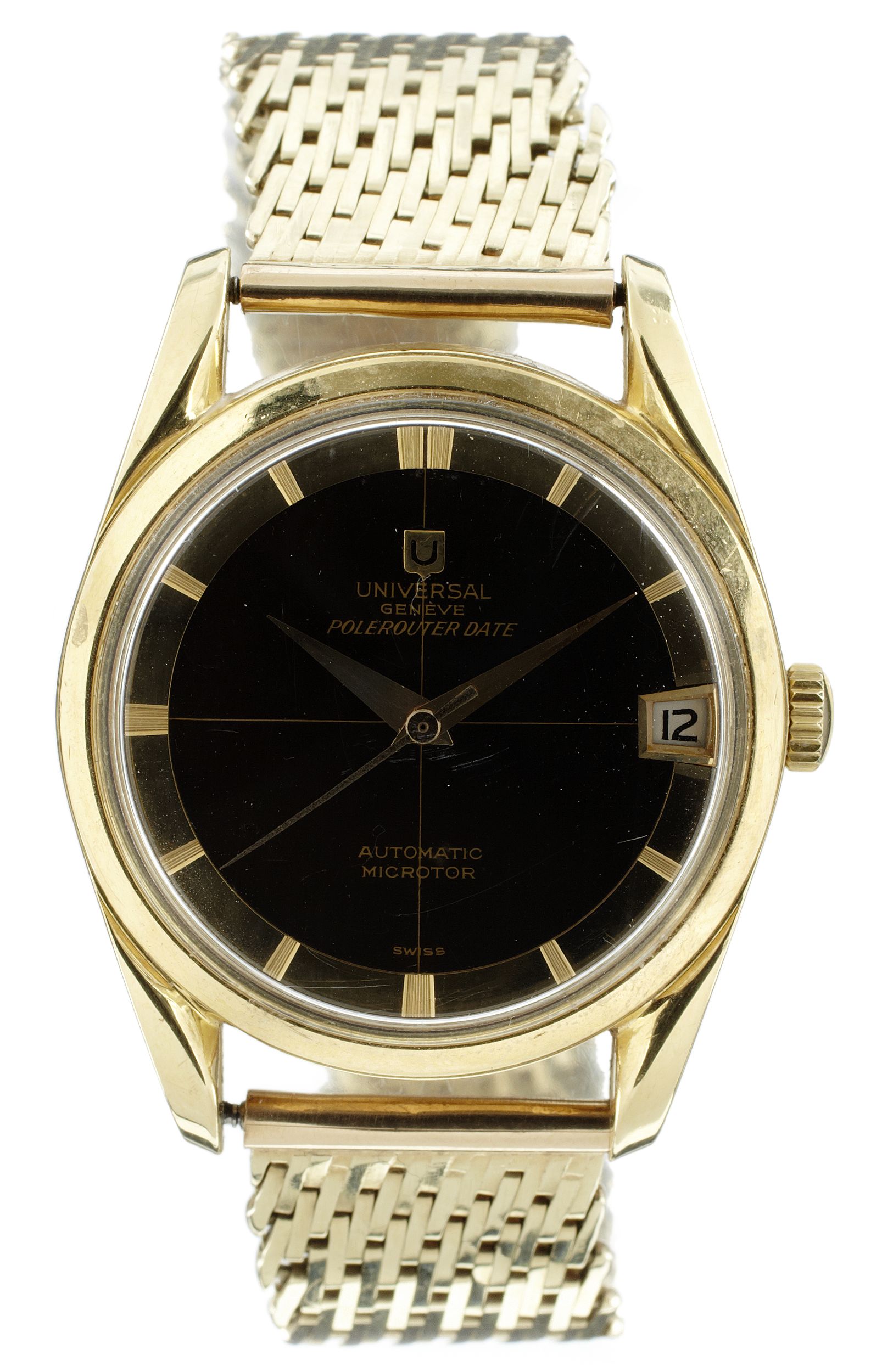 UNIVERSAL, Pole Router Date, automatic men's watches, 1958-61, marked in the works / dial / case, white works caliber 215-1, microtor, 28 jewels, black dial with gold numbers ring with dash, center seconds hand, aperture for the date, case and bracelet of 18k gold, diameter 34 mm, total weight 83 g; works, the bracelet with little damage