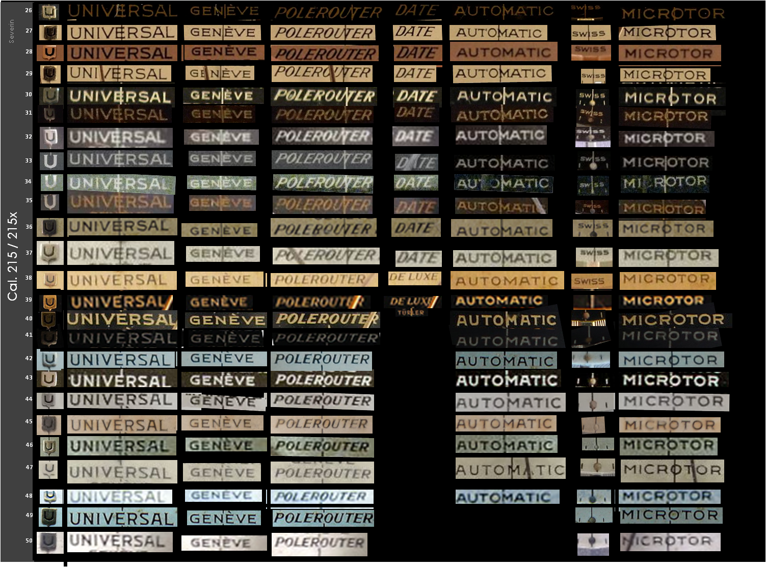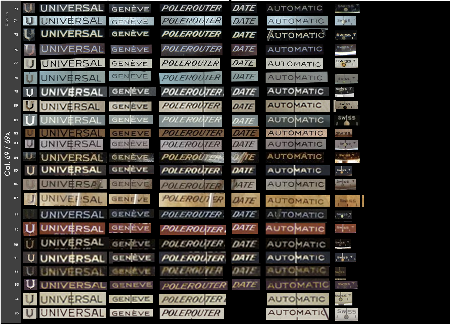 With the exception of logos/shields and the words “Swiss” or “Swiss T”, each row is more or less to scale with itself. I say “more or less” because many of the donor photos were taken from angles - this means that the internal scale-relativity of each row should be taken with some degree of salt. While I’ve tried to catch only what I suspect to be “unrestored” dials (especially difficult for me in the area of bumper models), I cannot guarantee that a redial or two did not sneak its way into the mix. Another caveat: I attributed the samples to caliber family based largely on the poster’s/seller’s own caliber identification and, where available, on my own visual inspection of the movement photo. This might have introduced some error in cases where the poster mis-identified a movement which I was unable to verify - if at all an issue, I expect it would be mostly (if not entirely) between the Cal. 218 and 69 families as their dials look very similar.
