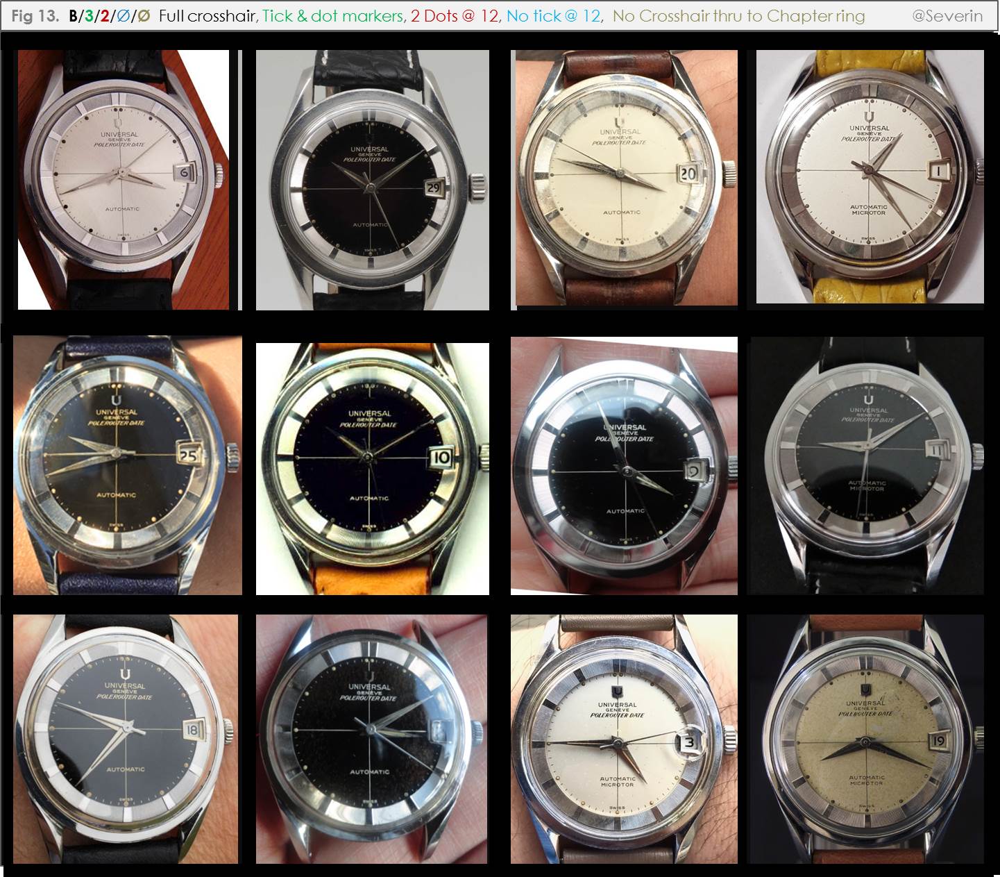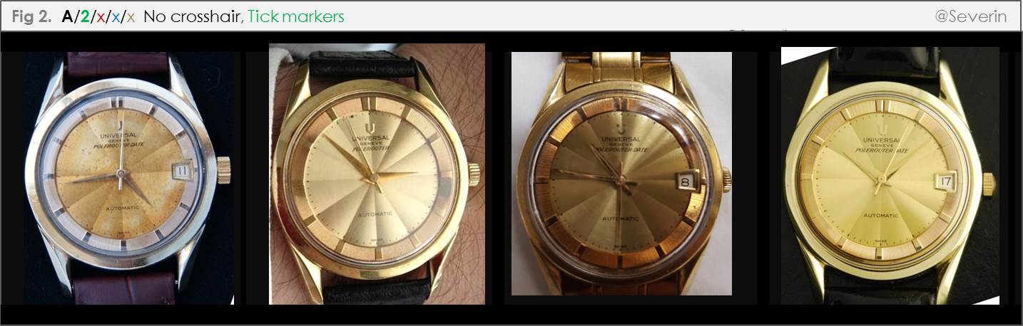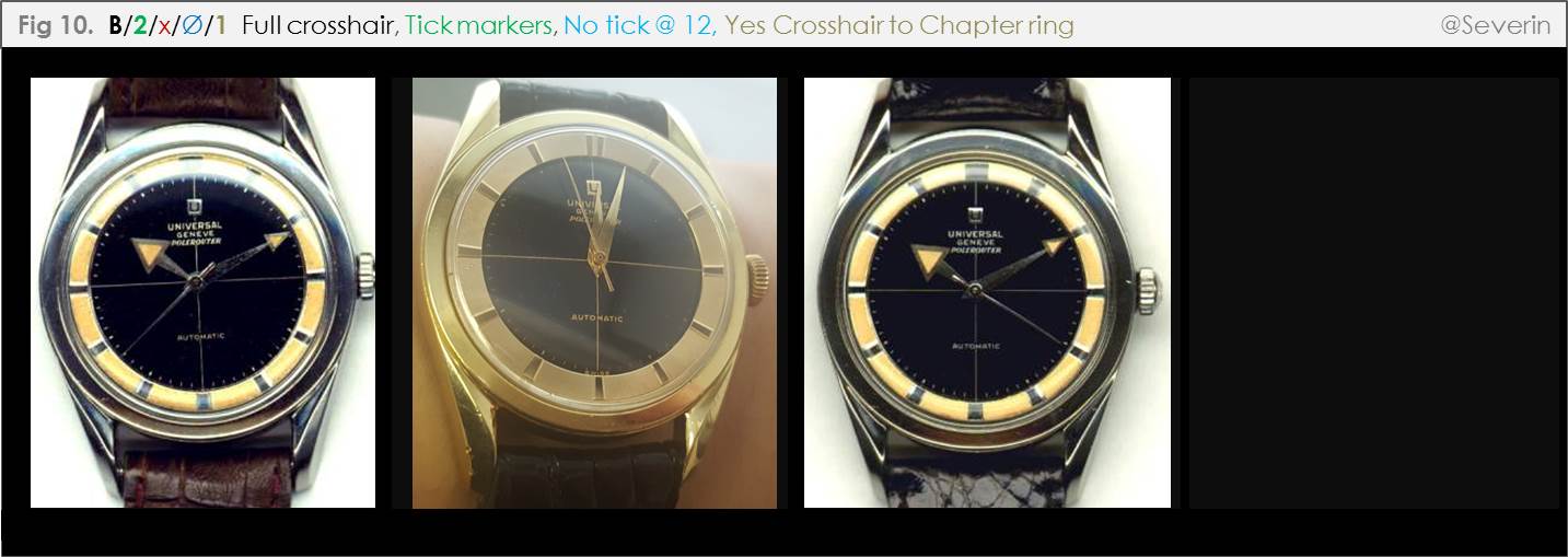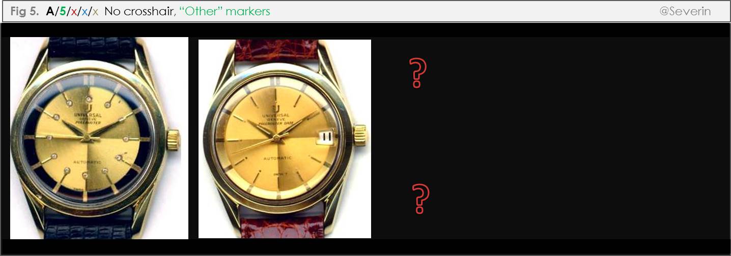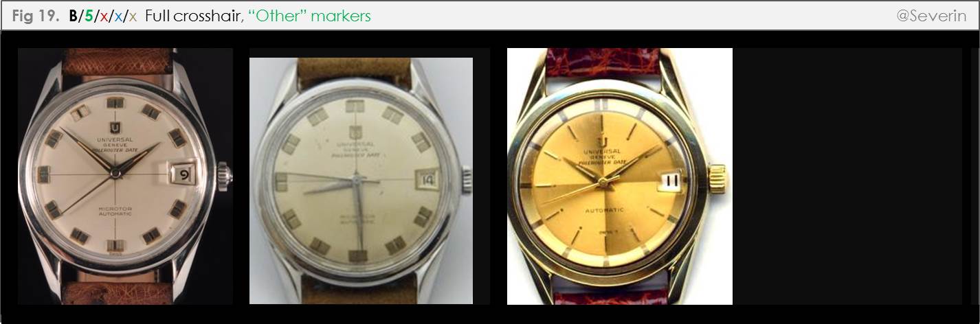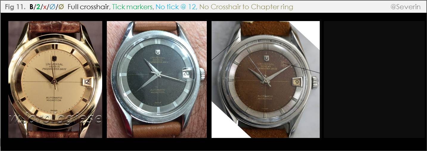 It will be seen that I have labelled relevant branches above with either a letter or number. For example, Dials with no crosshairs are labelled “A”, dials with a full crosshair are labelled “B”, dials with a partial crosshair are labelled “C”. The absence of markers is denoted as a zero, different marker types are respectively assigned a non-zero number. Further branches are also numbered, including in reference to the number of dots at twelve, the presence or absence of a tick and crosshair at twelve, and whether the crosshair extends the full length of the dial or not. While this numbering approach is quite cumbersome, it is intended to help us cite specific “paths” in our discussion (and help identify missing paths, where applicable). I expect that we will develop a more intuitive parlance as we go along.