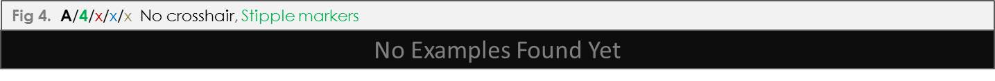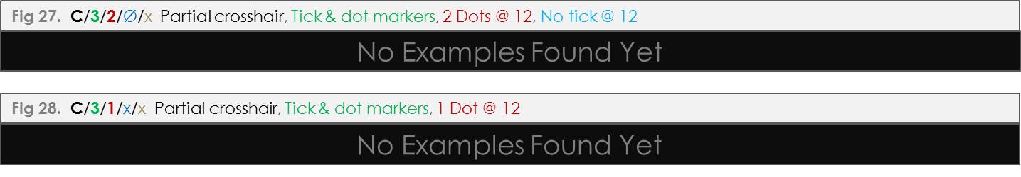and either tick markers or tick-and-dot markers with two dots at twelve, sometimes a tick overlaps the crosshair at 12, sometimes it does not