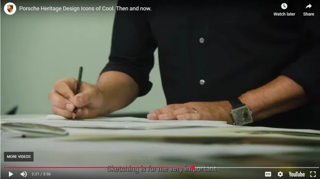 The guy in the video who does the Porsche sketches is wearing a Monaco. I believe it's the CAW211B Vintage Grey C11 re-issue.