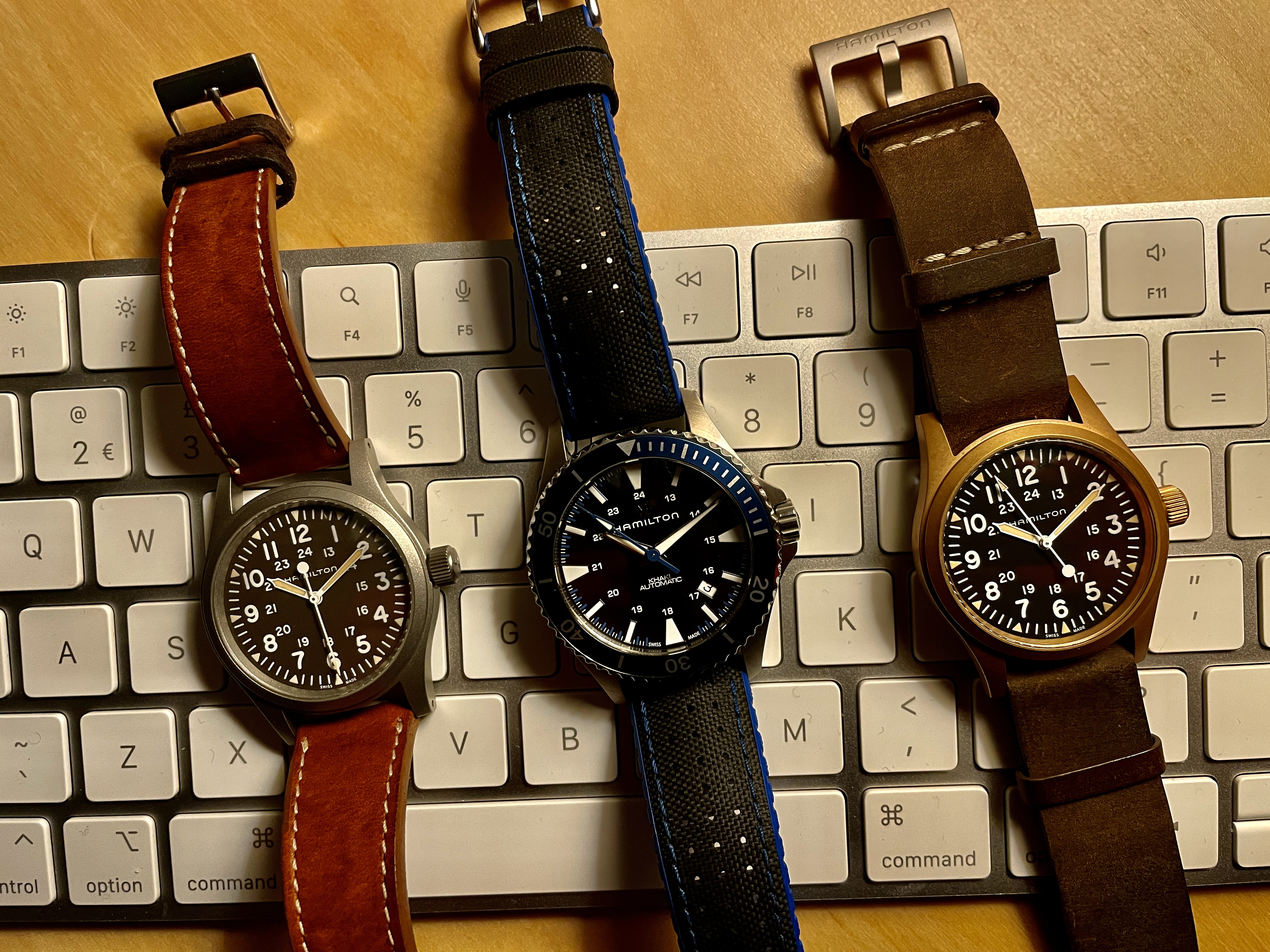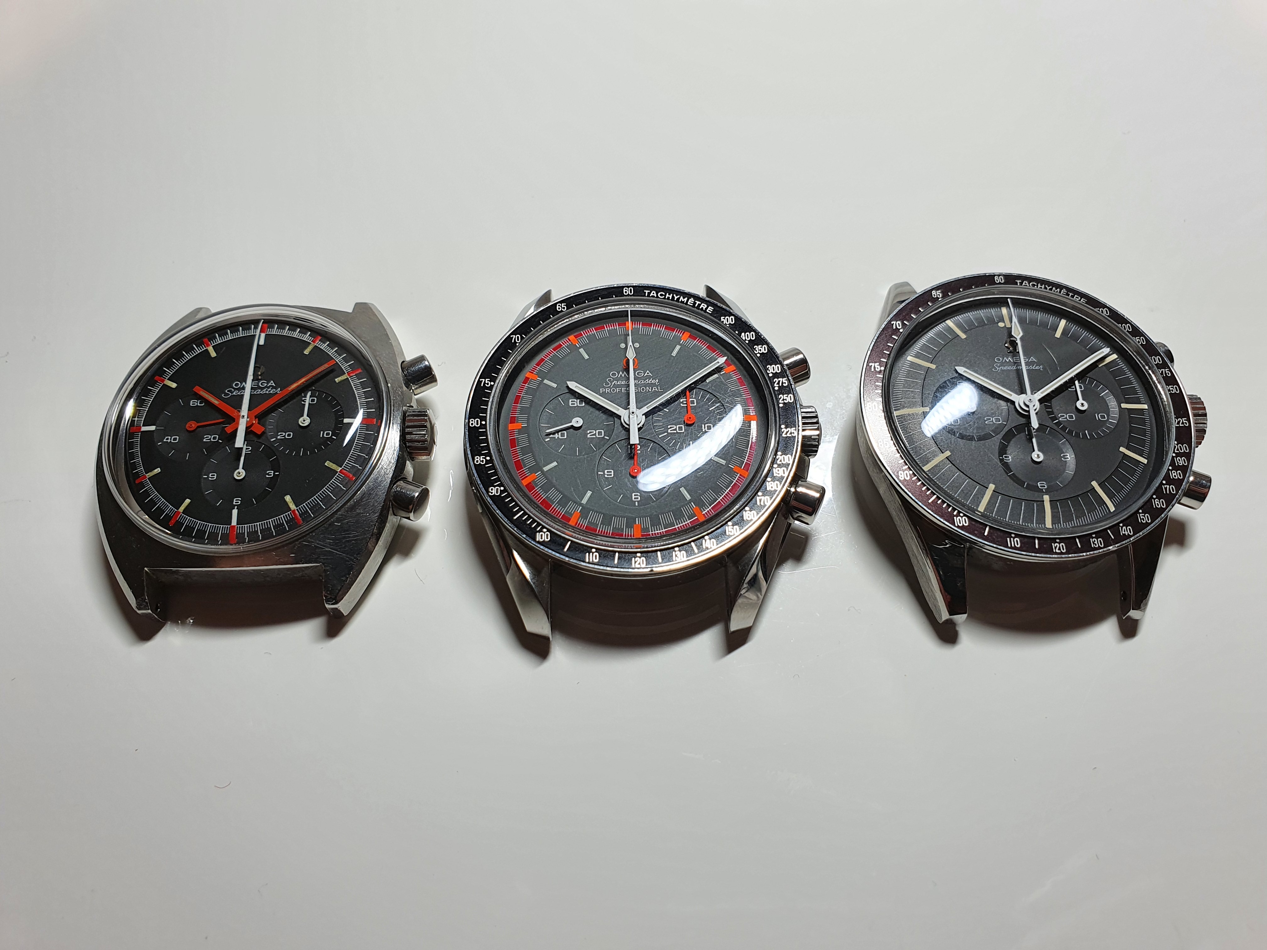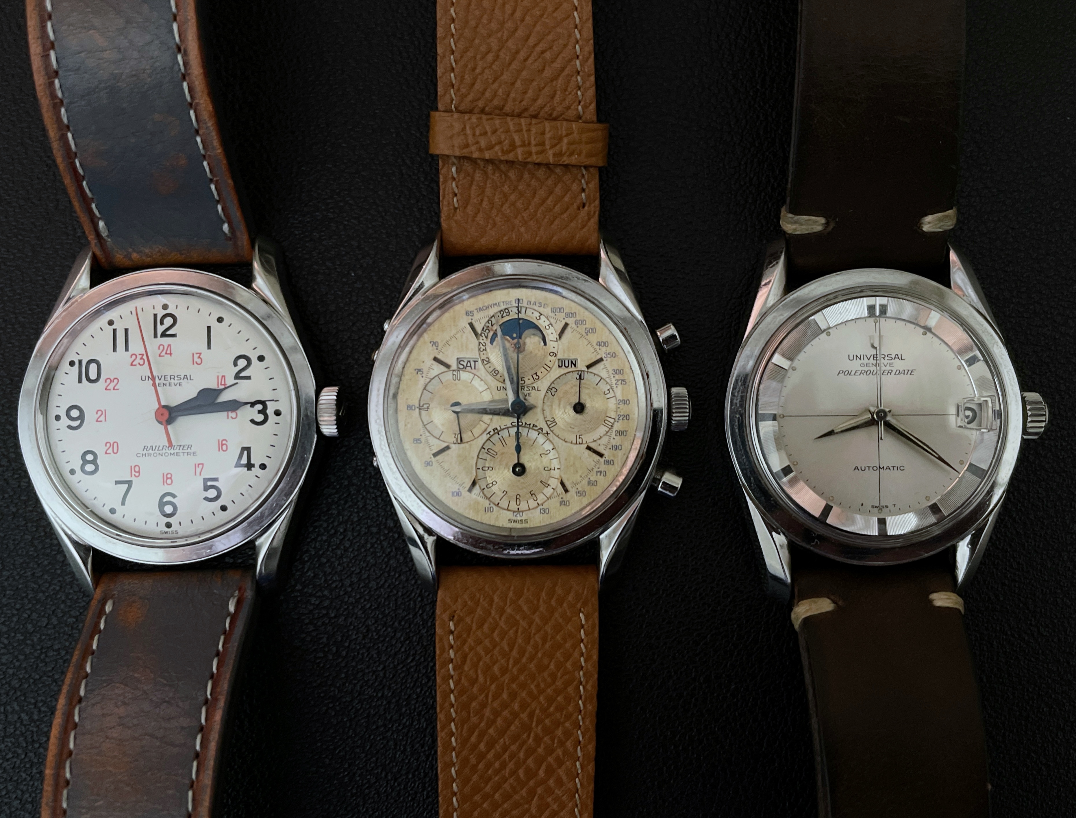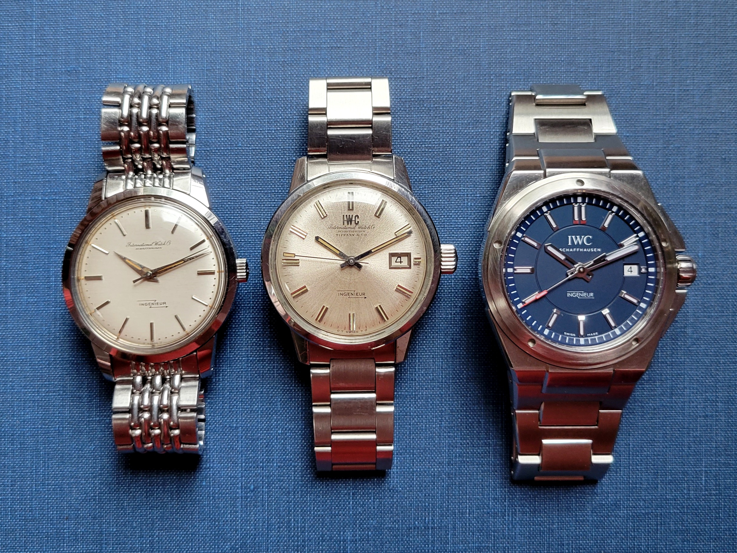 The evolution of the Ingenieur. It started with the 666 on the left and then moved to the 866 in the middle, which had a slightly larger case and semi-quickset date. The watch on the right is the limited edition 3239-09. It features a blue dial created for the Laureus series. There are a few more references between the 866 and 3239 that I would like to fill in.