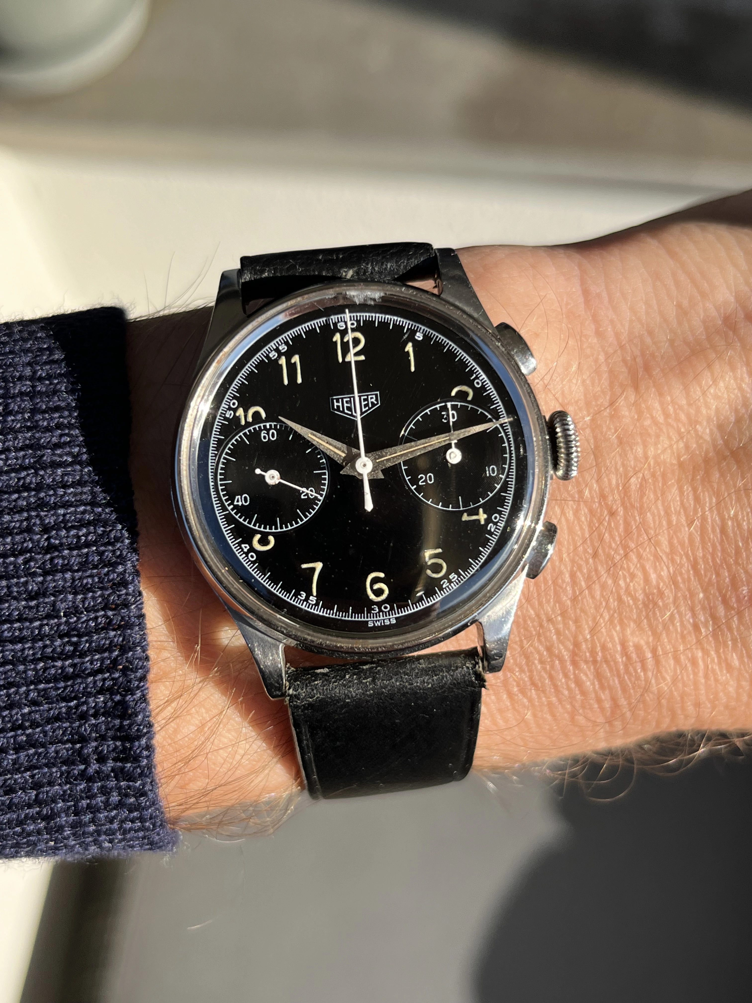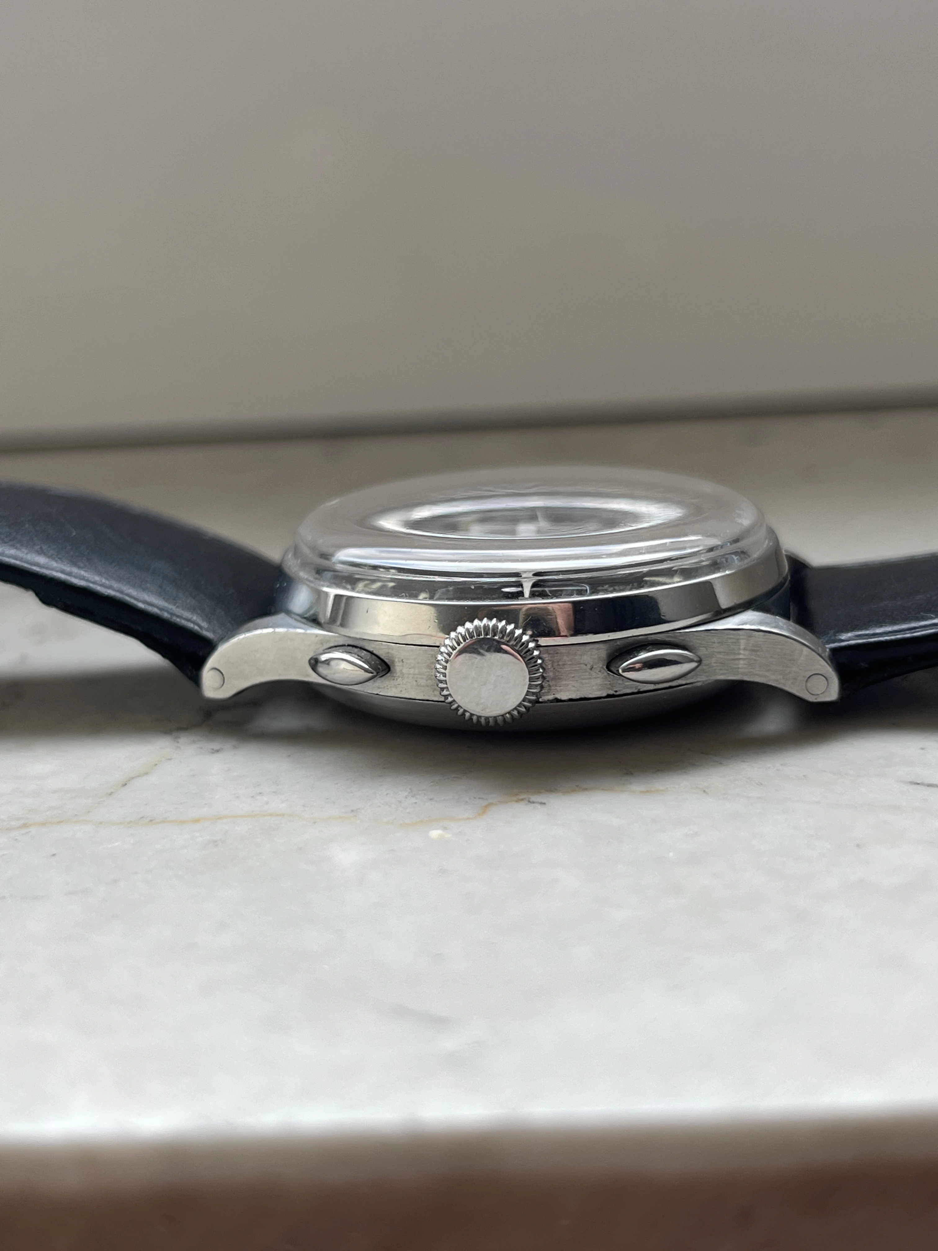 MOVEMENT: The manually-wound Valjoux 22 is a workhorse two-button chronograph movement with a bicomapax display and column wheel. The movement is clean and in full working condition.
