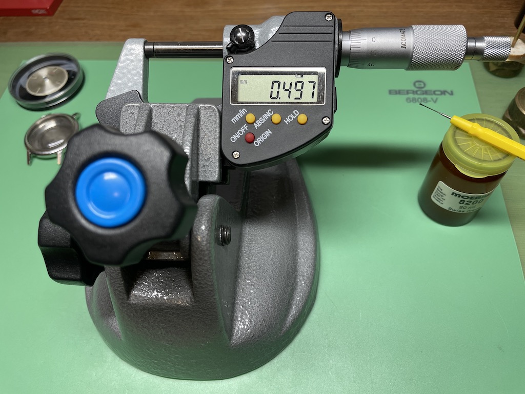 Procedure is to clean the faces of the jaws (using a very clean cloth this time), close the jaws with normal force, press a "zero" button, confirm the display says "0.00mm" and we're done.